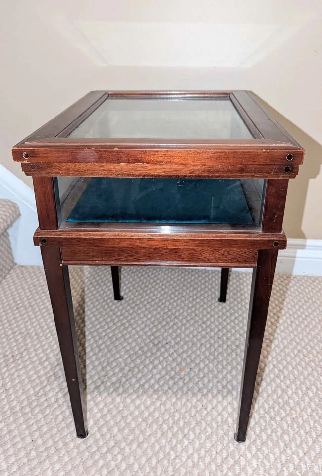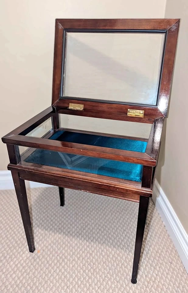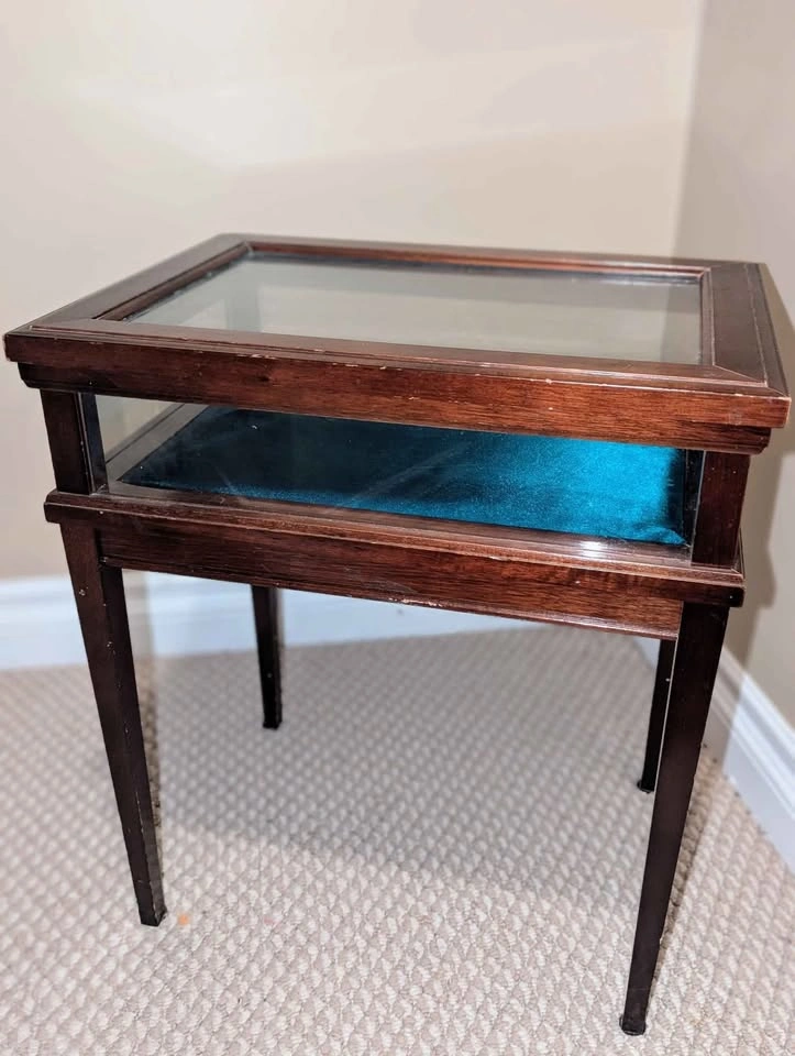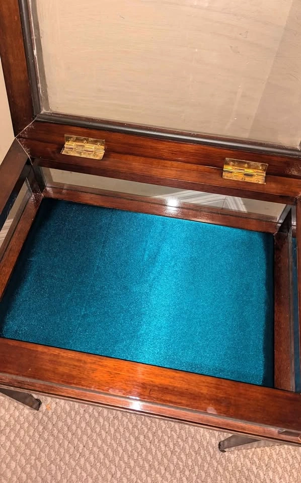 Beautiful vintage glass-top curio table made by The Bombay Co. Features clear glass on all sides with a hinged lid that opens for easy access. Perfect for displaying collectibles, jewelry, keepsakes, or small art pieces. ✨ Details: Dimensions: 18” L × 13” W × 20” H Dark wood frame with glass panels on top and sides Royal teal satin- interior (newly added, you can EASILY and quickly change this with new fabric to anything you like for a custom look!) Hinged lid with brass hardware Label: The Bombay Company – Made in Taiwan – Inspected 1986 Sturdy and elegant mid-century style Gently used with minor wear consistent with age. Makes a beautiful accent piece for your special treasures!