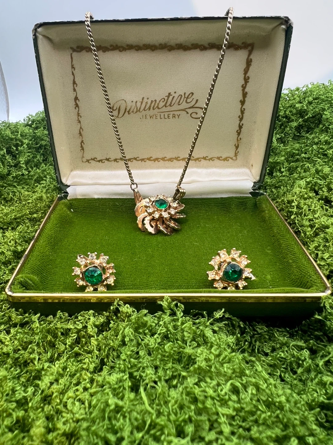 Selling a vintage jewellery set by Distinctive Jewellery. It includes a necklace and a pair of earrings with green stones. Comes in its original box!