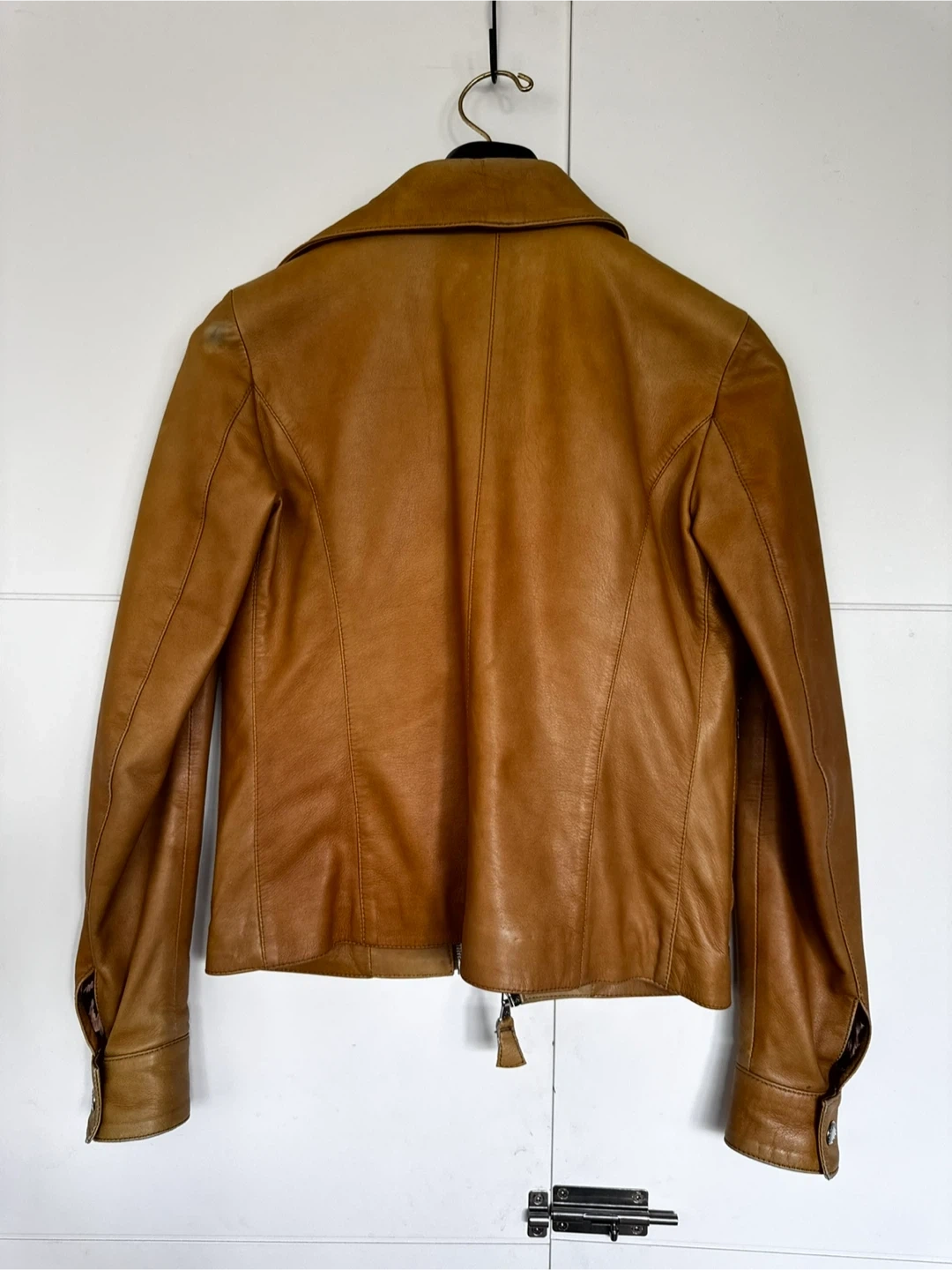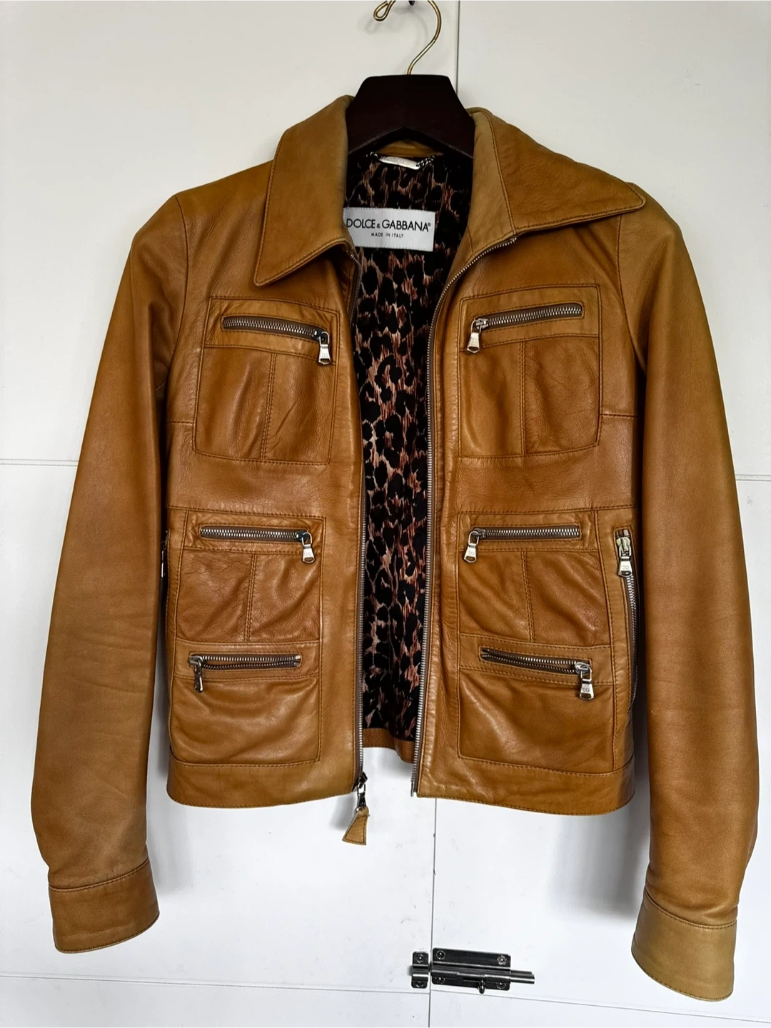 86Selling a Dolce & Gabbana leather jacket in a stylish brown colour. It has a unique leopard print lining. There is a slight mark on the sleeve, as shown in the picture.