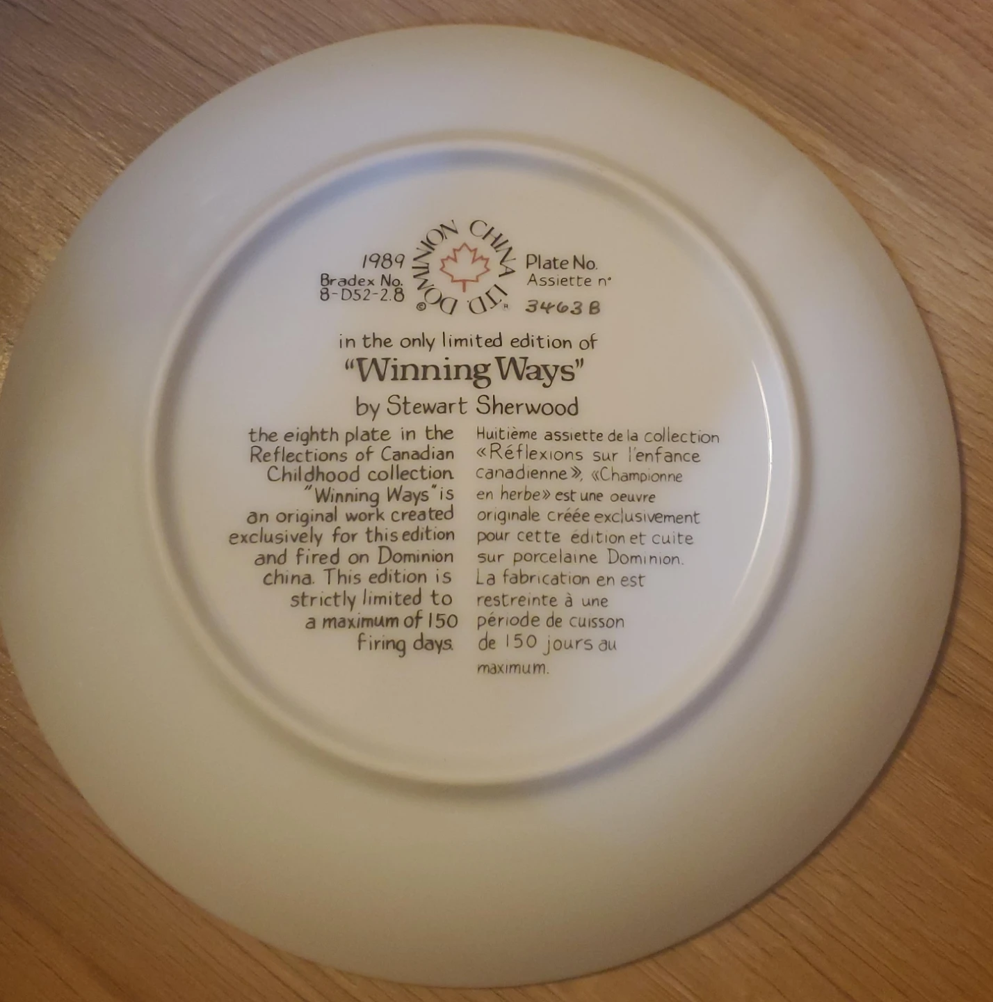 10đŸ¥•Selling a vintage Dominion China plate from the Reflections of Canadian Childhood collection. This plate is titled "Winning Ways" by Stewart Sherwood and is the eighth plate in the series. It was created and fired on Dominion china in 1989 as part of a limited edition.