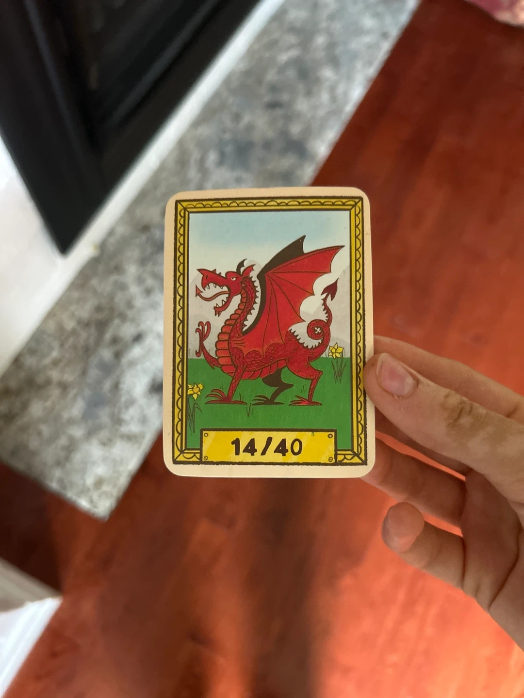 Selling a vintage card featuring a red dragon on a green field. The card is numbered 14/40. Great for collectors or anyone who loves dragons!