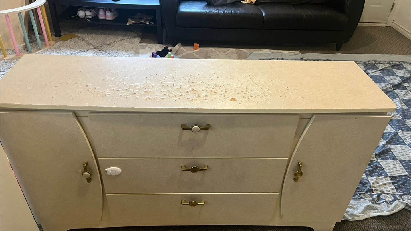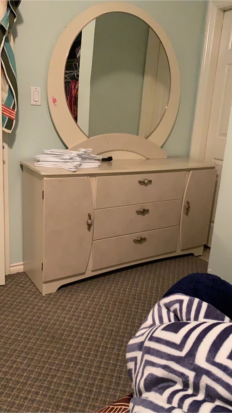 10Selling a vintage dresser with an attached mirror. It has three drawers and two side cabinets. The dresser shows some wear and tear on the top surface, as seen in the photos, but it's still a solid piece of furniture with lots of storage space