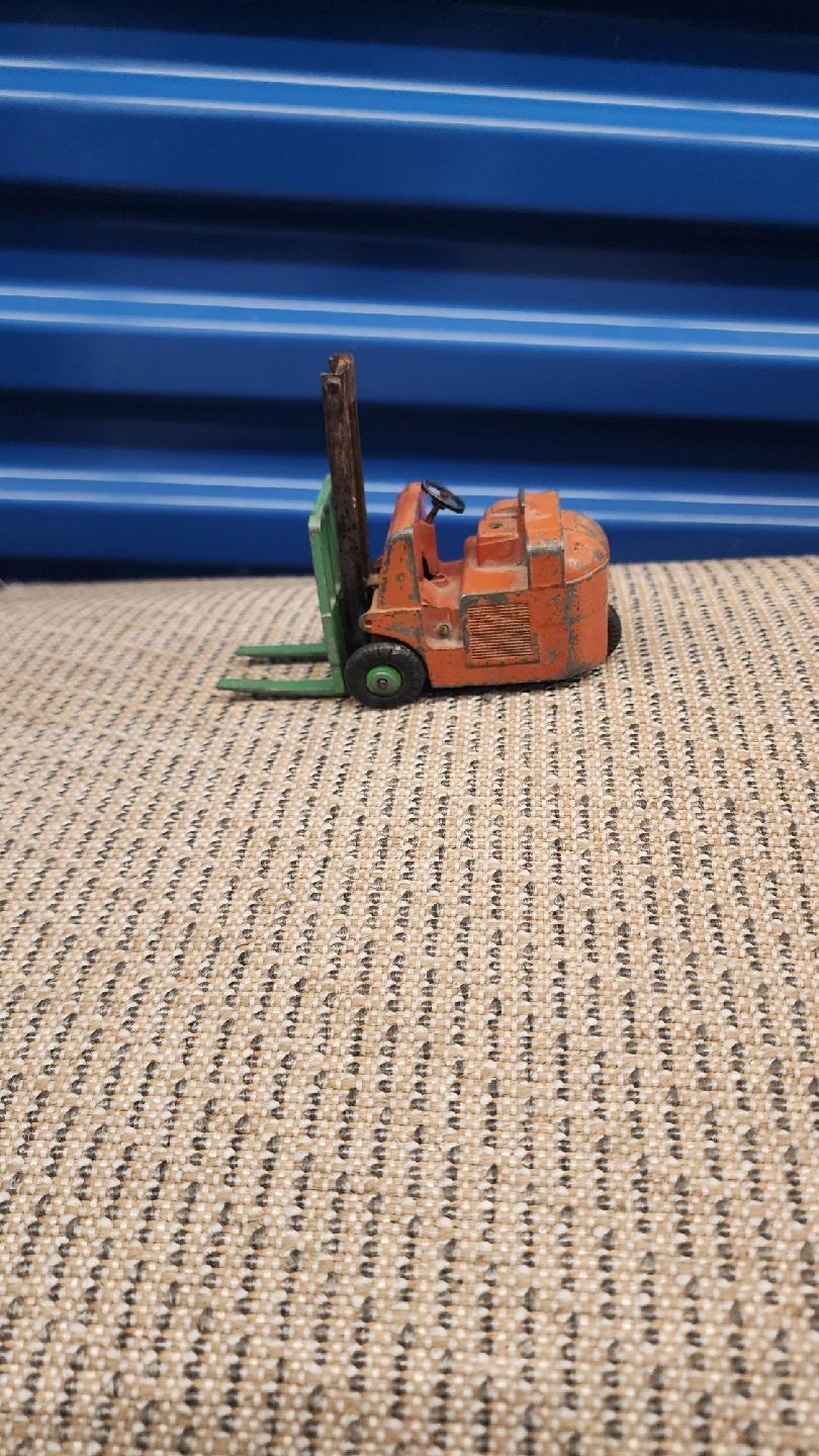 Selling a vintage toy forklift in orange. It shows signs of wear and tear, adding to its charm. A great addition to any toy collection!