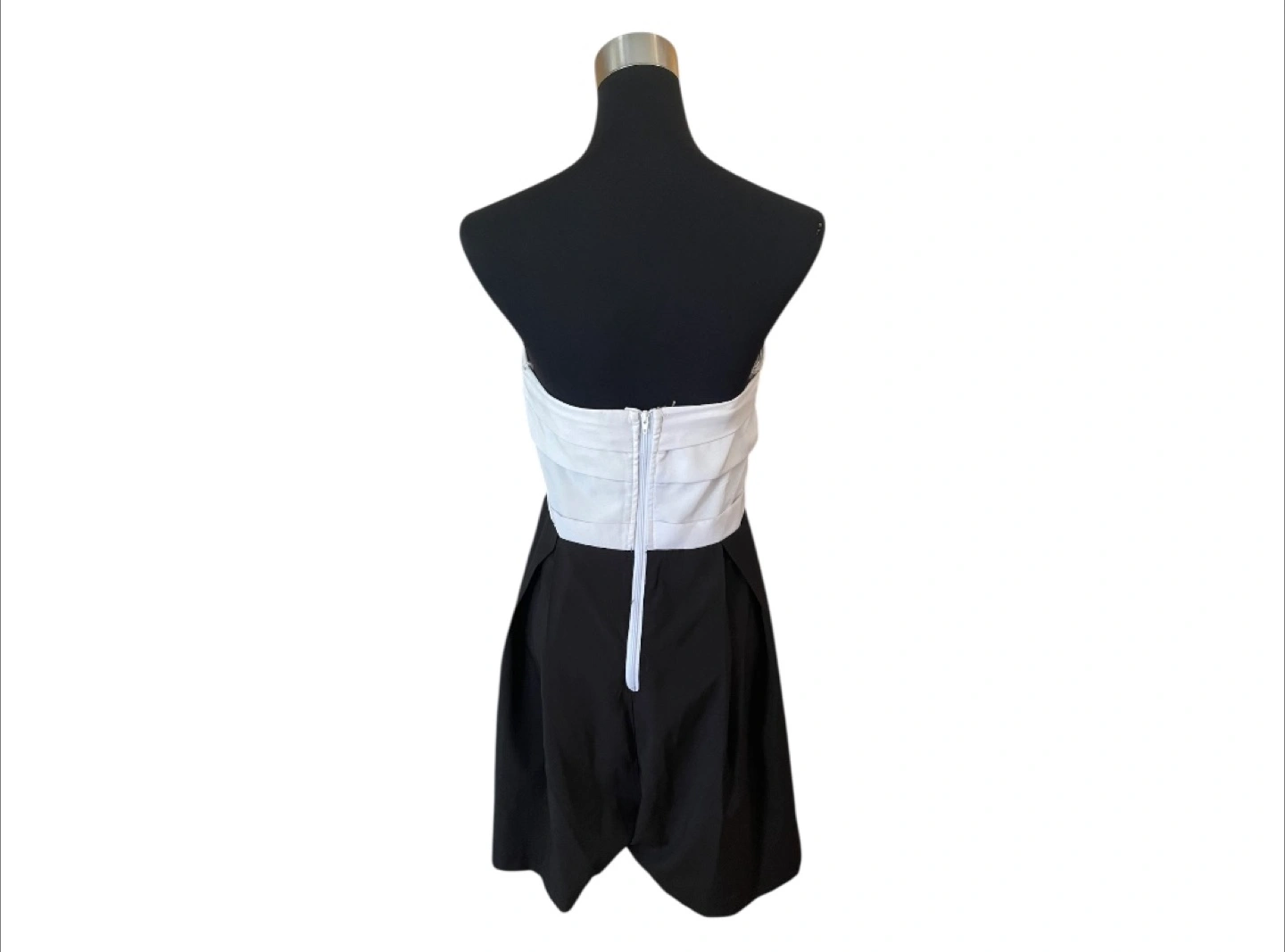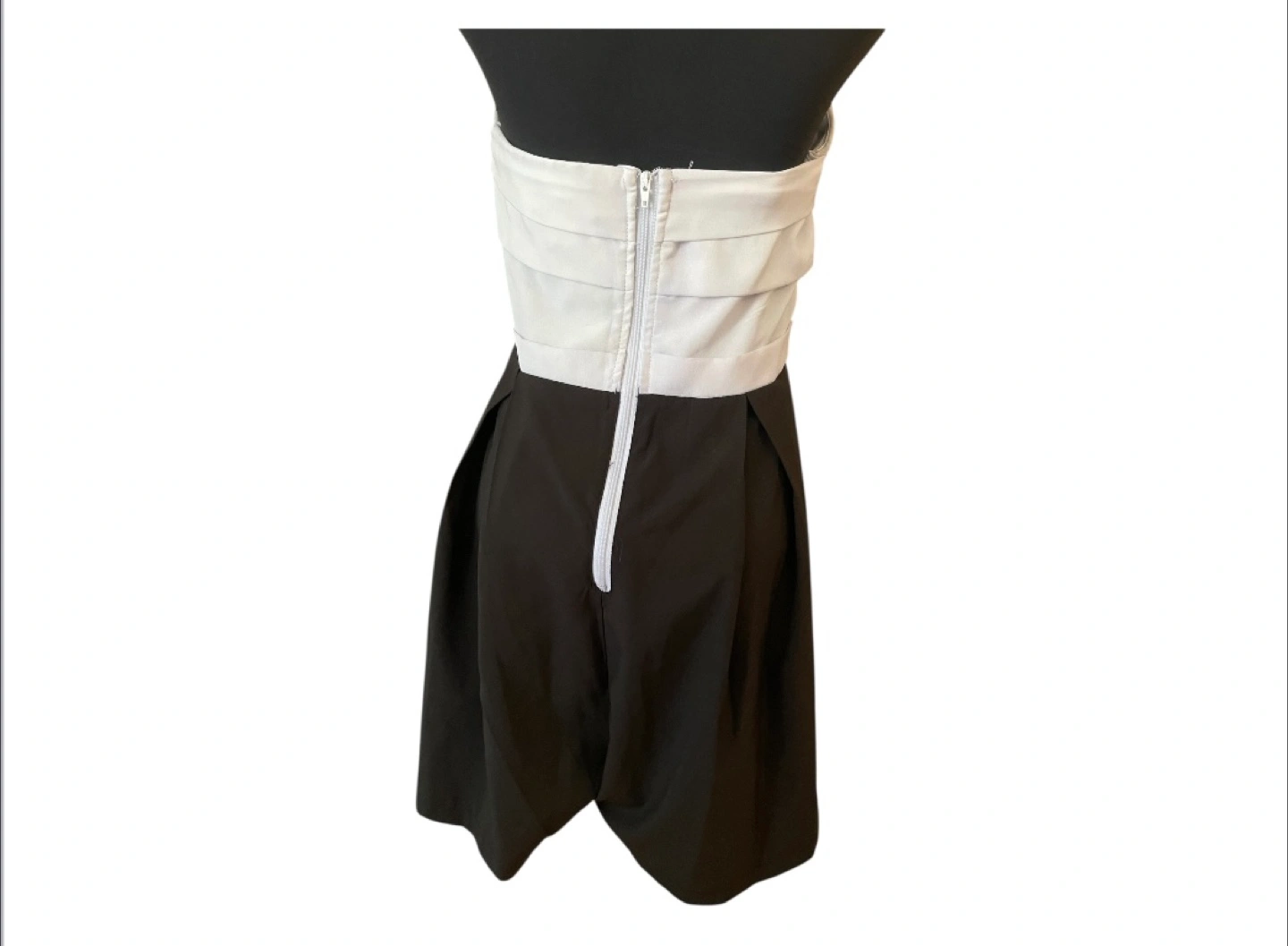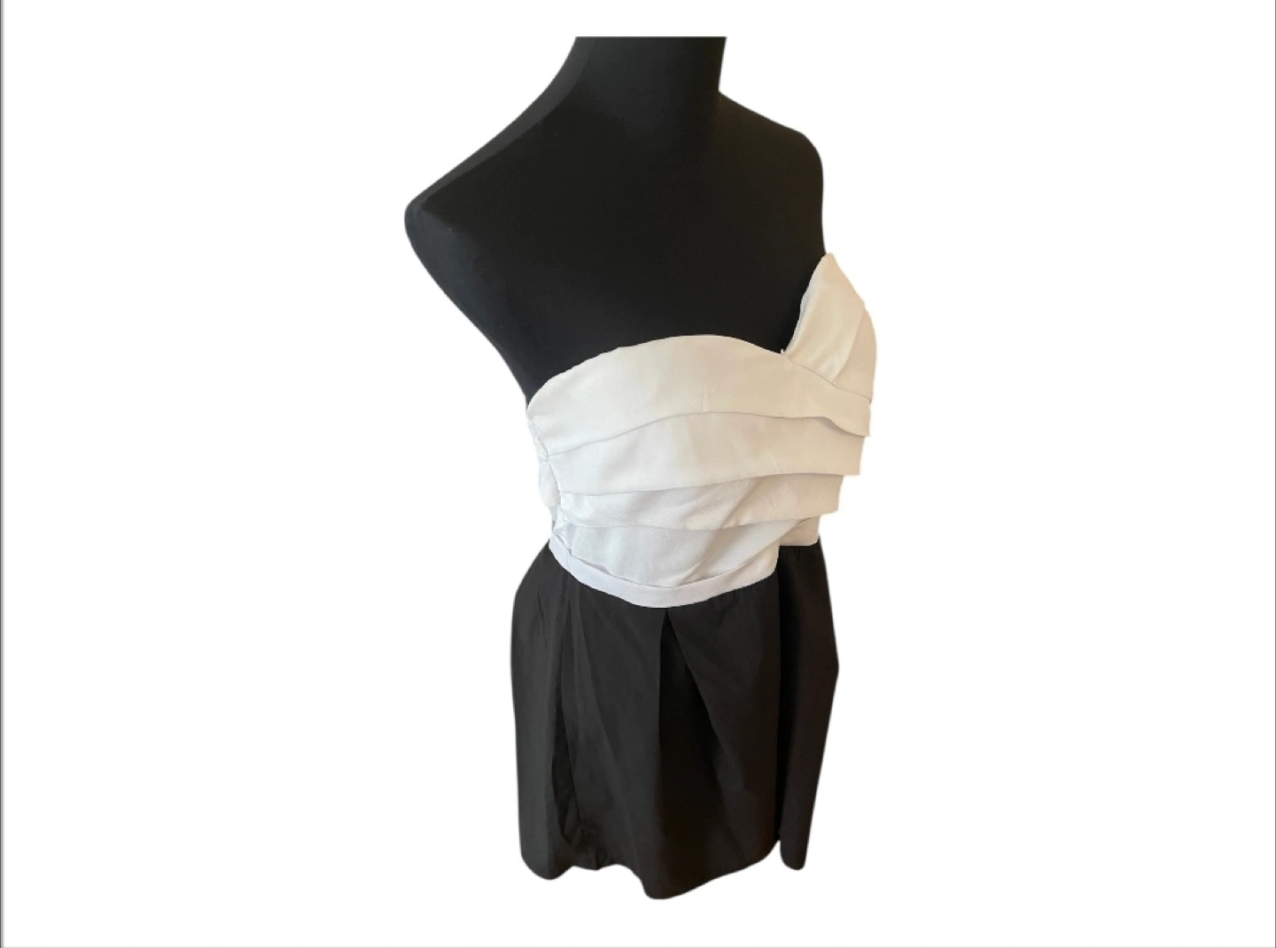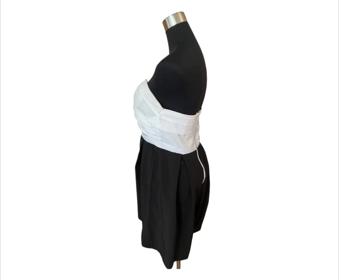 RARE Vintage Early 2000s Y2K Strapless Babydoll Romper Ruffled Details White & Black Zipper Back S/M Style Details: Designer: Seduction - a very popular 2000s Y2K label Strapless Romper - but appears as a minidress Fit: Babydoll style with sweetheart neckline collar Colour Block: White bodice top with ruffled long layering details & bottom black colour skirt Material: 100% polyester Closure: back zipper Playsuit Shorts: Bodycon upper body fit & flared loose fit bottoms pants Measurements (Inches): **Mannequin is overall size medium **Clothing measured on flat surface - ONLY LEFT TO RIGHT - NOT ALL AROUND CIRCUMFERENCE Tag Size: Small (Medium) Bust: 19 Waist: 15 Hips: 17 Length from shoulder to bottom hem: 27