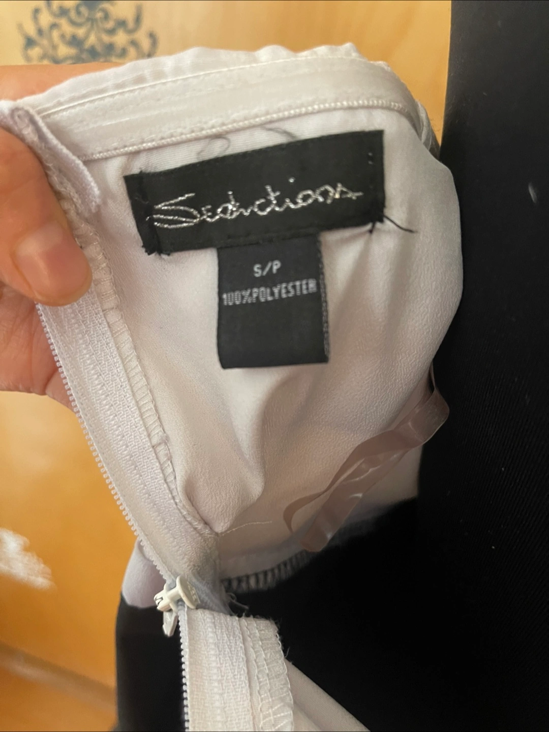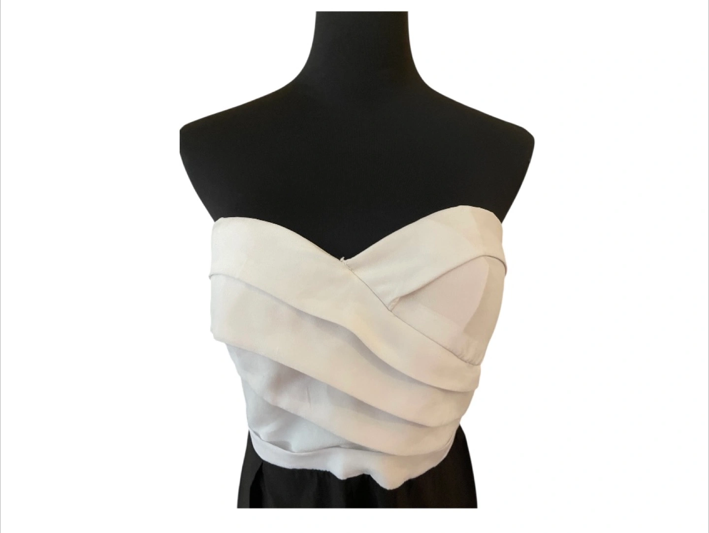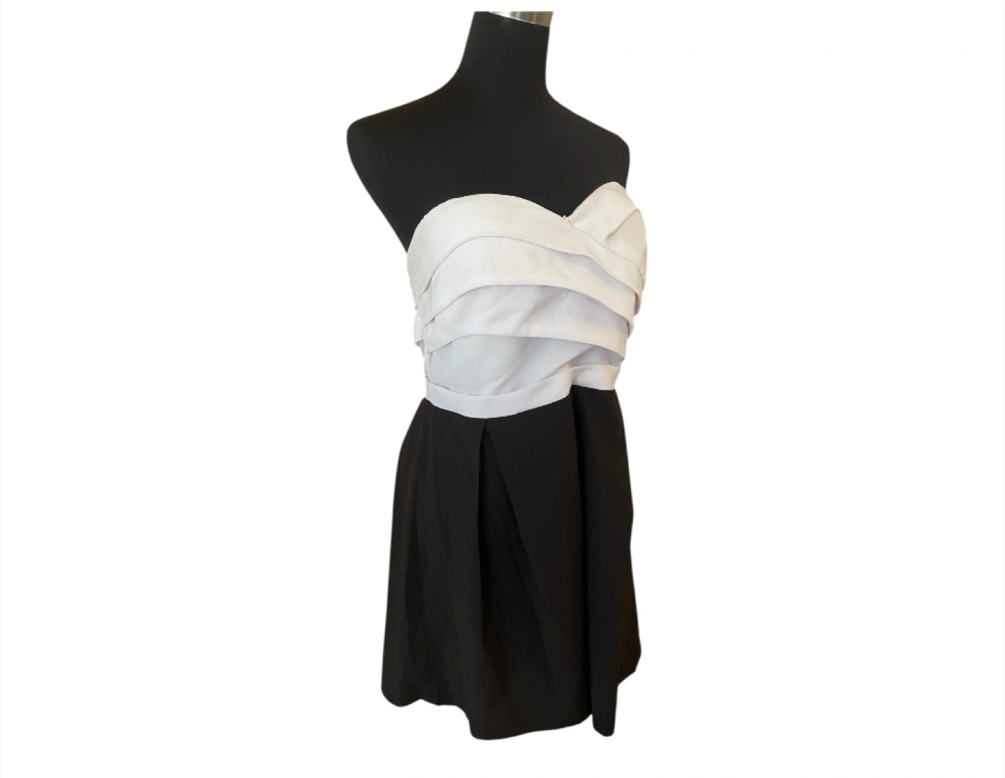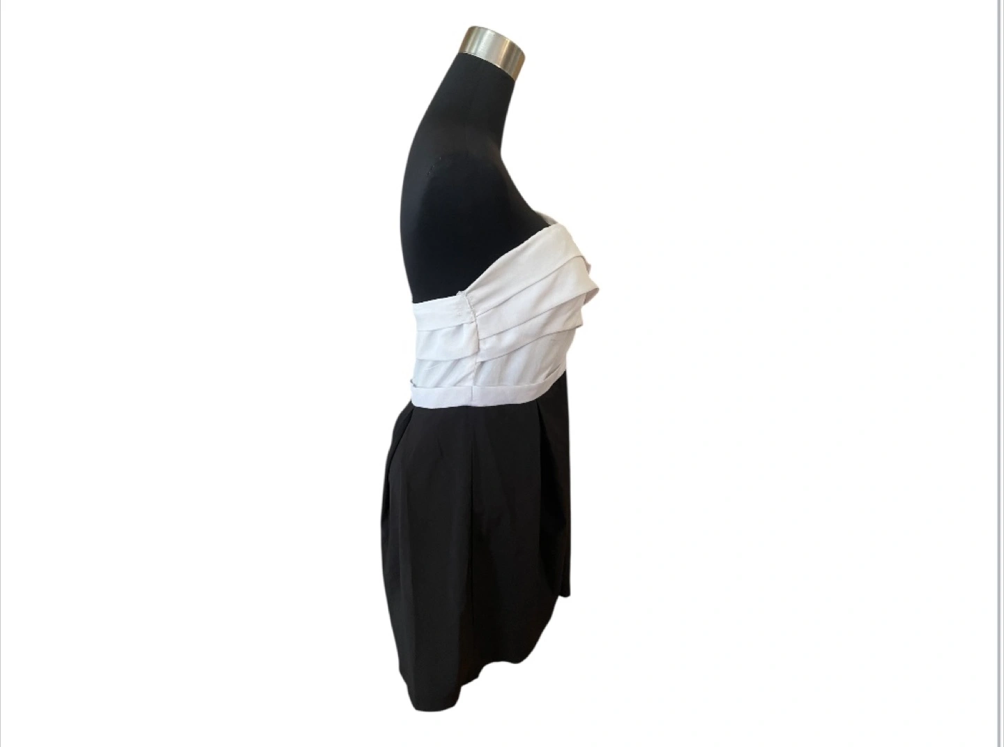 RARE Vintage Early 2000s Y2K Strapless Babydoll Romper Ruffled Details White & Black Zipper Back S/M Style Details: Designer: Seduction - a very popular 2000s Y2K label Strapless Romper - but appears as a minidress Fit: Babydoll style with sweetheart neckline collar Colour Block: White bodice top with ruffled long layering details & bottom black colour skirt Material: 100% polyester Closure: back zipper Playsuit Shorts: Bodycon upper body fit & flared loose fit bottoms pants Measurements (Inches): **Mannequin is overall size medium **Clothing measured on flat surface - ONLY LEFT TO RIGHT - NOT ALL AROUND CIRCUMFERENCE Tag Size: Small (Medium) Bust: 19 Waist: 15 Hips: 17 Length from shoulder to bottom hem: 27