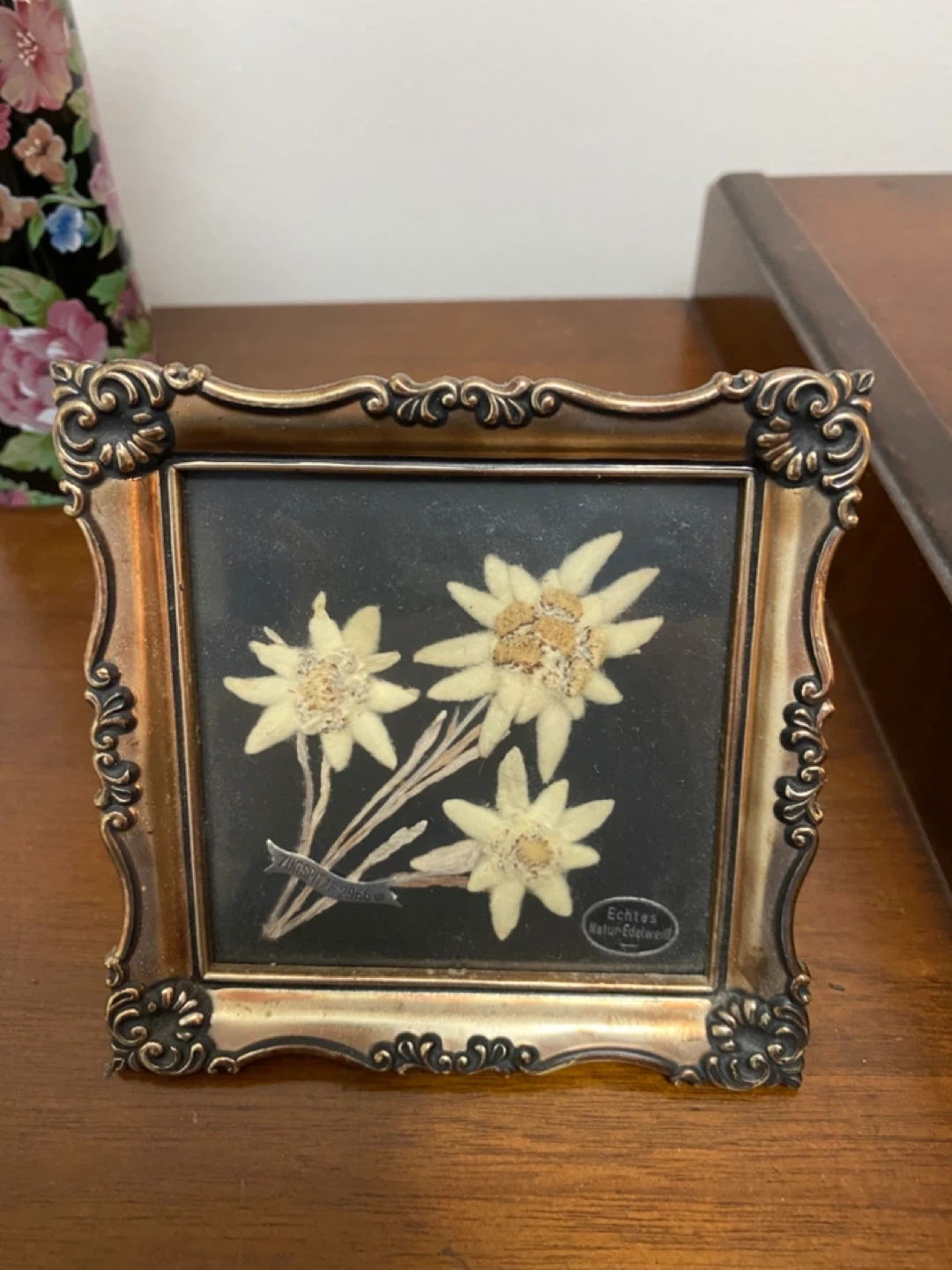 15A charming vintage framed piece featuring real dried Edelweiss flowers. The frame has an ornate, antique gold finish, adding to its unique character. Perfect for adding a touch of vintage elegance to your home decor!