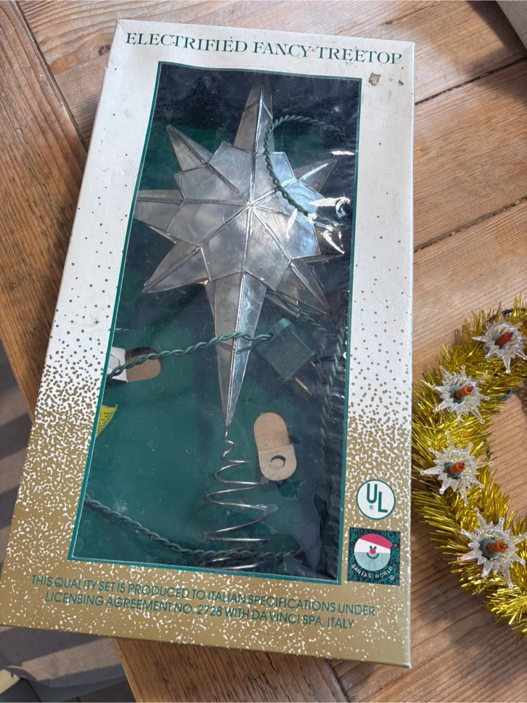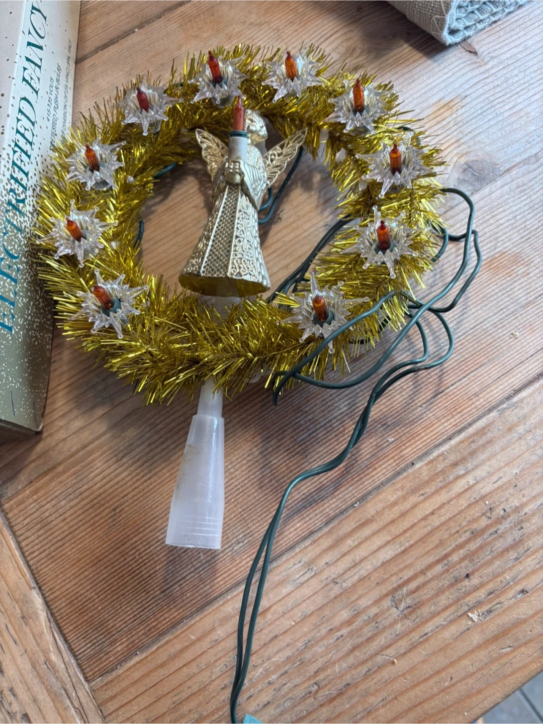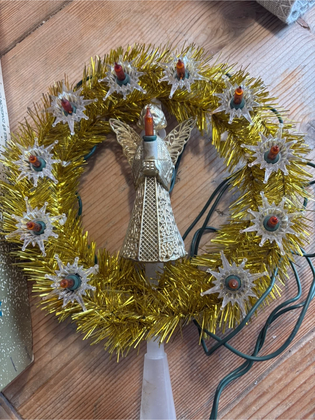Selling a vintage Electrified Fancy Treetop. It features a golden tinsel wreath with an angel in the center. The box is included! Both tree toppers need new mini light bulbs.