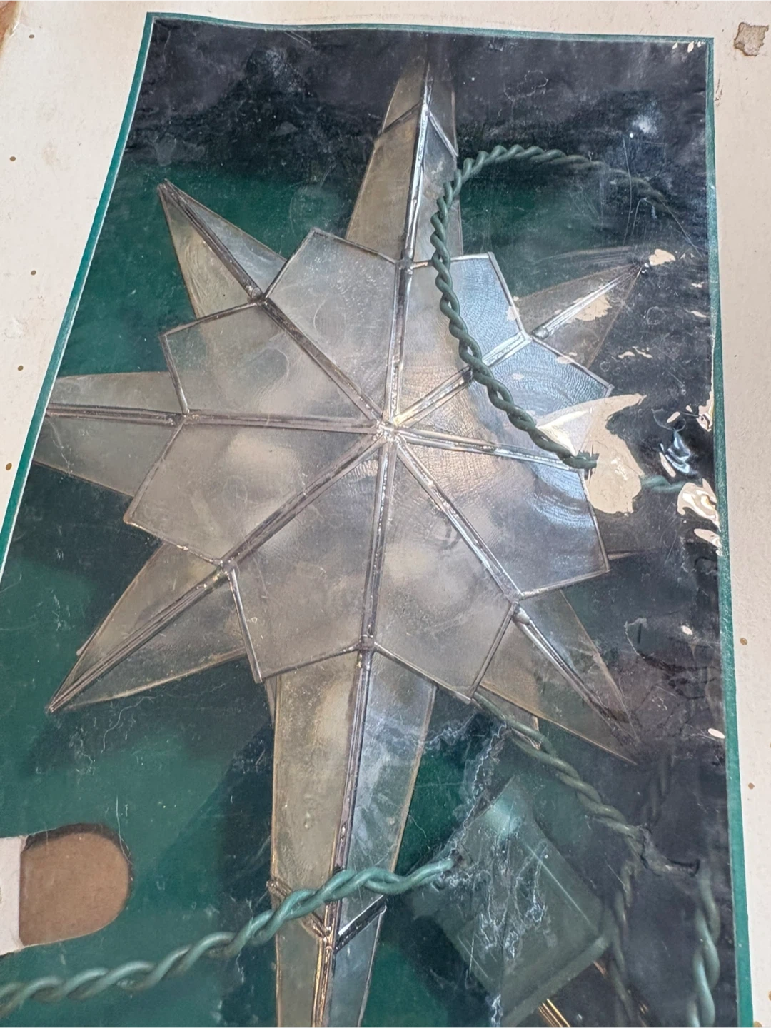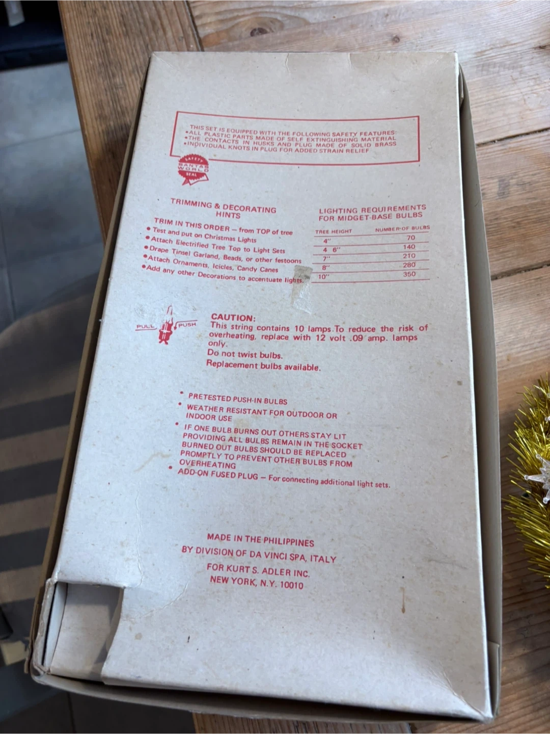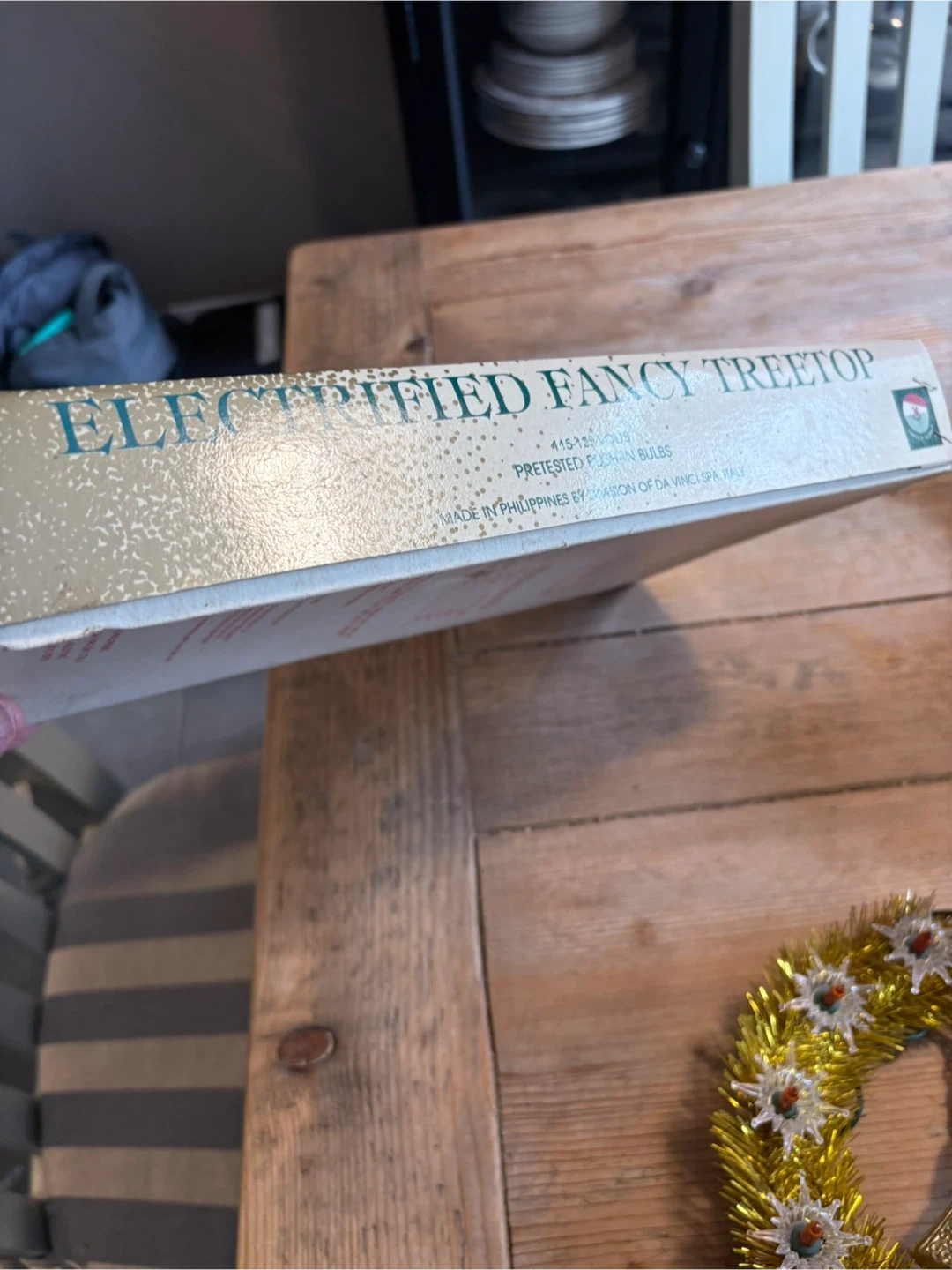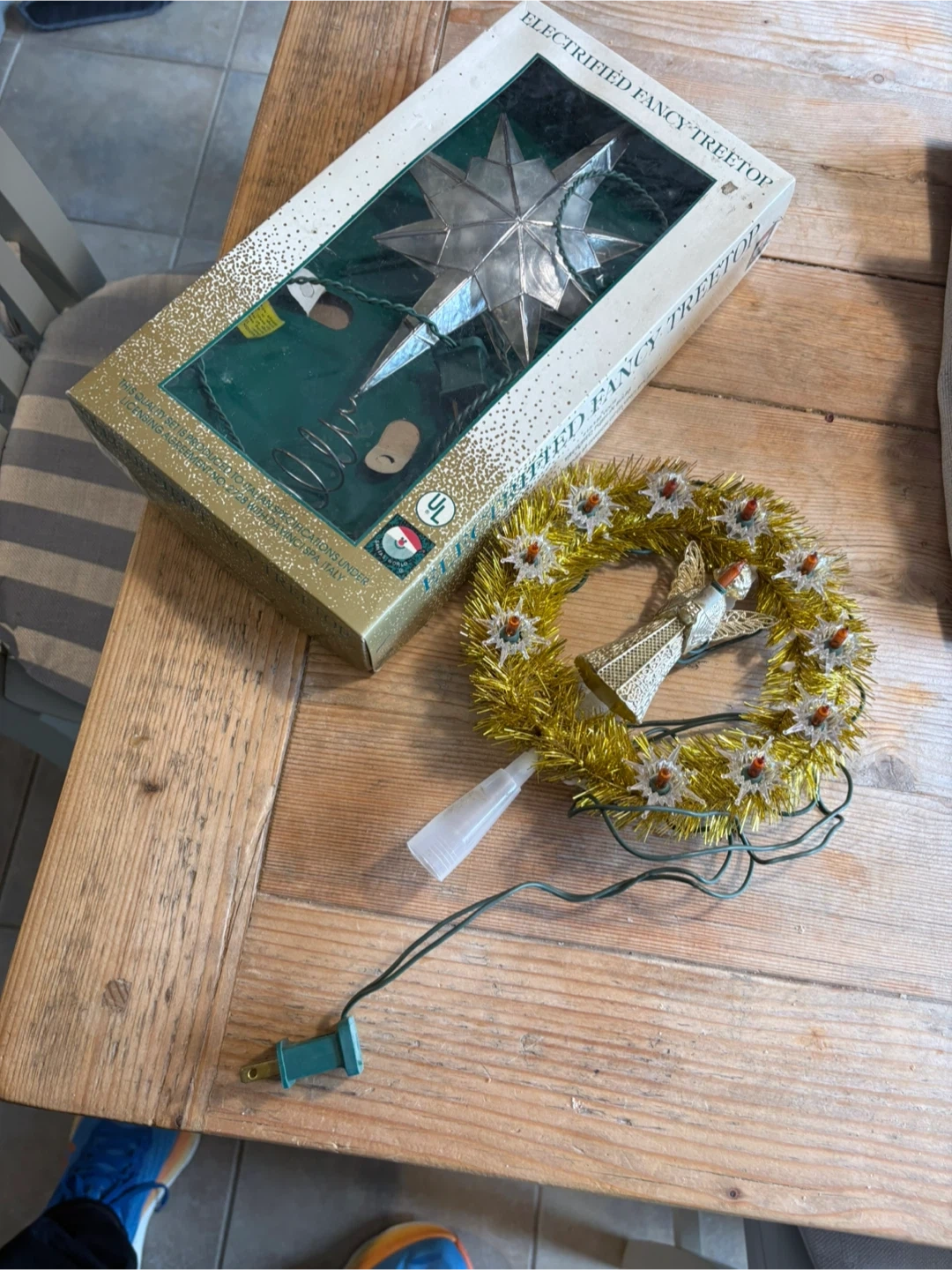 Selling a vintage Electrified Fancy Treetop. It features a golden tinsel wreath with an angel in the center. The box is included! Both tree toppers need new mini light bulbs.