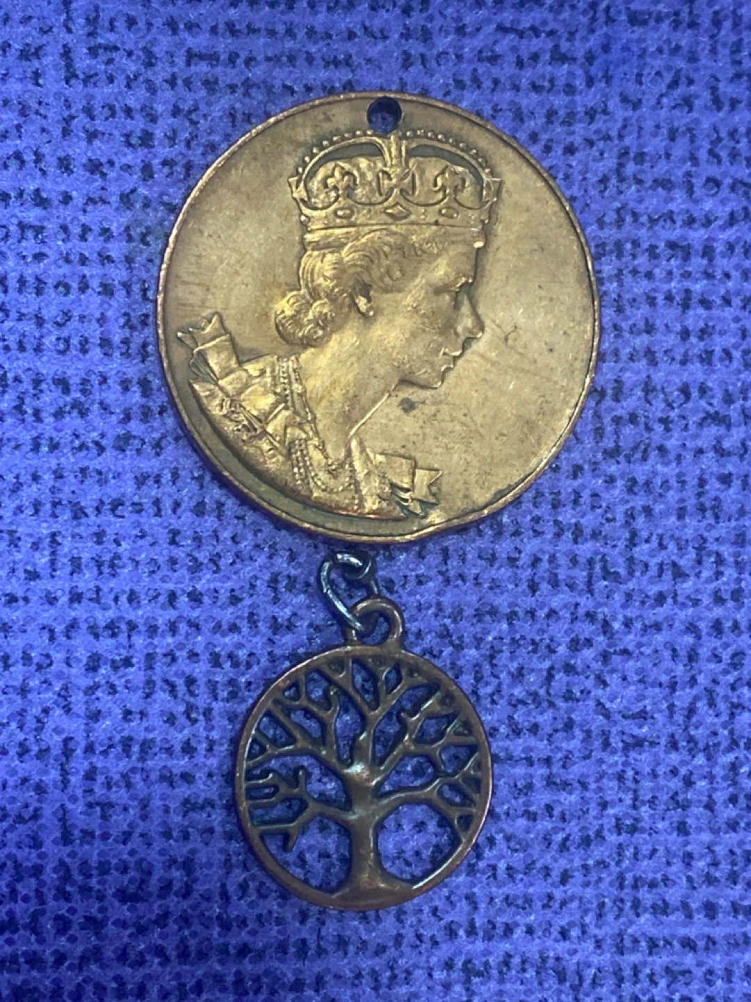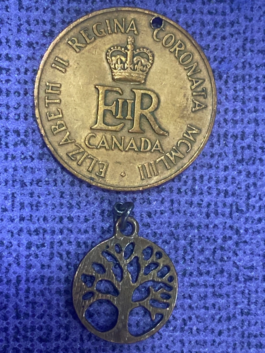 Selling a vintage Elizabeth II Canada coin pendant with a tree of life charm. The coin features Queen Elizabeth II and the words 'Elizabeth II Regina Coronata' and 'Canada MCMLIII'. The charm is a detailed tree design. Great for collectors or as a unique accessory!