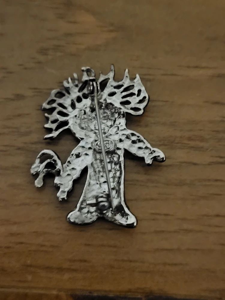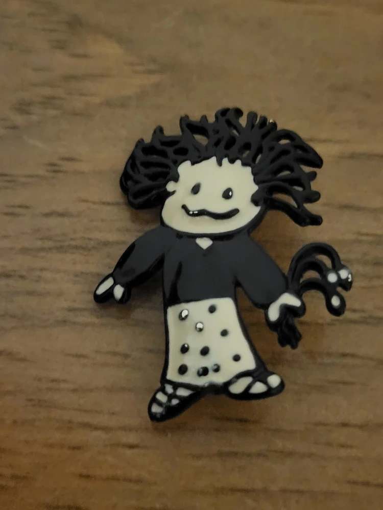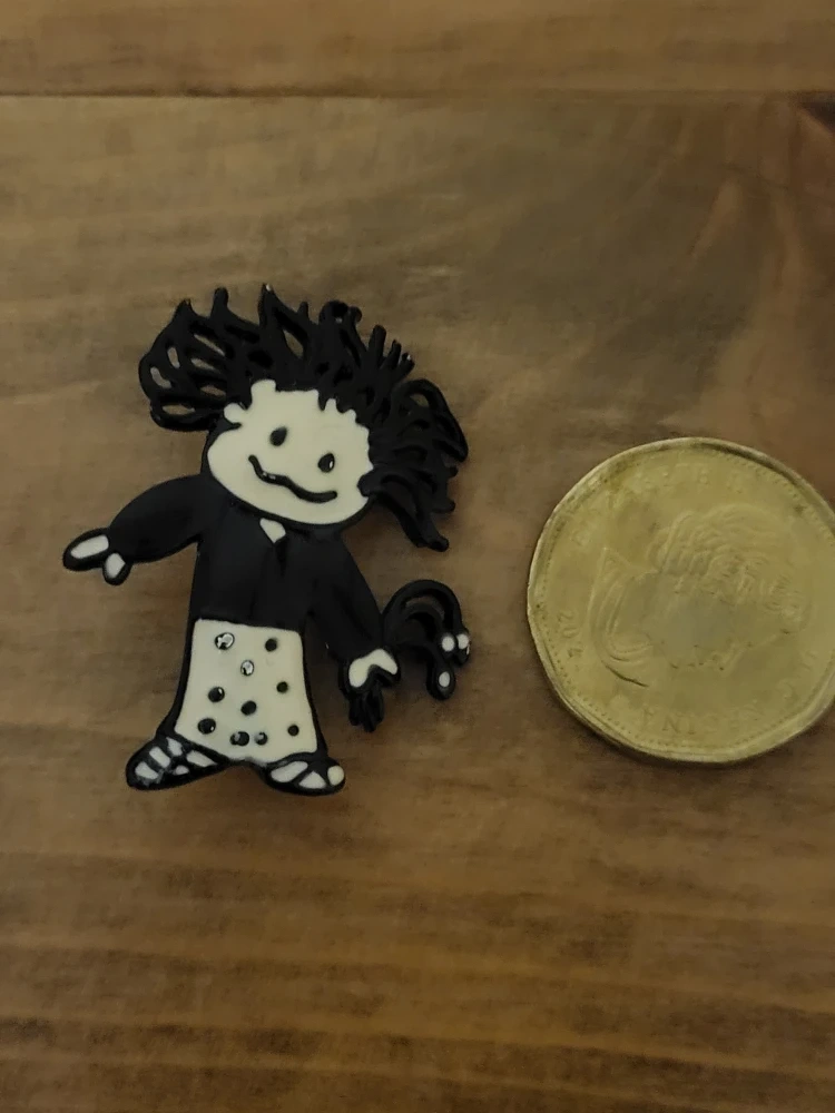134Here's a cute vintage pin brooch! It features a girl design with black and white enamel detailing. It's in great condition and would be a lovely addition to any collection or outfit