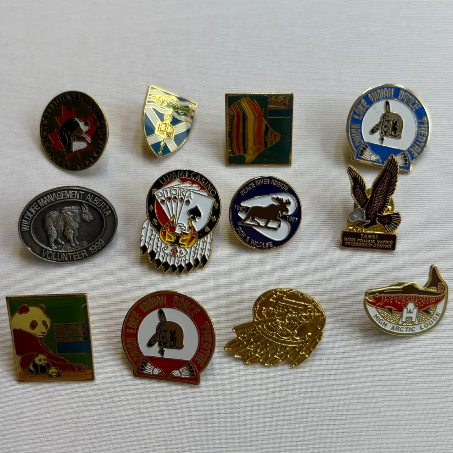 122Set of 12 collectible enamel lapel pins featuring various vintage and travel-themed designs. Includes wildlife, organizational, and cultural motifs such as bears, moose, eagles, casinos, and more. Most appear to date from the 1980s–1990s and include pins from Canadian regions and events. Ideal for collectors or for display. Most are New without tags or packaging! Brand: Various / Mixed Era: 1980s–1990s Color: Multicolor Print: Mixed enamel designs Material: Metal and enamel Condition: Pre-owned, excellent vintage condition Size: Assorted (see ruler in photo for scale) See photos for measurements. Flaws: None noted Cross posted. Keywords: vintage lapel pins, enamel pin collection, souvenir pins, wildlife enamel pins, Canada pins, 1980s pins, travel collectibles, enamel badge lot, retro pin bundle, mixed lot lapel pins Winnipeg - Pick up only (Located 2 blocks west of Polo Park). Shipping options available through other platforms message me for details.