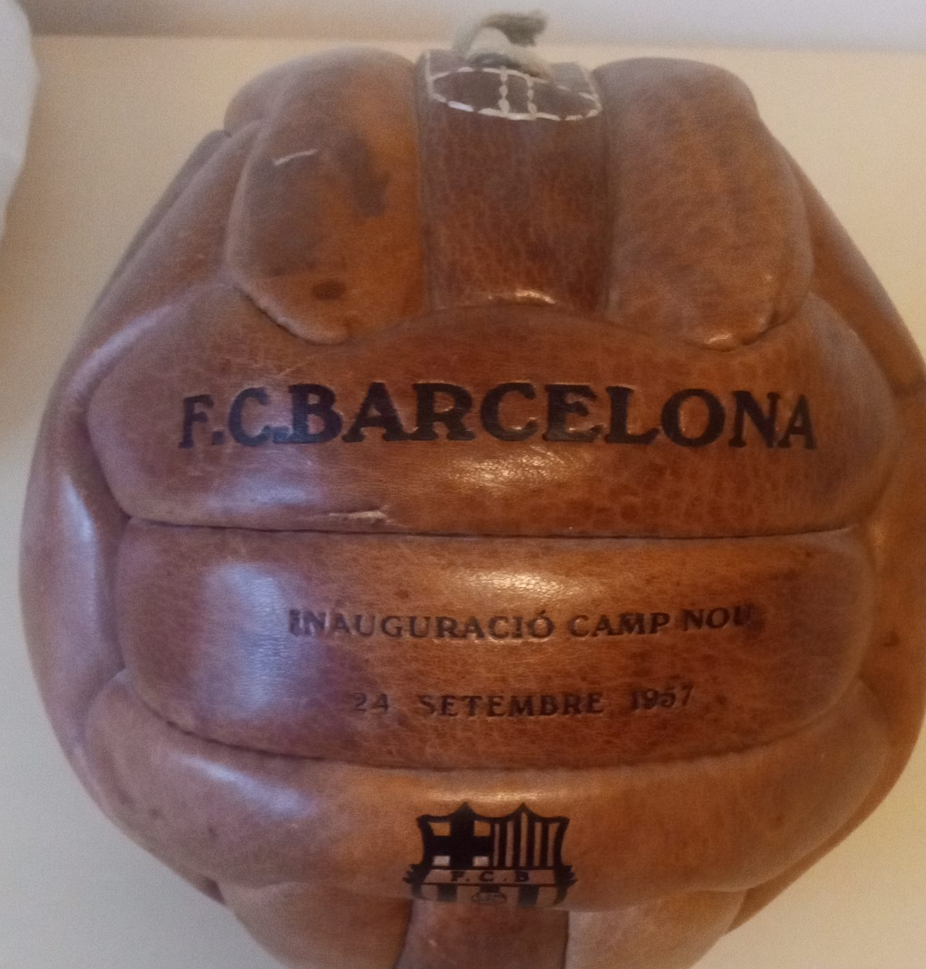 Selling a vintage F.C. Barcelona soccer ball made of leather. It features the club's name and logo, along with "INAUGURACIÓ CAMP NOU 24 SETEMBRE 1957", marking the inauguration of Camp Nou in 1957. A cool piece of sports history!