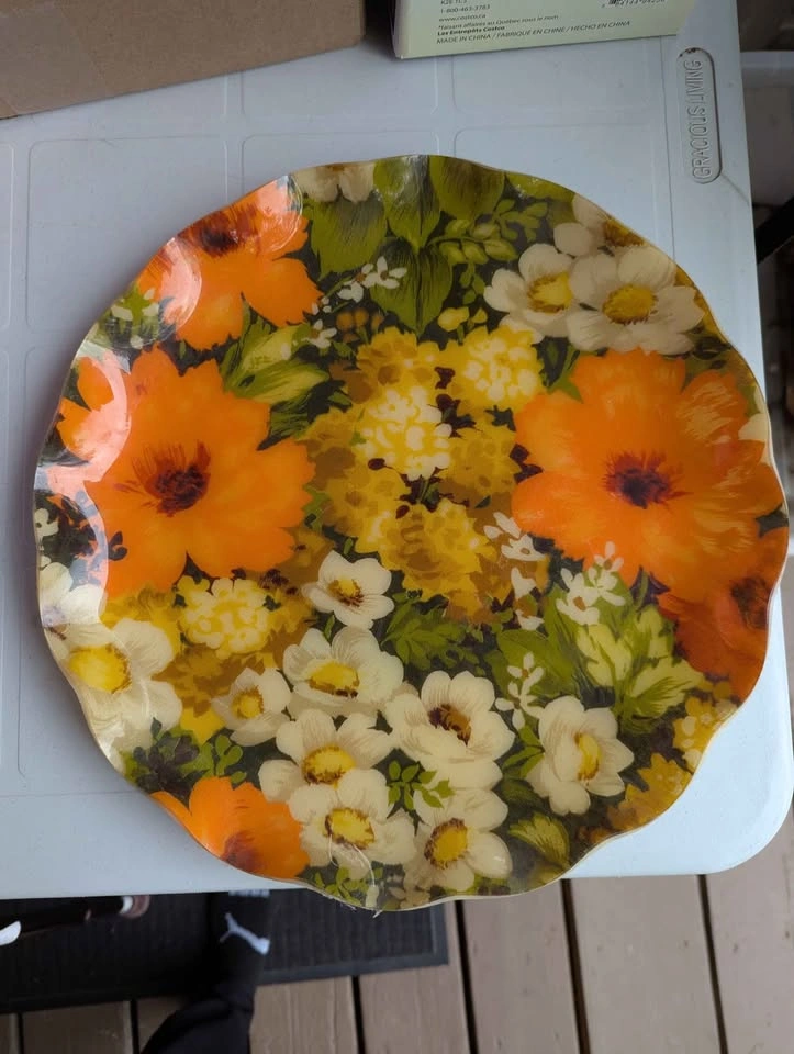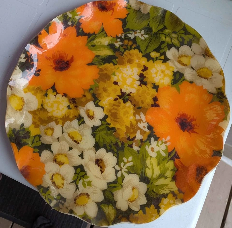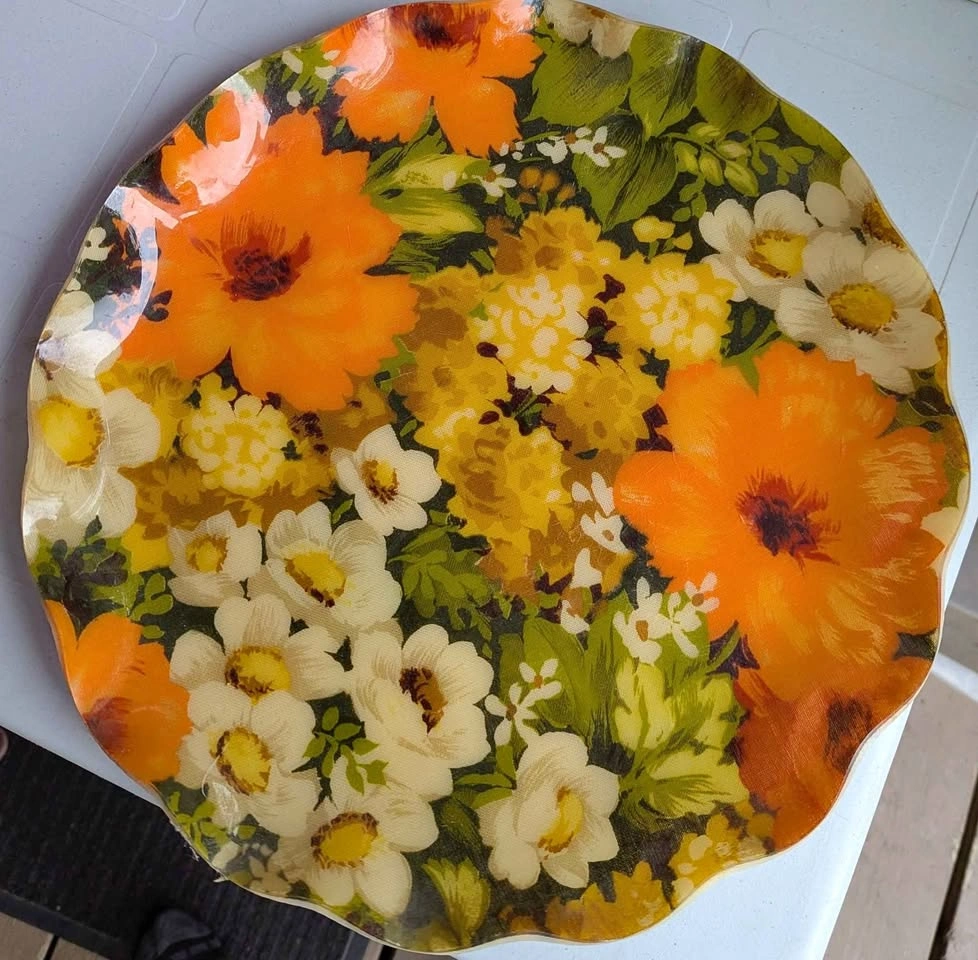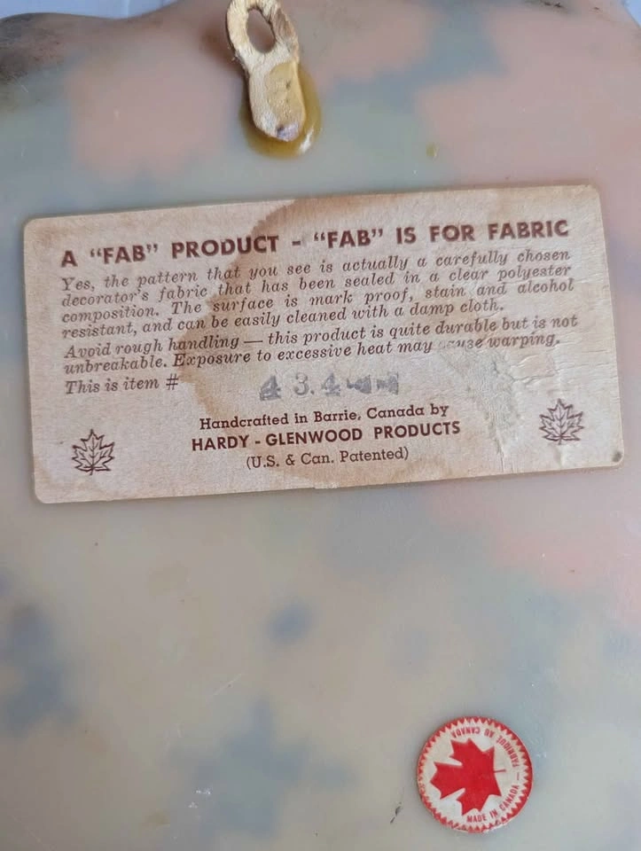 10Vintage "Fab Tray" from the 1960s featuring a floral fabric sealed in a clear polyester or resin composition. These trays were produced by Hardy Glenwood Products in Barrie, Ontario, Canada. Production ended in the 1970s, but they remain popular among vintage collectors for their patterns and vivid colours. It measures 13" in diameter. There are some surface scratches on the tray. North St Catharines pickup, cash only.