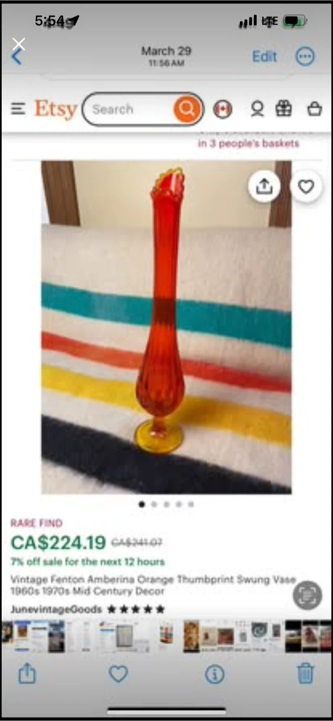 glows Selling a vintage Fenton Amberina orange thumbprint swung vase! It's a beautiful piece of mid-century decor from the 1960s or 1970s. Originally bought for $224.19 Internet posting - depicts price points Person to person Community of Killarney SW Cash offer considered