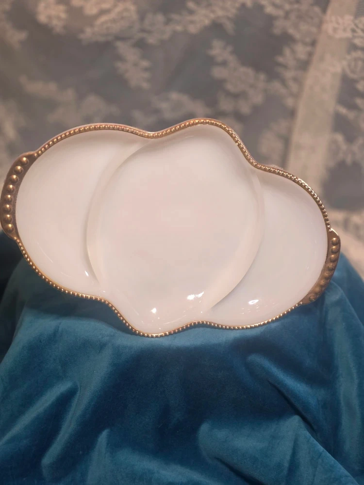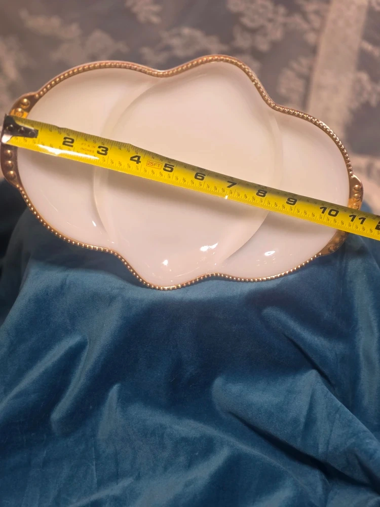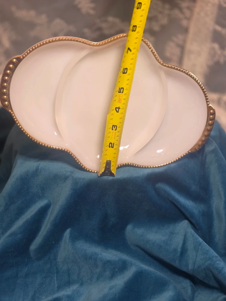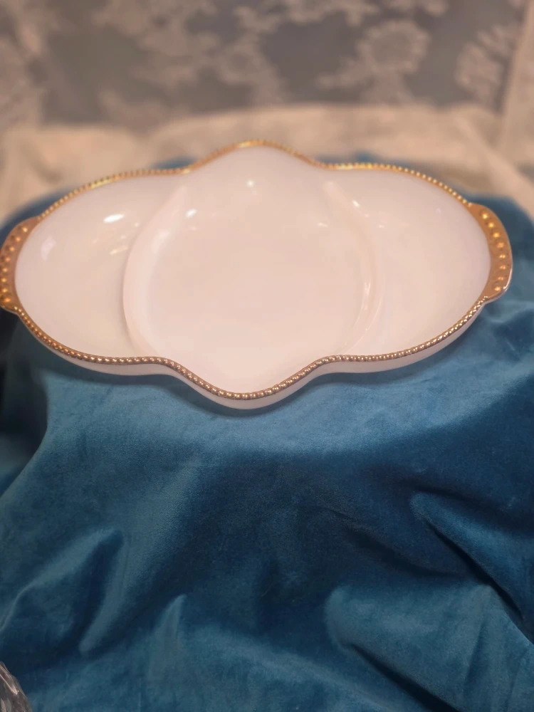 15Selling a vintage Fire King Oven Ware relish dish. It's a beautiful white colour with gold trim. It measures approximately 11 inches in length and 7 inches in width.