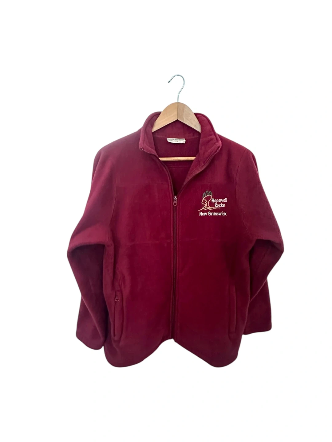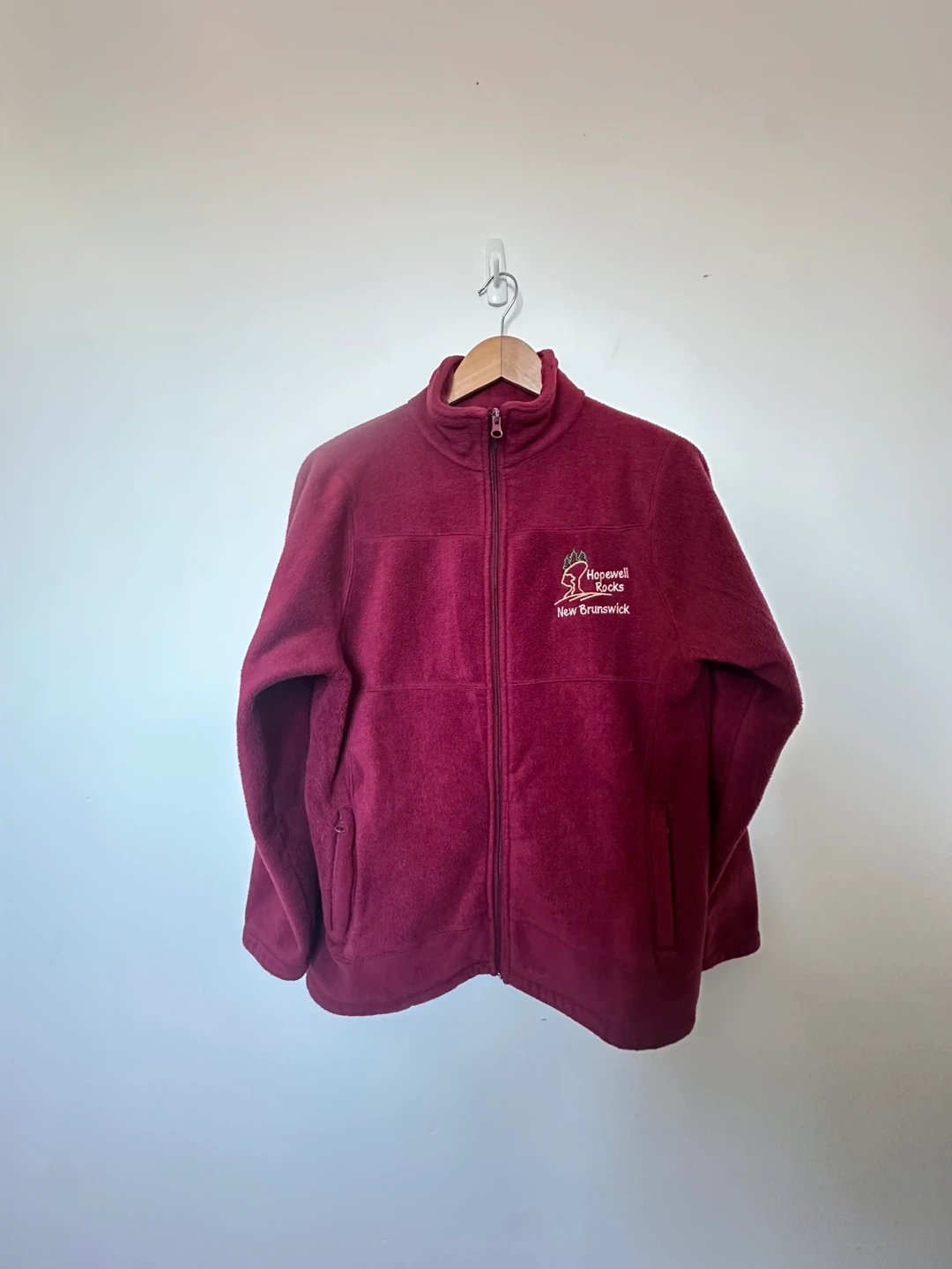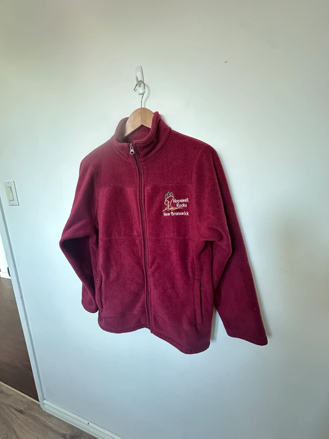 12Vintage Fleece Sweater Northern Getaway Fleece Burgundy Cozy Cozy Northern Getaway fleece jacket in a lovely maroon colour! It's a size large and features the Hopewell Rocks New Brunswick logo. Perfect for keeping warm on chilly days! Fit would be a women’s medium/large Measurements: Armpit to armpit - 20” Length - 26”