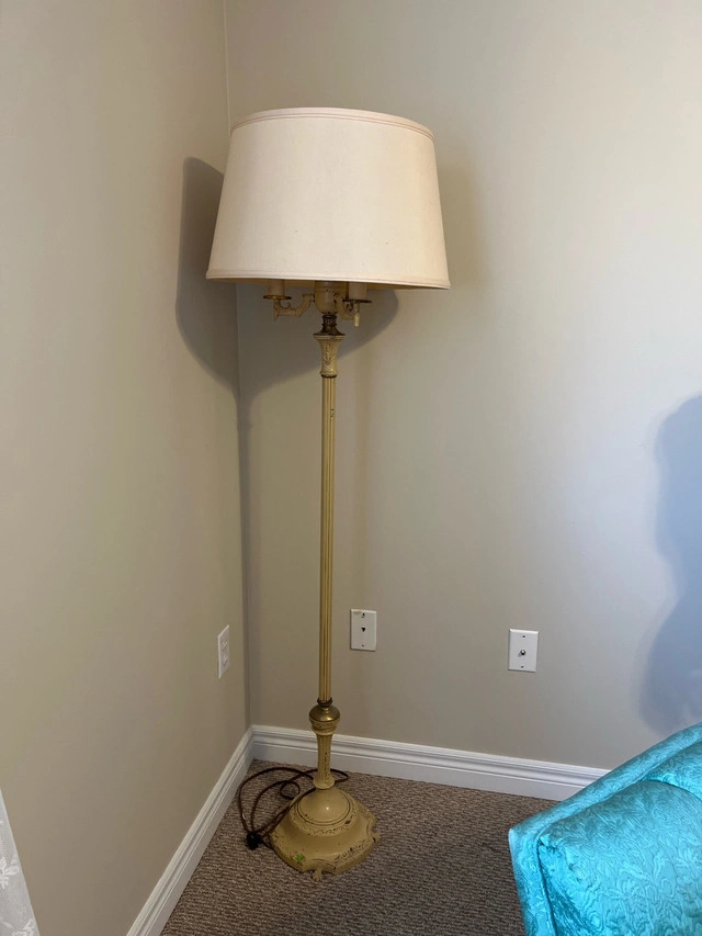 15Illuminate your space with this vintage floor lamp, featuring a classic design and a warm, ambient glow. This used lamp stands tall and elegant, ready to add a touch of retro charm to any room. While it shows signs of its age, it remains a functional and stylish piece. Specifications: - Type: Floor Lamp - Style: Vintage - Condition: Used Why buy new when you can embrace the past? As the saying goes, they don't make them like they used to! If the ad is up, the lamp is available.