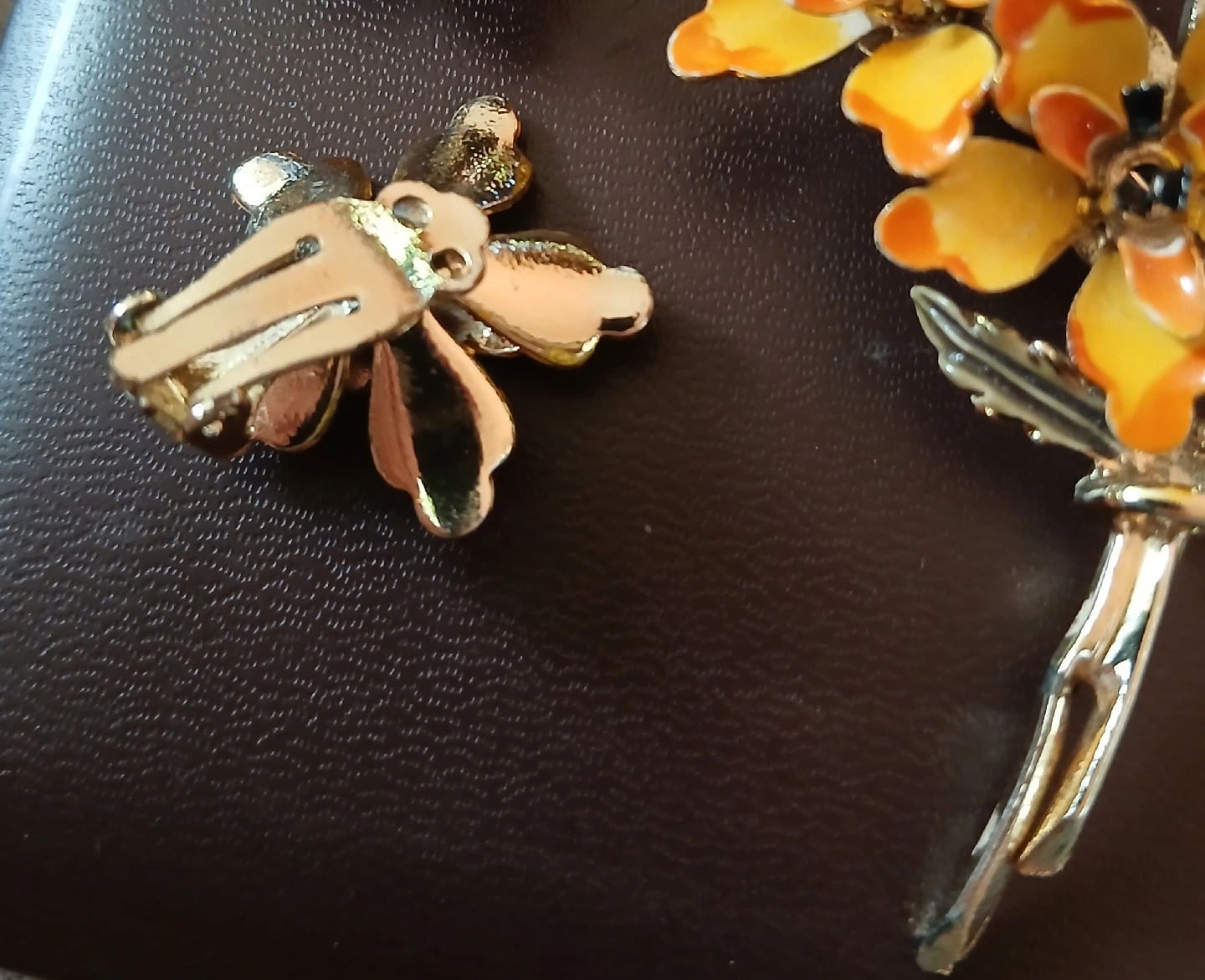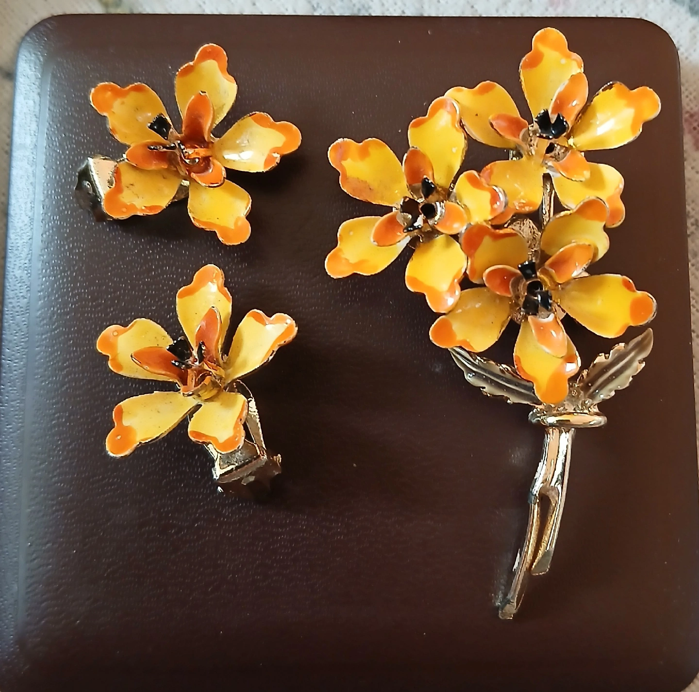 Selling a lovely vintage floral brooch and clip-on earrings set. The set features yellow and orange enamel flowers with gold-tone metal. Perfect for adding a touch of vintage charm to any outfit!