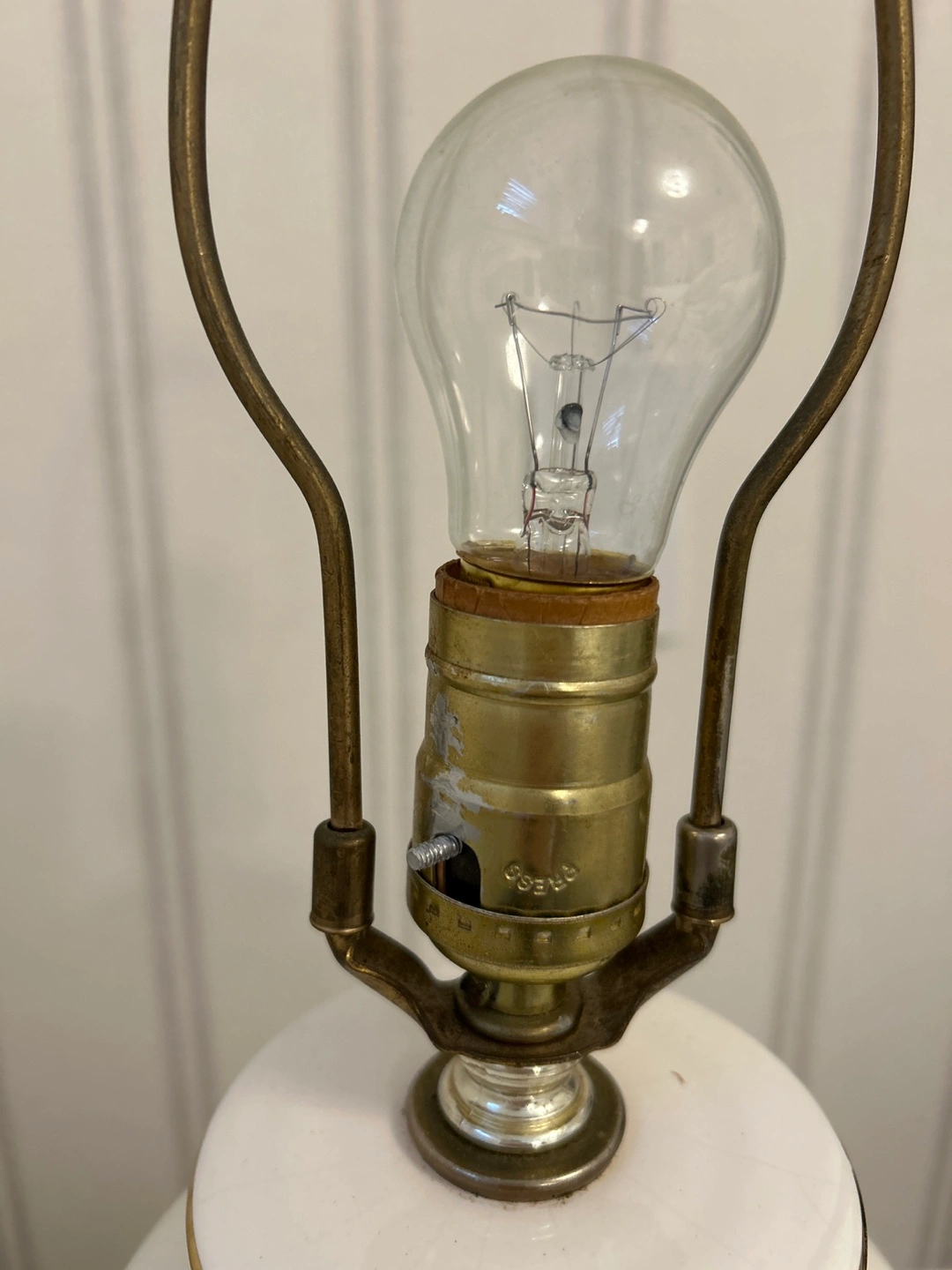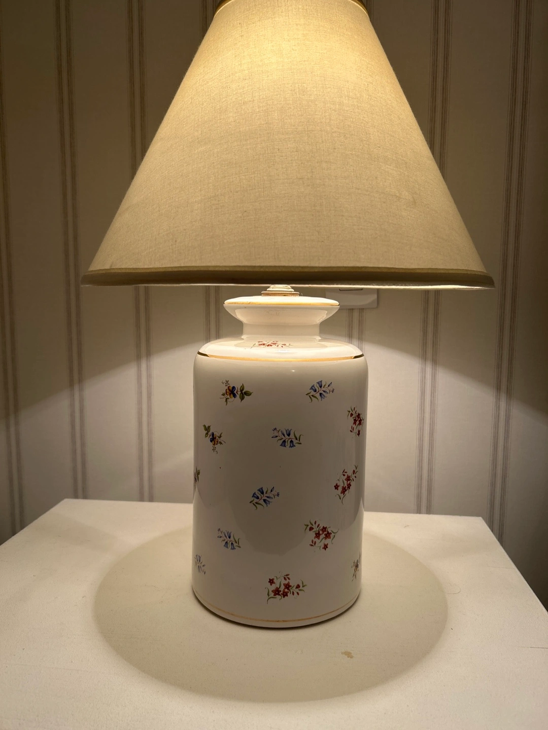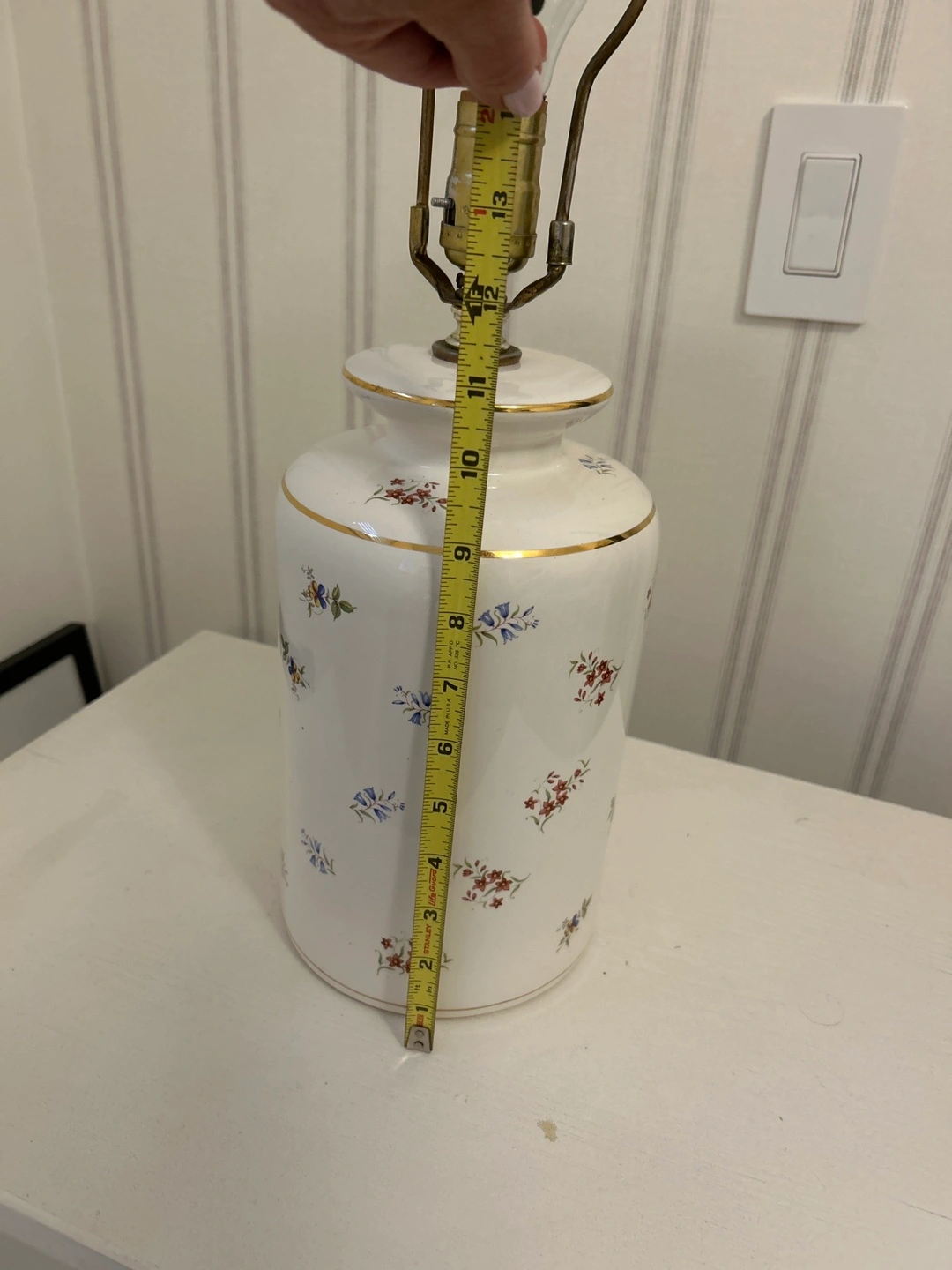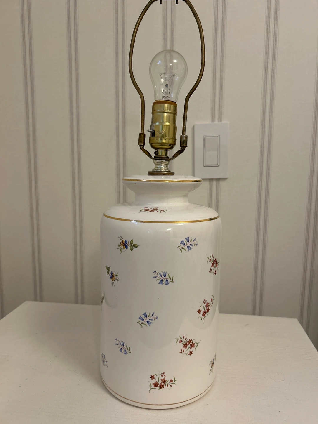 Here's a lovely vintage ceramic table lamp with a floral design! It's in good condition and adds a touch of charm to any room. The lamp stands approximately 12 inches tall. Perfect for a bedside table or living room accent. Need to replace the light socket if you want to turn it on and off via switch and not plug. Lampshade not included.
