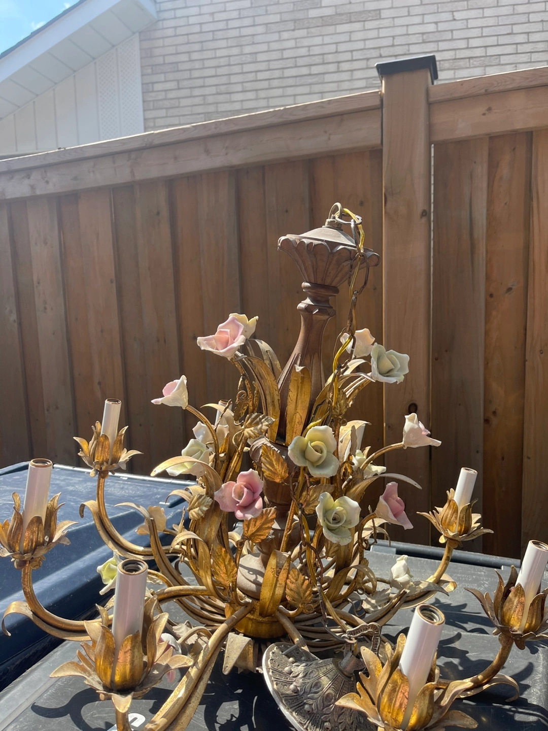 Selling a beautiful vintage chandelier with a unique floral design. It features delicate porcelain flowers in shades of pink and white, intertwined with golden leaves and ornate metalwork. This chandelier would add a touch of elegance and charm to any room!