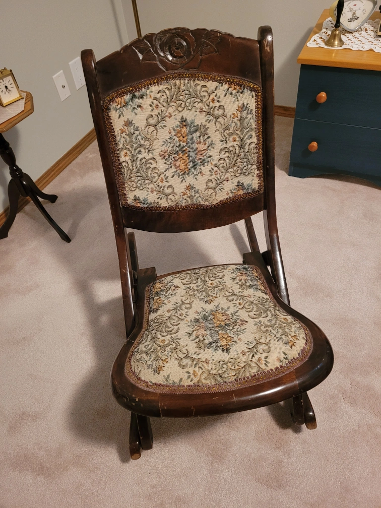 I'm selling a vintage folding chair with a lovely floral pattern. It's made of wood and features a padded seat and back with a floral tapestry. Great as an extra seat or a decorative piece!