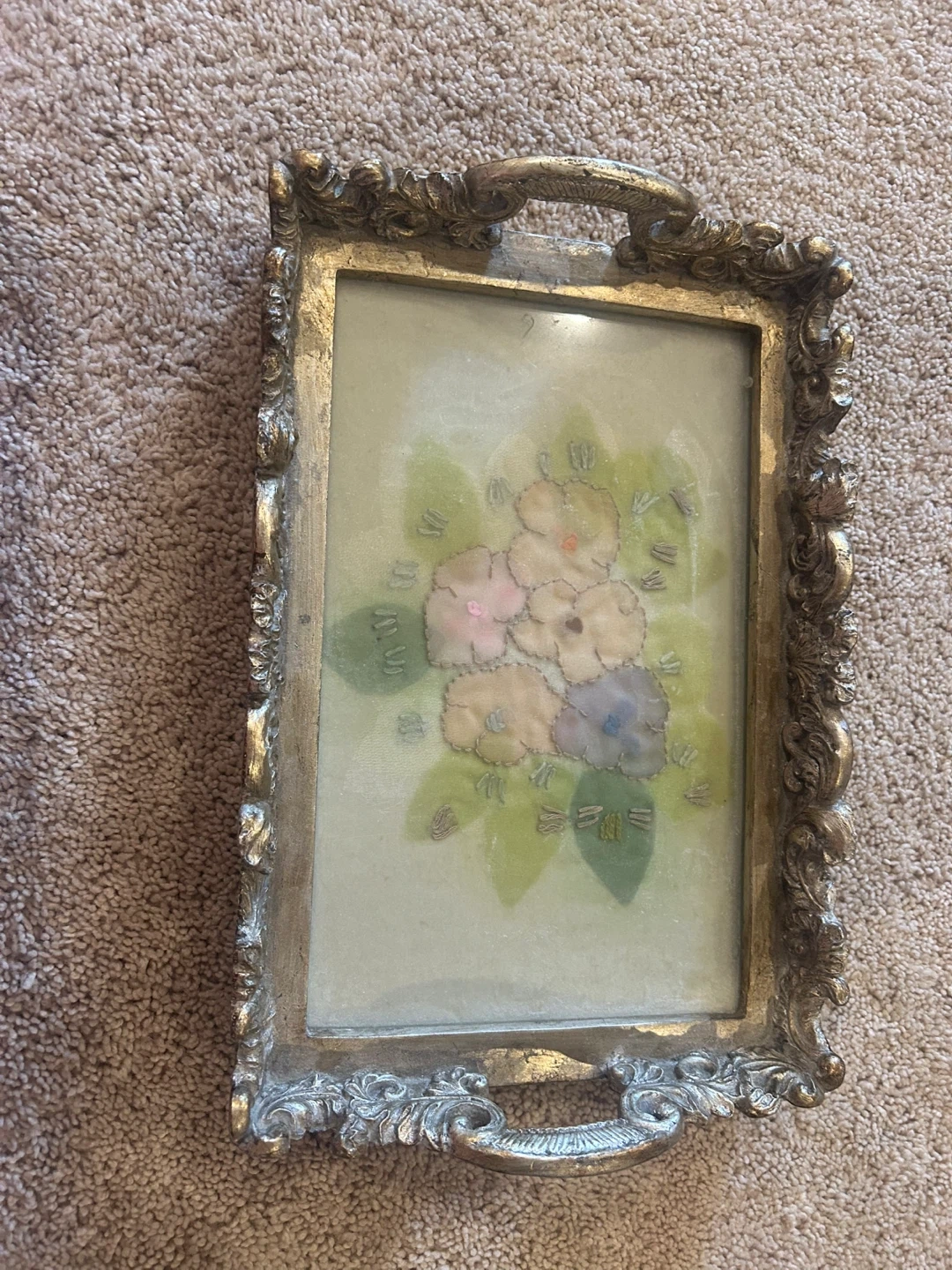65Selling a vintage framed tray with a floral design. The frame has ornate detailing and handles on each end. It would make a lovely addition to any home decor!