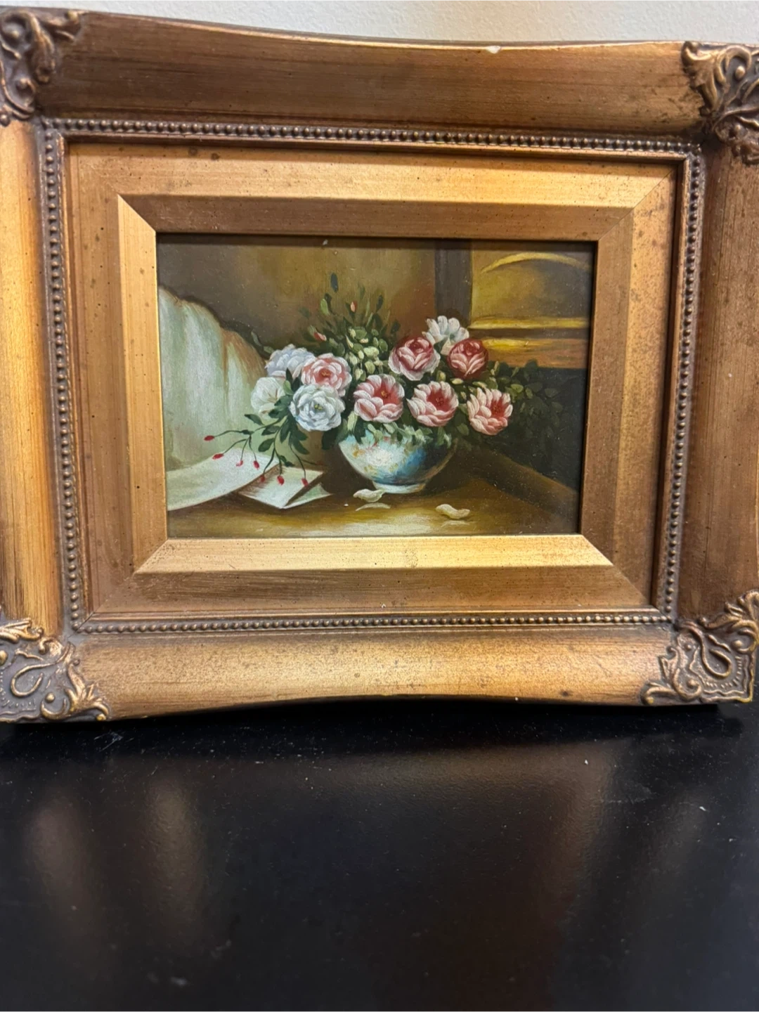 A lovely vintage oil painting of flowers in a vase. The painting is framed in a decorative gold-tone frame. It would be a beautiful addition to any room!