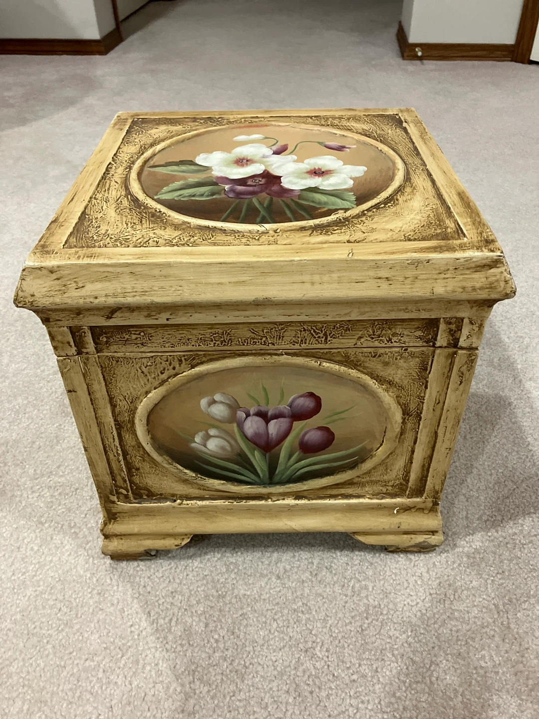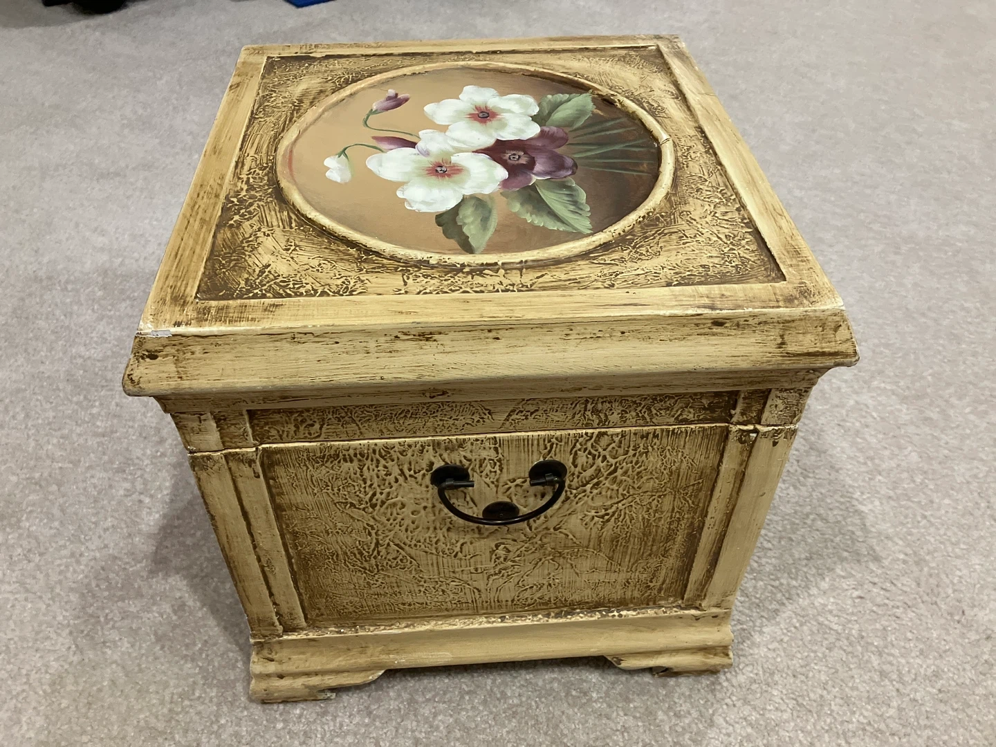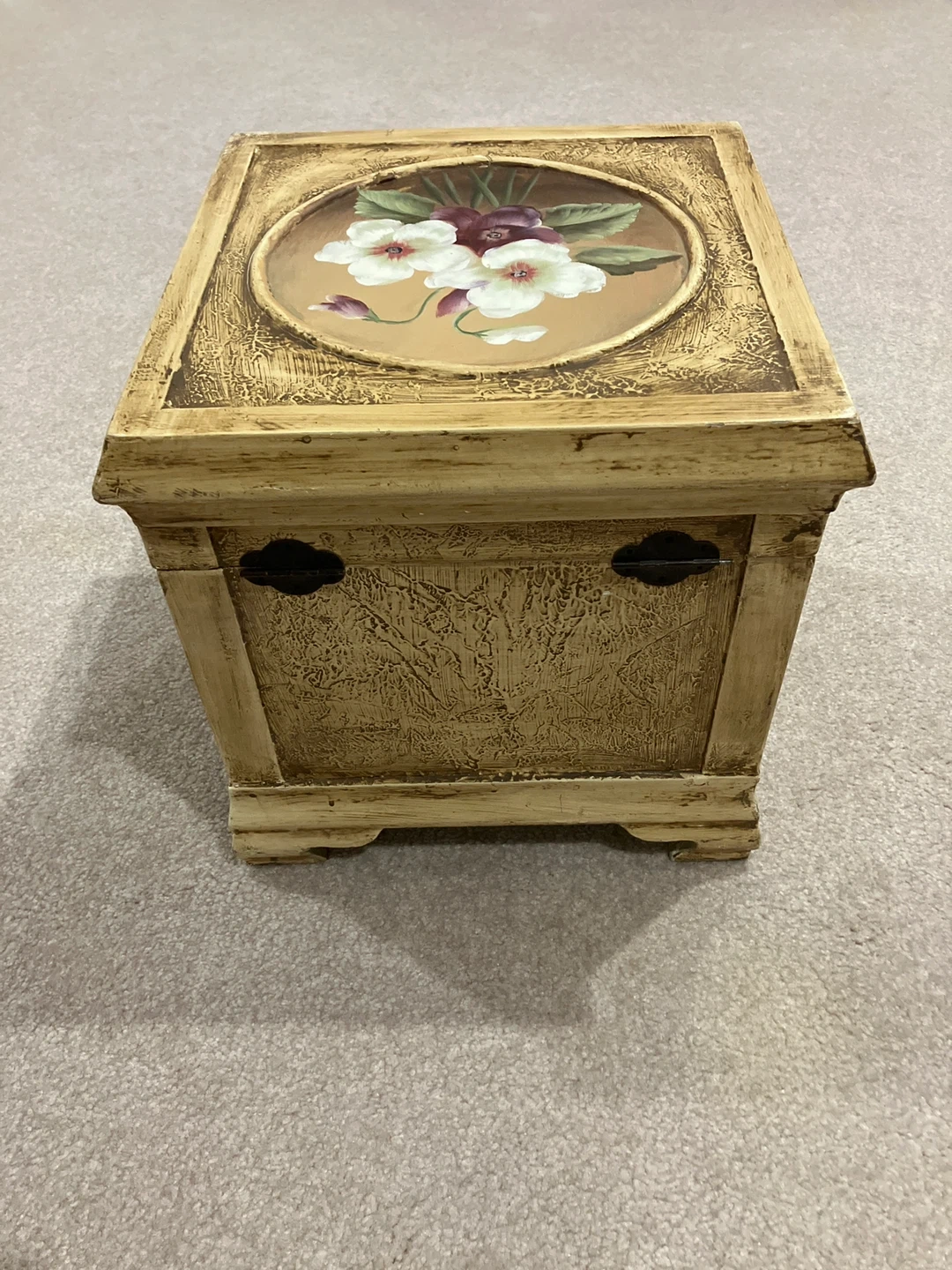 60Here's a charming vintage storage box with a lovely floral design! It has a unique, aged look and would be perfect for adding a touch of character to any room. It features a drawer and a hinged top for easy access to your stored items. It's in good condition and ready for a new home!
