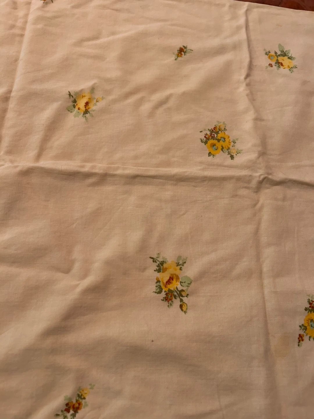 217Selling a vintage pillowcase with a lovely floral pattern! The fabric is a soft, creamy colour with a border of yellow and green roses. Perfect for adding a touch of vintage charm to your bedroom. Really makes it feel Like home. Great vintage shape.