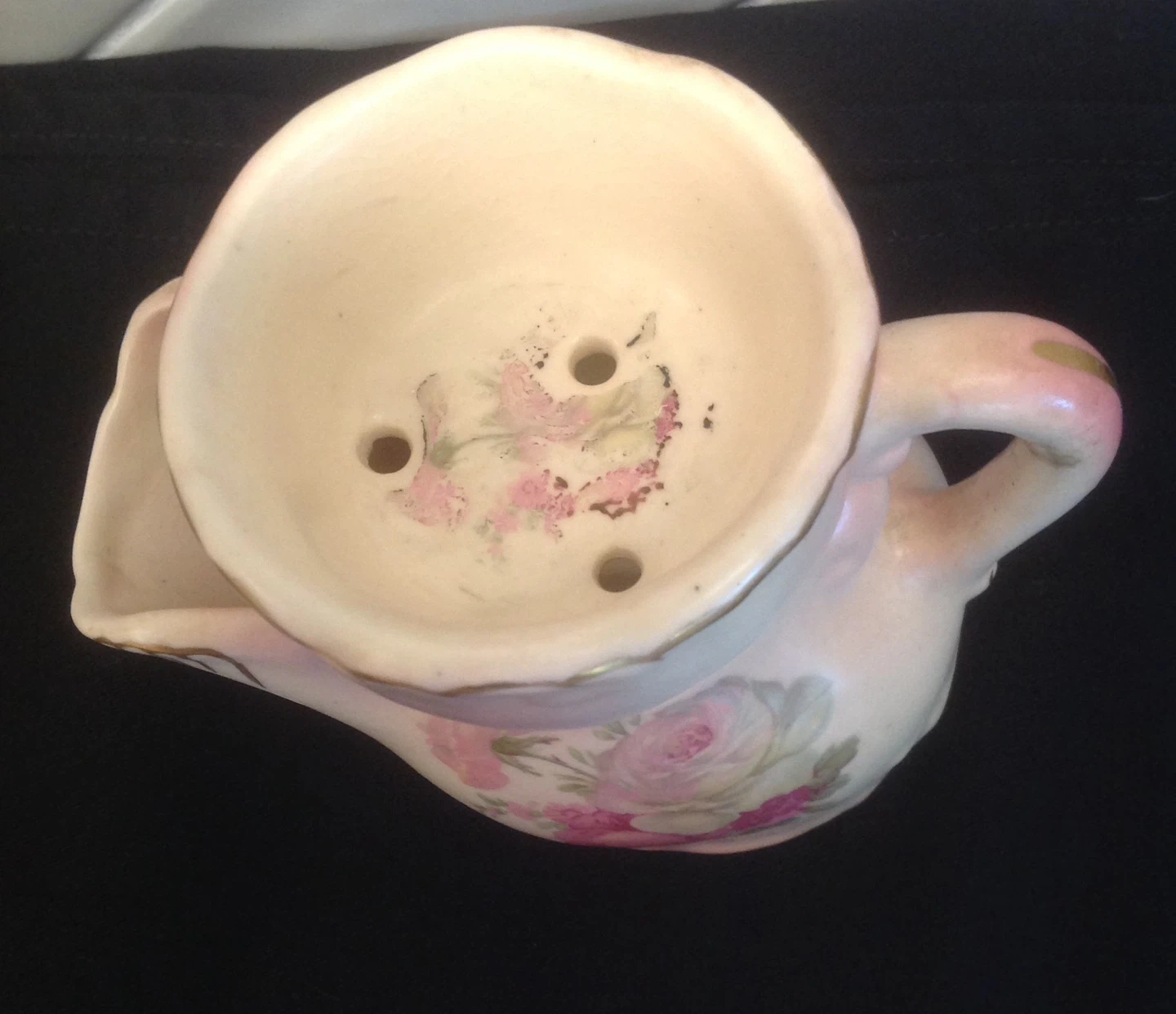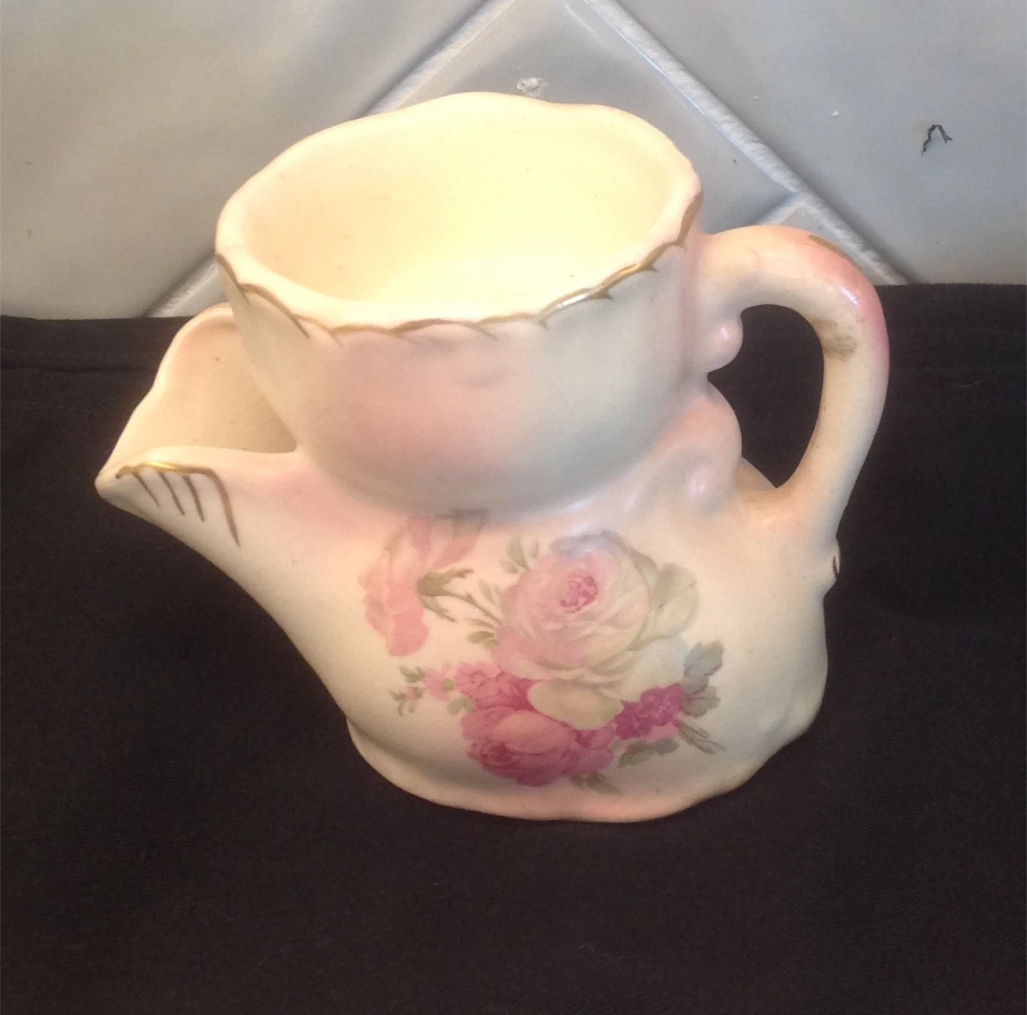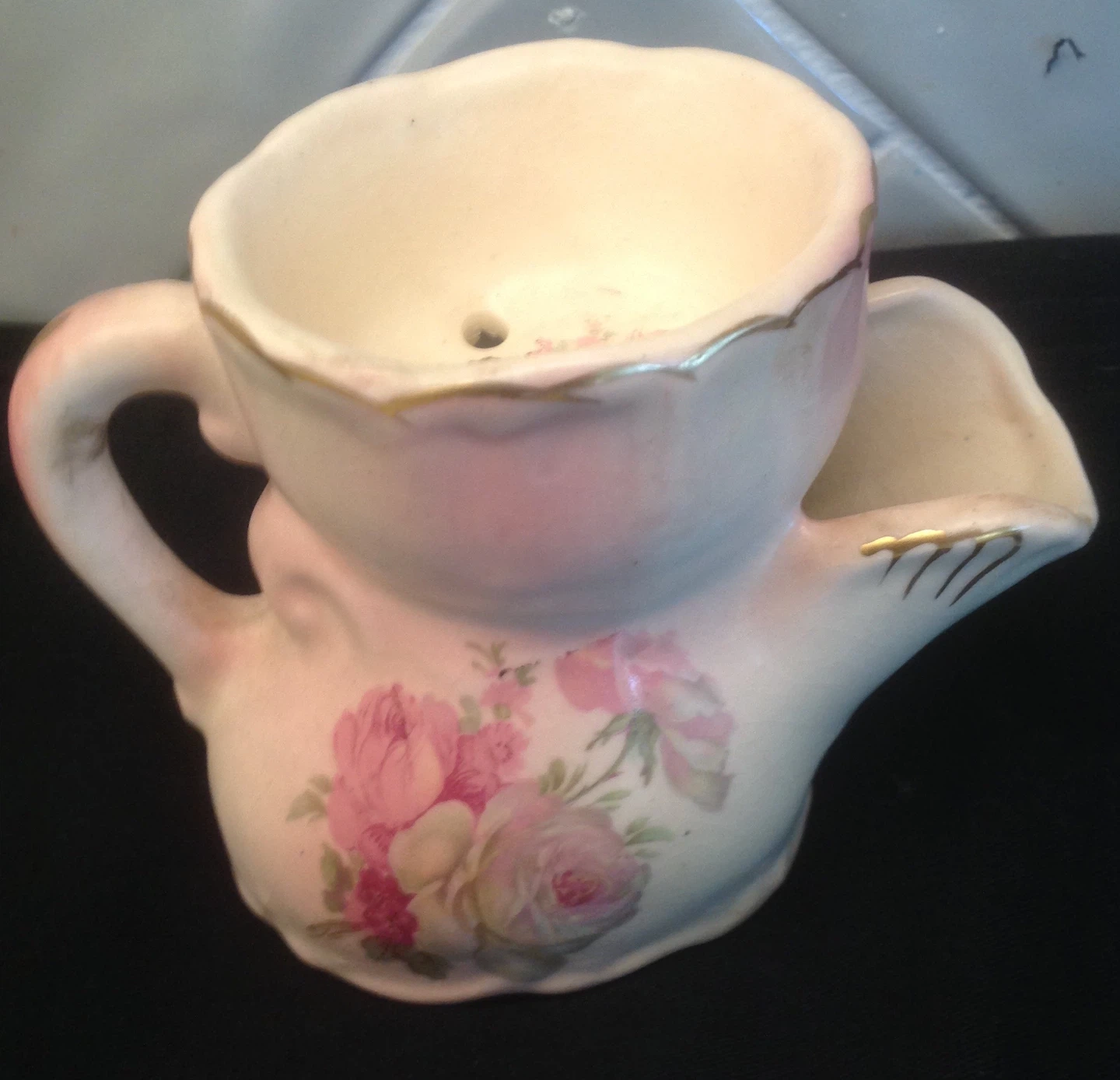 Selling a vintage shaving mug scuttle with a lovely floral design. It has a unique shape with a spout and a handle, perfect for any collector or someone looking for a classic shaving experience. There are some signs of wear, but it's still in good condition for its age
