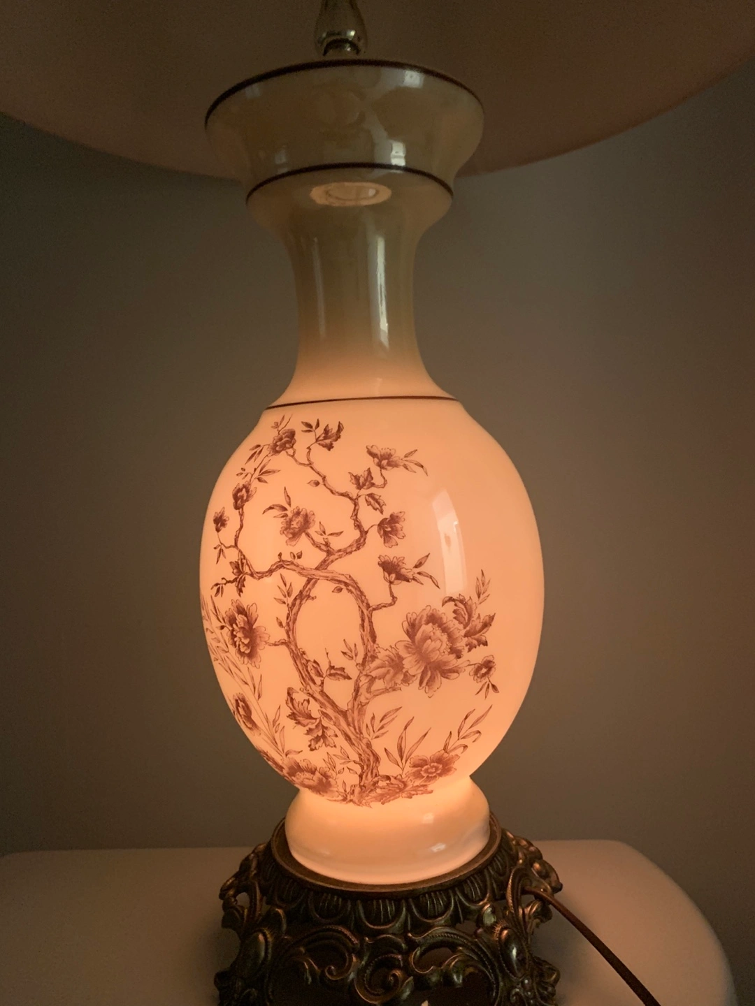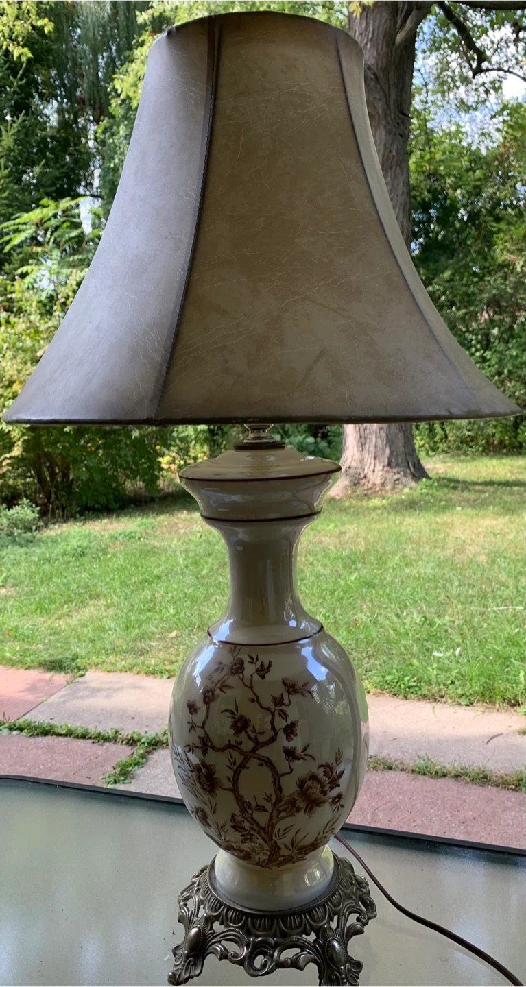 79Selling a lovely vintage table lamp with a floral design on the base. It has a classic shape and would be perfect for adding a touch of elegance to any room. The lampshade is included!