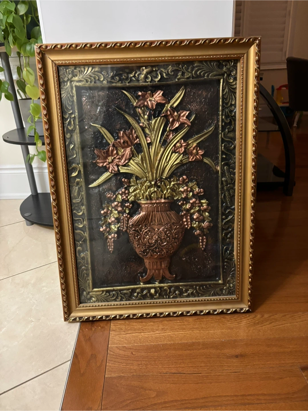 10Beautiful vintage wall art featuring a floral arrangement in a vase. The frame is a lovely gold colour and the artwork has a textured, three-dimensional effect. It would make a great addition to any room!