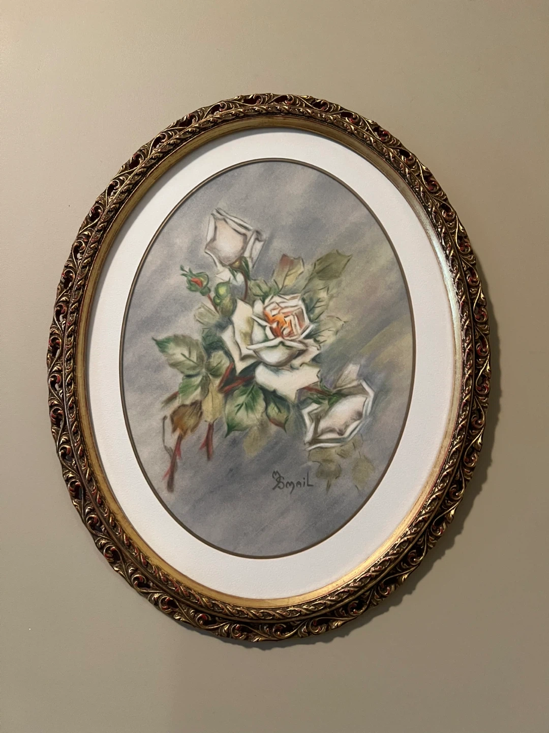 579Beautiful oval-shaped frame with an ornate gold finish A delicate roses Signed Mint Condition No smoking home Ready to hang 15.5” x 12” (entire frame) Gallery wall? Asking $75 Interested? Message me and please check my other listings…