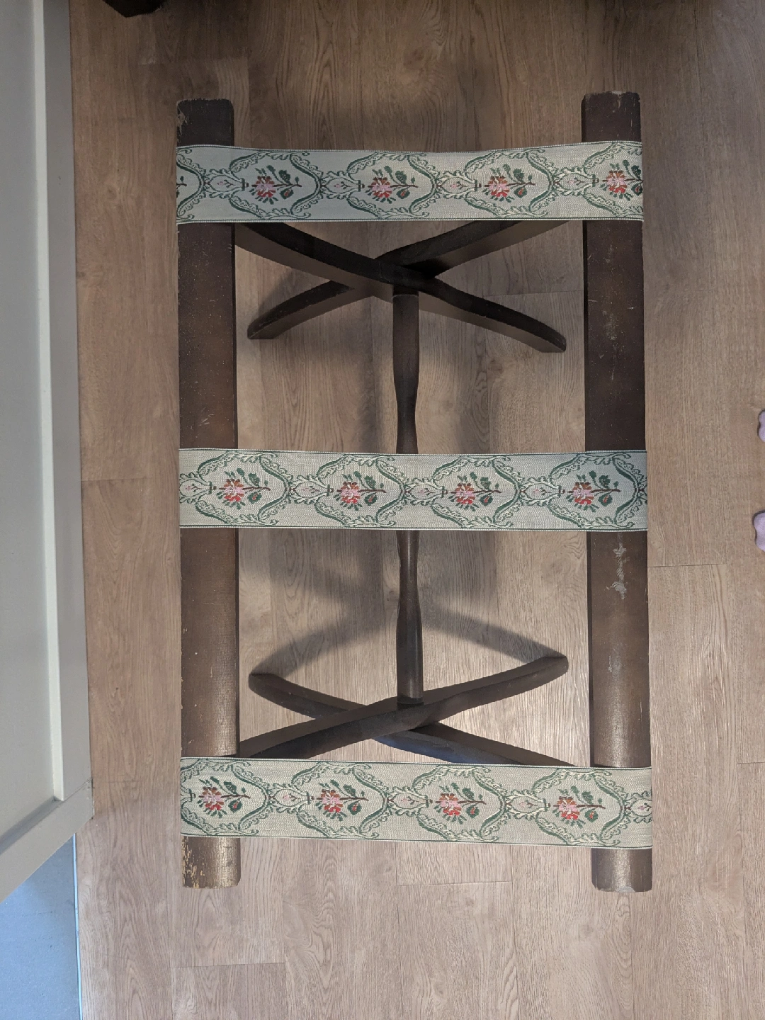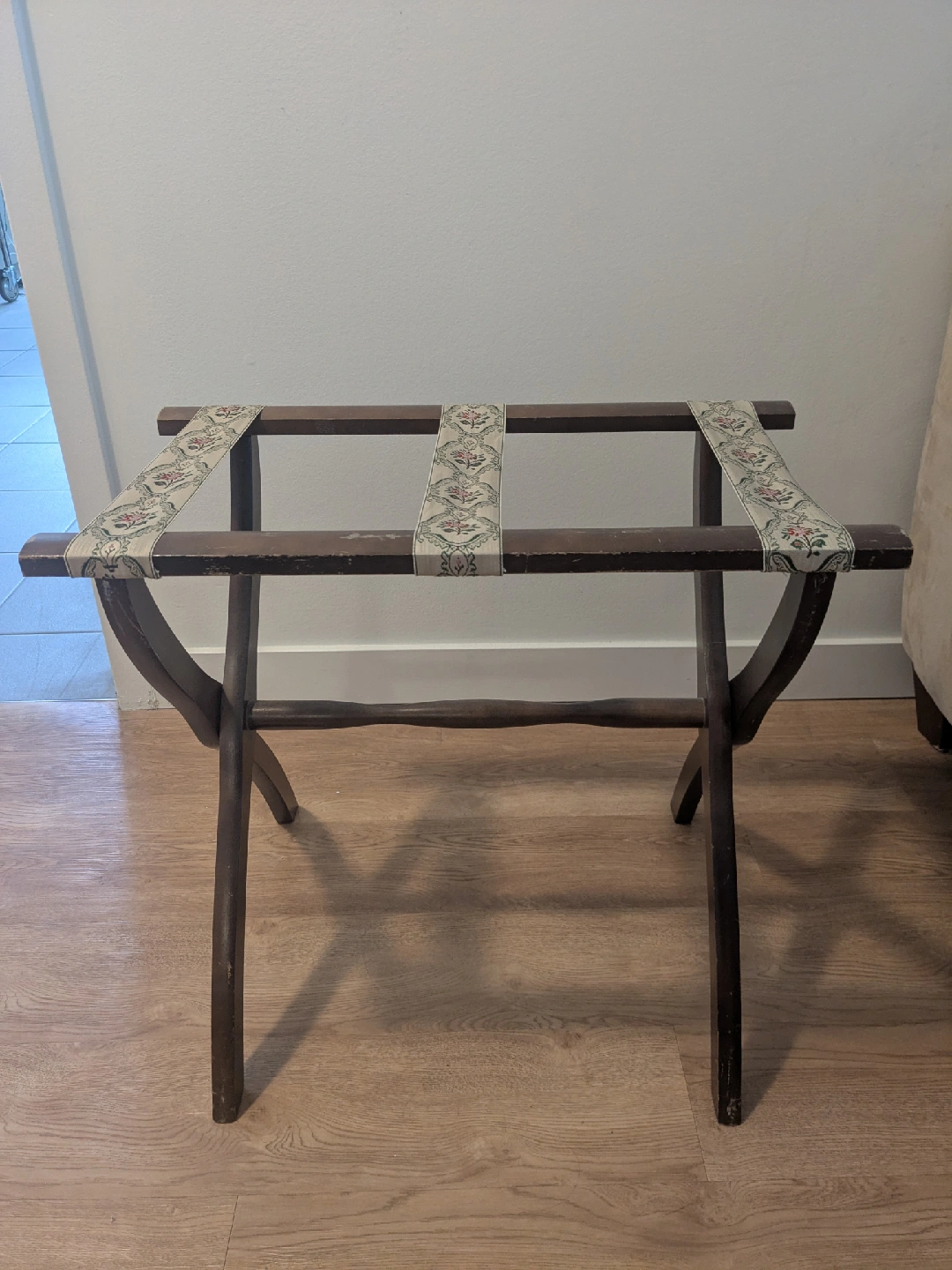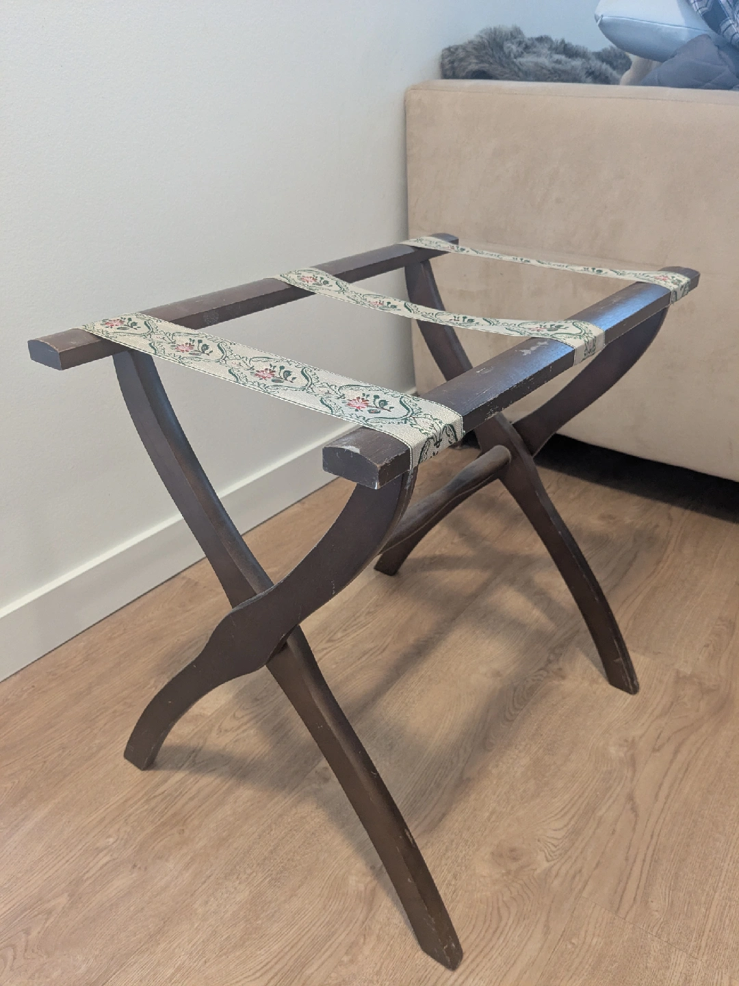 10Selling a folding luggage rack in good condition. It's perfect for guests or for organizing your travel essentials. The rack is sturdy and folds up easily for storage when not in use. It features decorative fabric straps. Vintage authentic Sheibe rack