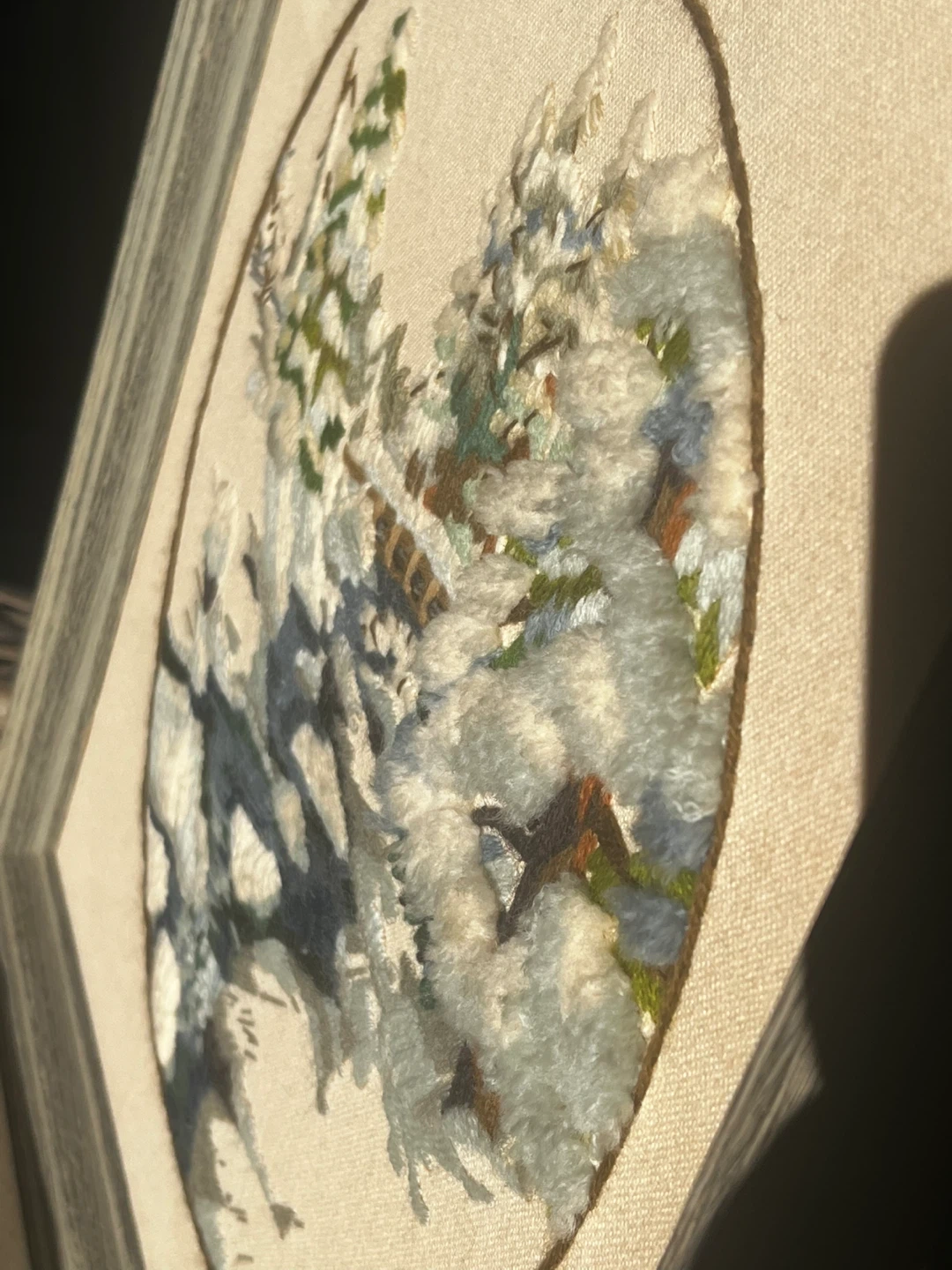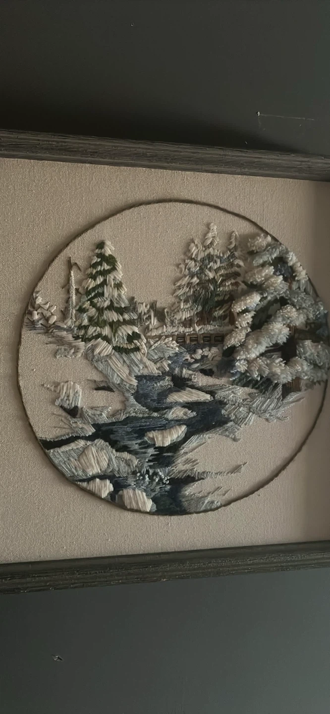 Lovely vintage framed needlepoint art featuring a winter scene with trees and a bridge. The frame has a rustic, grey finish. Perfect for adding a cozy touch to your home decor