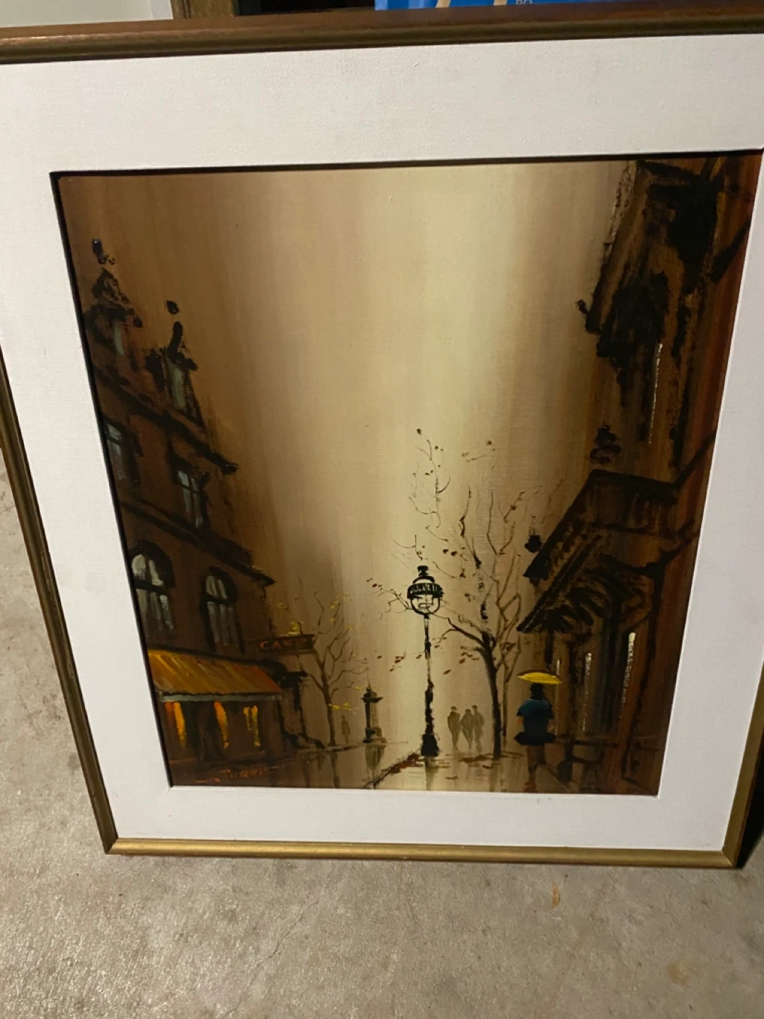 A beautiful vintage painting depicting a Parisian street scene. The painting is framed and ready to hang, adding a touch of classic charm to any room