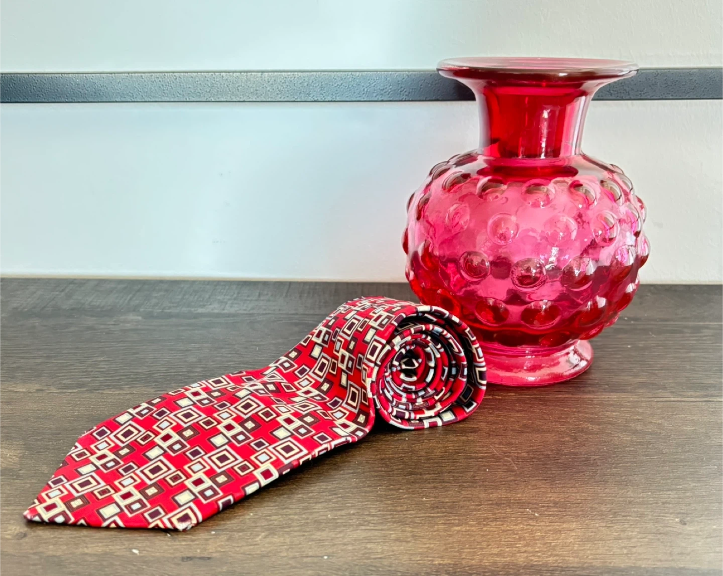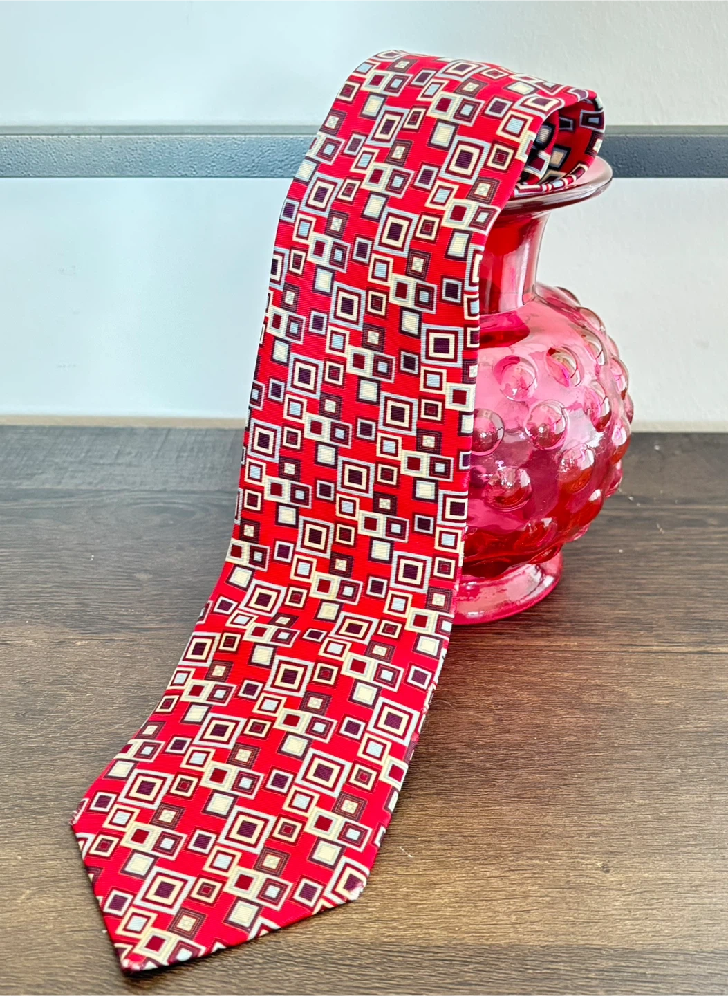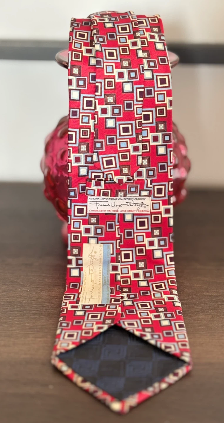 Vintage (1990’s -2000) Frank Lloyd Wright Foundation 100% silk tie. Geometric pattern , dark red|burgundy|cream|light blue, hand made in Korea. Eye catching and in keeping with FLW style. Size in pictures. Some ware.