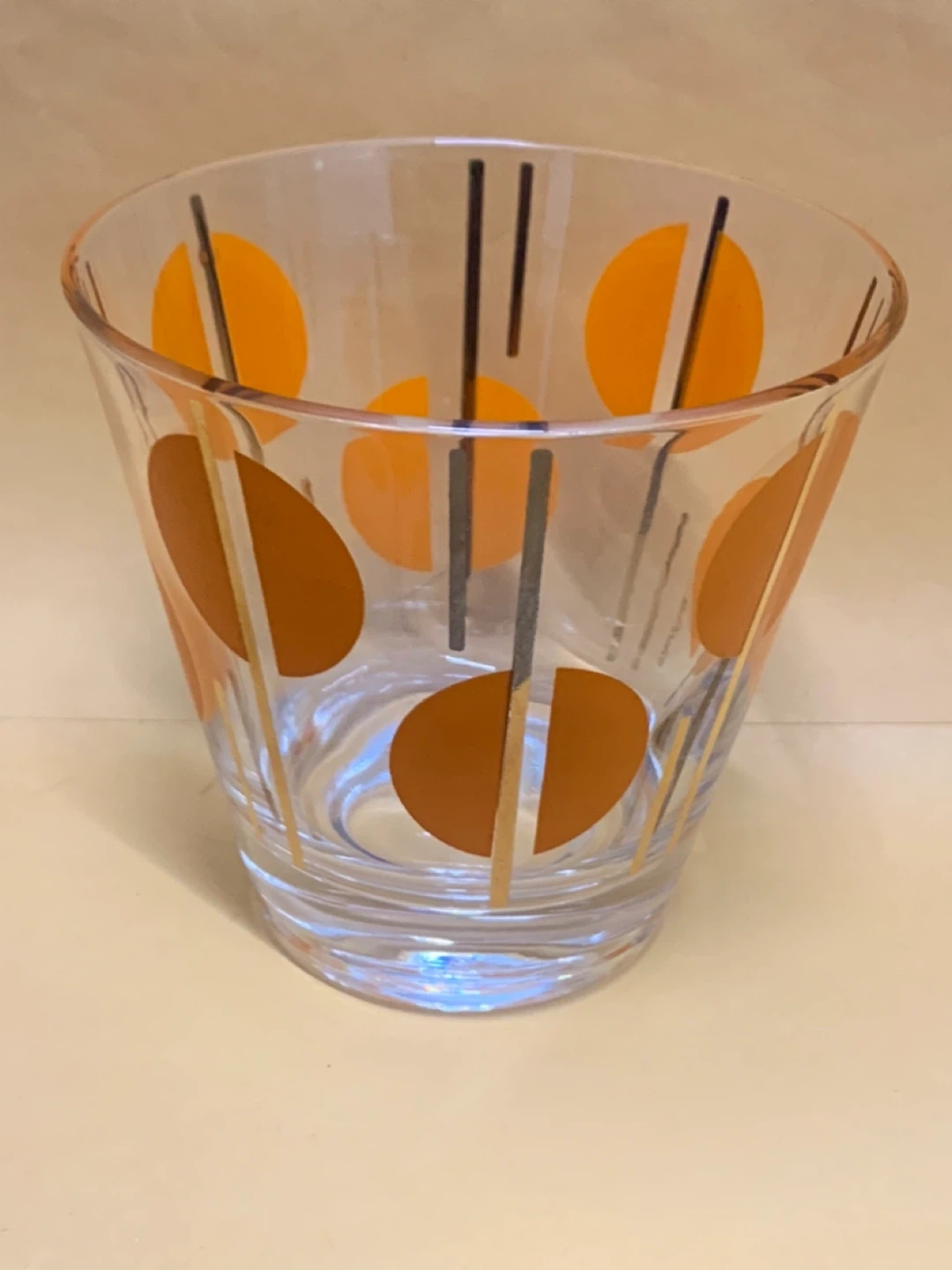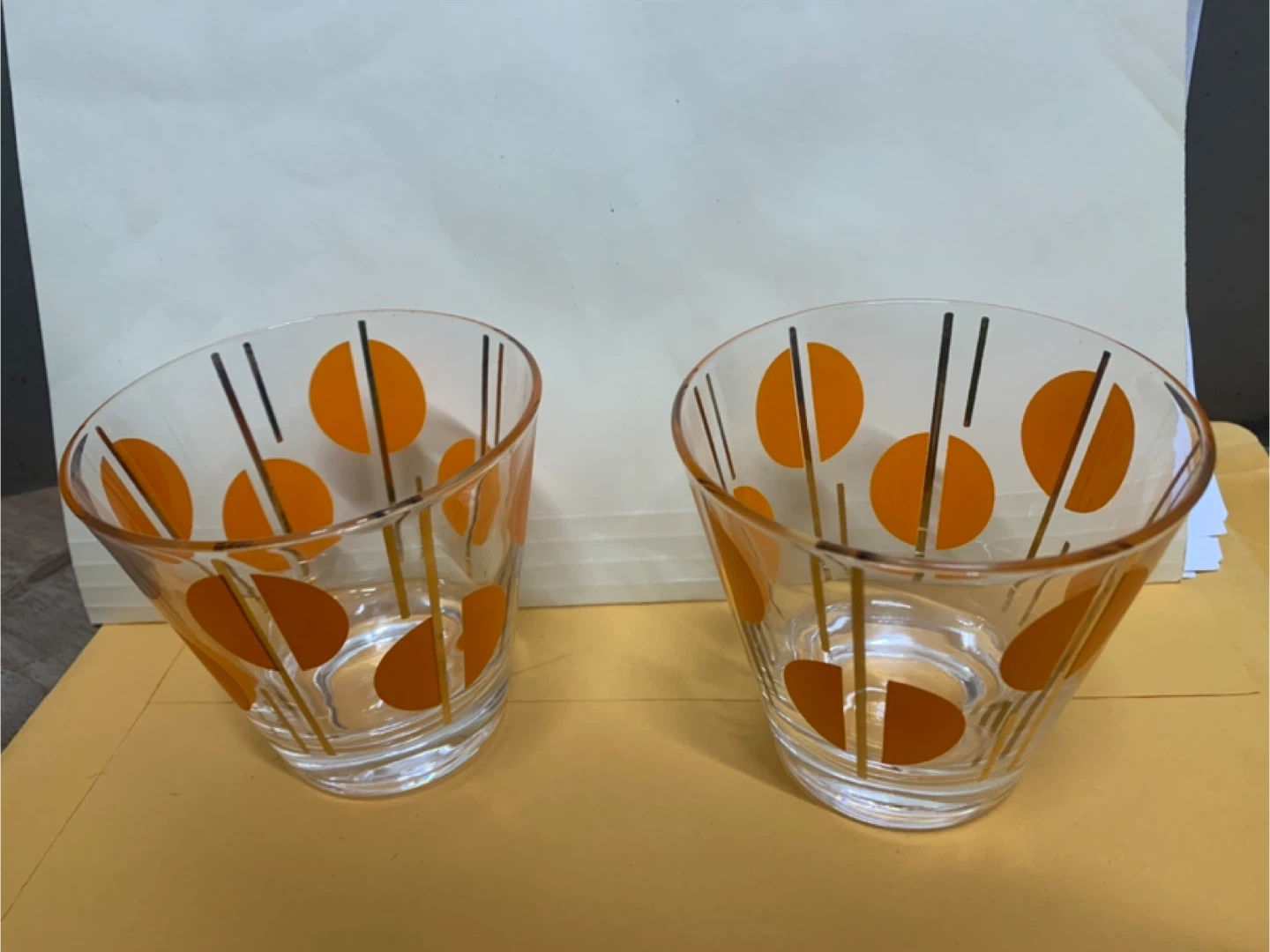 47I'm selling a set of vintage Fred Press glasses! They feature a unique orange mod design with black and gold accents. These glasses are in great condition and would be a stylish addition to any home bar or collection $20 each or all 6 for $100