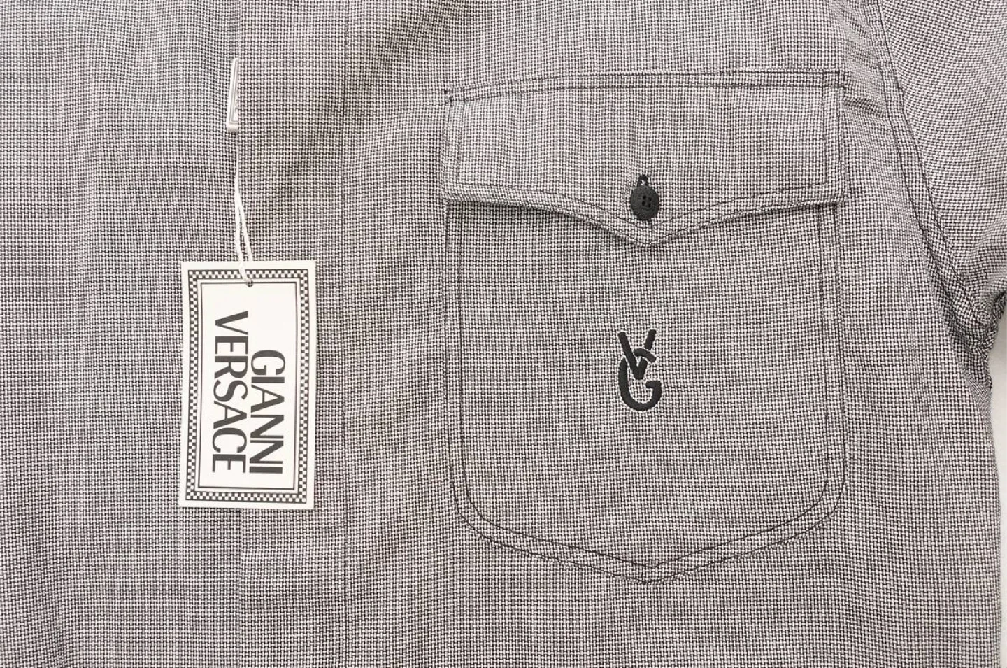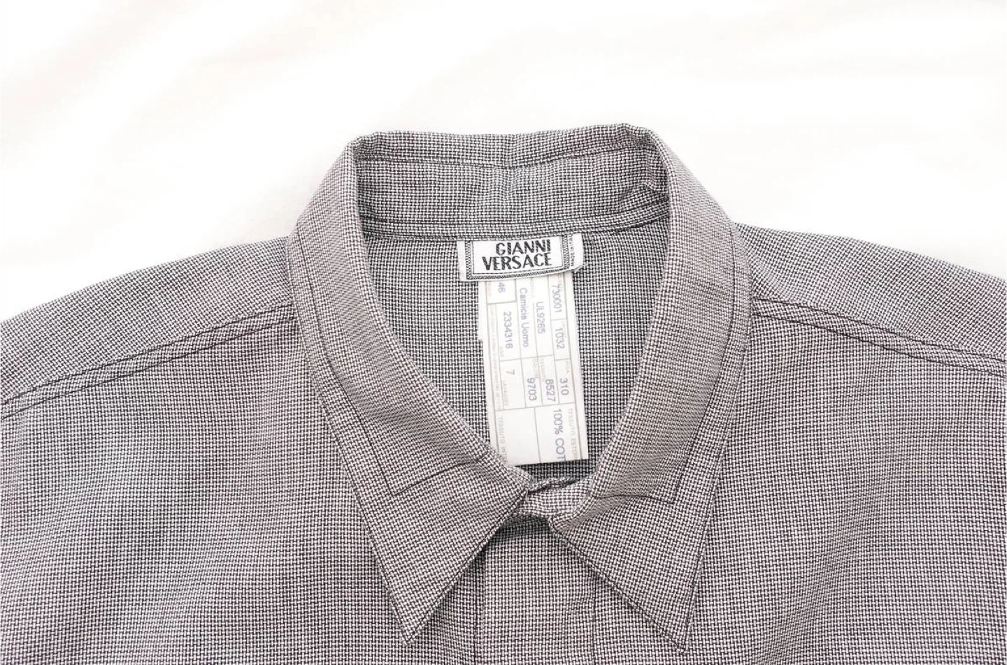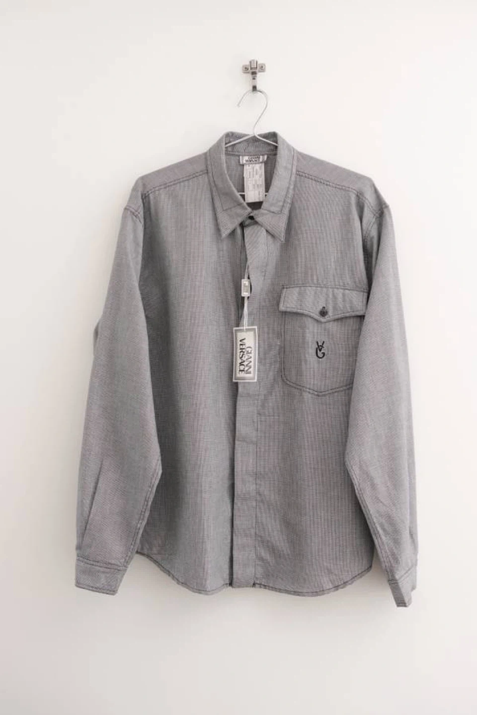 39Vtg 1980s Gianni Versace Men's Dress Shirt Brand new with tags attached Classic black and white pattern with embroidered logo chest pocket Made in Italy Size Large Measurements Shoulders: 19.5" Chest: 21" Length: 30" Pick up in Vancouver Chanel Christian Dior Gucci Fendi Prada YSL Yves Saint Laurent Roberto Cavalli Versace Balenciaga Louis Vuitton Tiffany Hermes Burberry Tumi TODs Charvet Canali Etro Ferragamo Montblanc Rolex