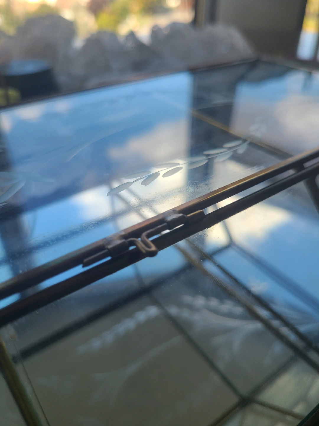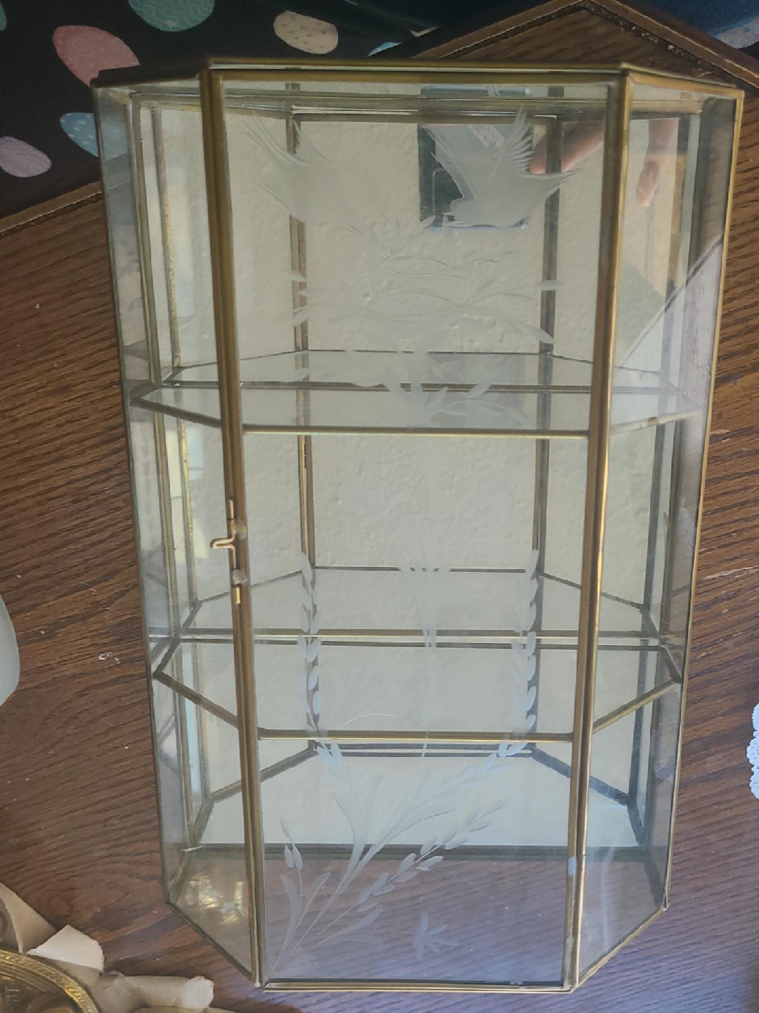 Selling a vintage curio cabinet with a glass and brass frame. It features etched floral and bird designs on the glass panels, adding a touch of elegance. Perfect for displaying your collectibles or small treasures!