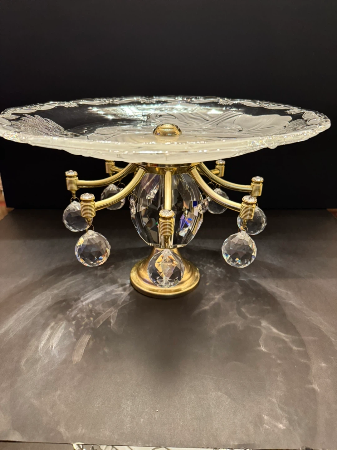 60Selling a beautiful vintage glass cake stand. It features a lovely religious motif etched into the glass, making it a unique piece for your kitchen or dining room. The stand has a gold-tone base with crystal accents, adding a touch of elegance. It's in great condition and ready to display your delicious cakes and desserts.High 9.5 inch,diameter 15 inch
