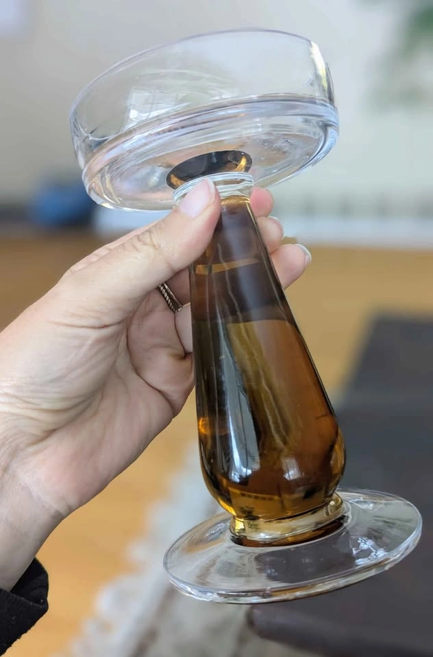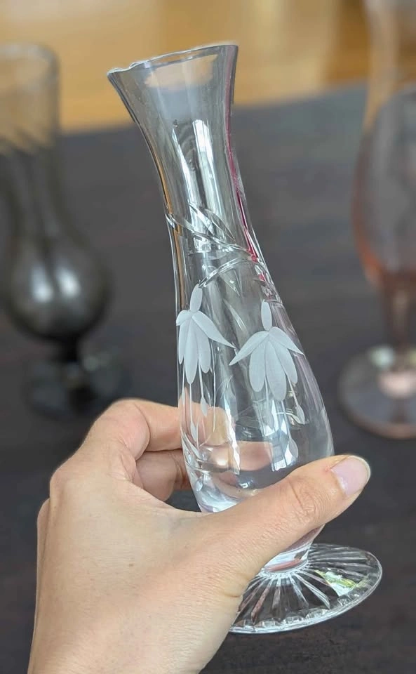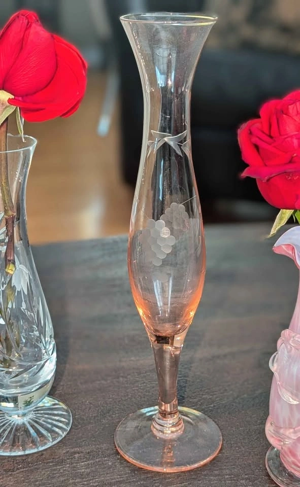 170A curated collection of beautiful vintage glass items – $20/each, firm Pickup 📍 Burlington 🕯️ 1️⃣ Amber Hand-Blown Candleholder – 6.25” Heavy and sculptural, with a thick amber stem and clear glass base/top. The balance and bubble inclusions suggest Murano-style craftsmanship (1950s–70s). Condition: Excellent vintage condition. 🌫️ 2️⃣ Smokey Gray Vase – 8” Elegant hand blown, tapered form with a twisted lattice design in smokey gray glass. Likely mid-century modern, possibly Scandinavian influence (Empoli or similar style). Condition: Excellent. ✨ 3️⃣ Stuart Crystal Bud Vase – 7.5” Genuine Stuart Crystal (England), etched signature on base. Floral motif, beautifully cut star foot. Fine lead crystal. Condition: Tiny nick on rim (barely noticeable). 🍑 4️⃣ Peach-Pink Etched Vase – 10” Tall and slender with etched grape motif and a faint pink hue. Possibly Bohemian or mid-century English glass. Elegant delicate but sturdy piece that catches light softly. Condition: Excellent. 🌷 5️⃣ Pink Ruffled Art Glass Vase – 6” Hand-blown pink-and-white spatter glass with applied handle and ruffled rim. Possibly Depression era or Fenton-style, collectible and charming. Condition: Excellent vintage condition.