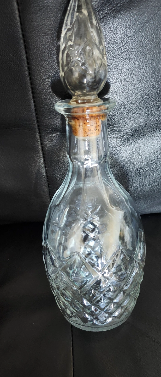 Selling a beautiful vintage glass decanter. It features a classic design with a decorative stopper. Perfect for adding a touch of elegance to your home bar or as a decorative piece