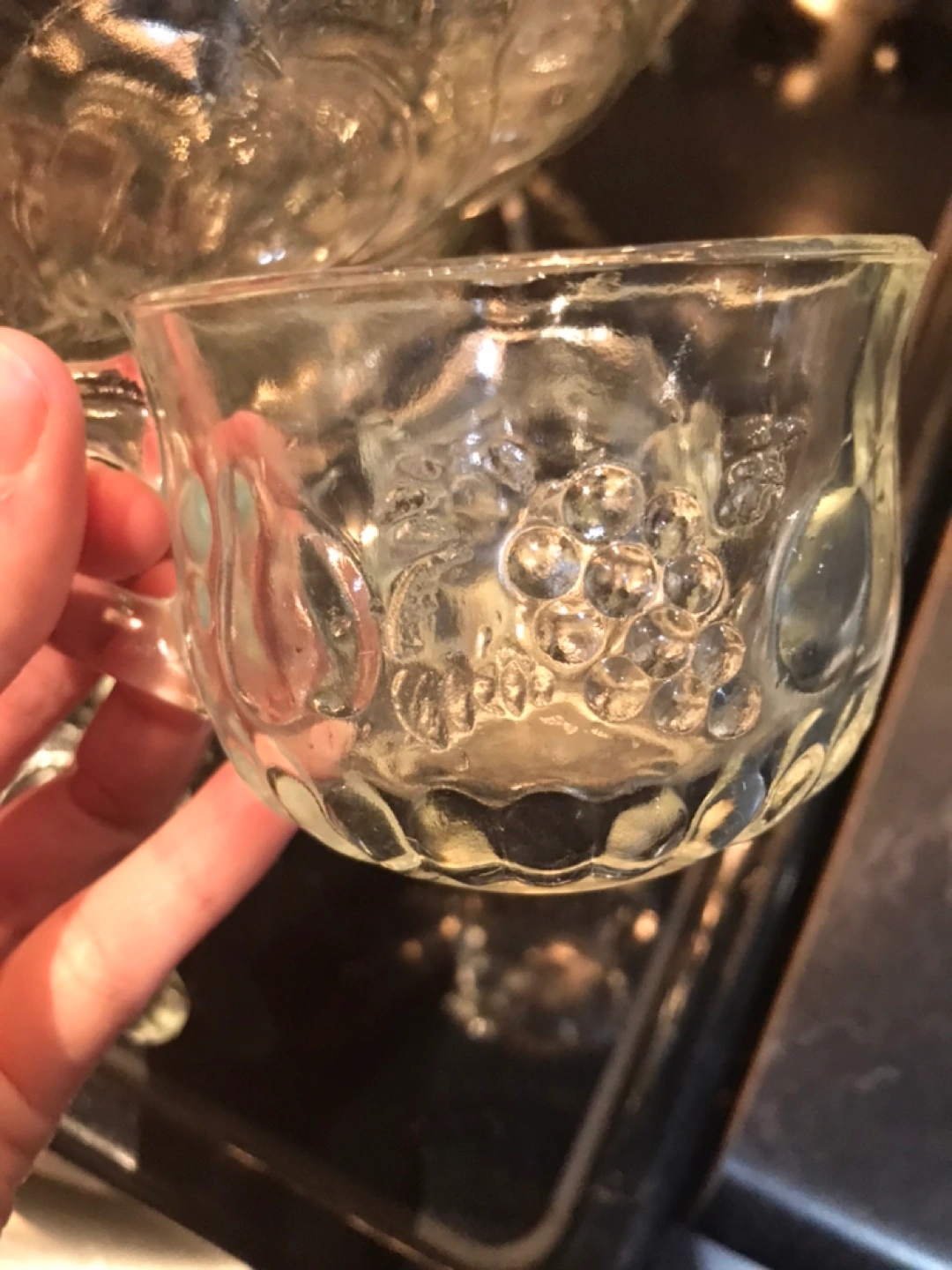 Vintage glass punch bowl with embossed grape design. Includes eight coordinating cups, also with grape design. Perfect for parties or entertaining.