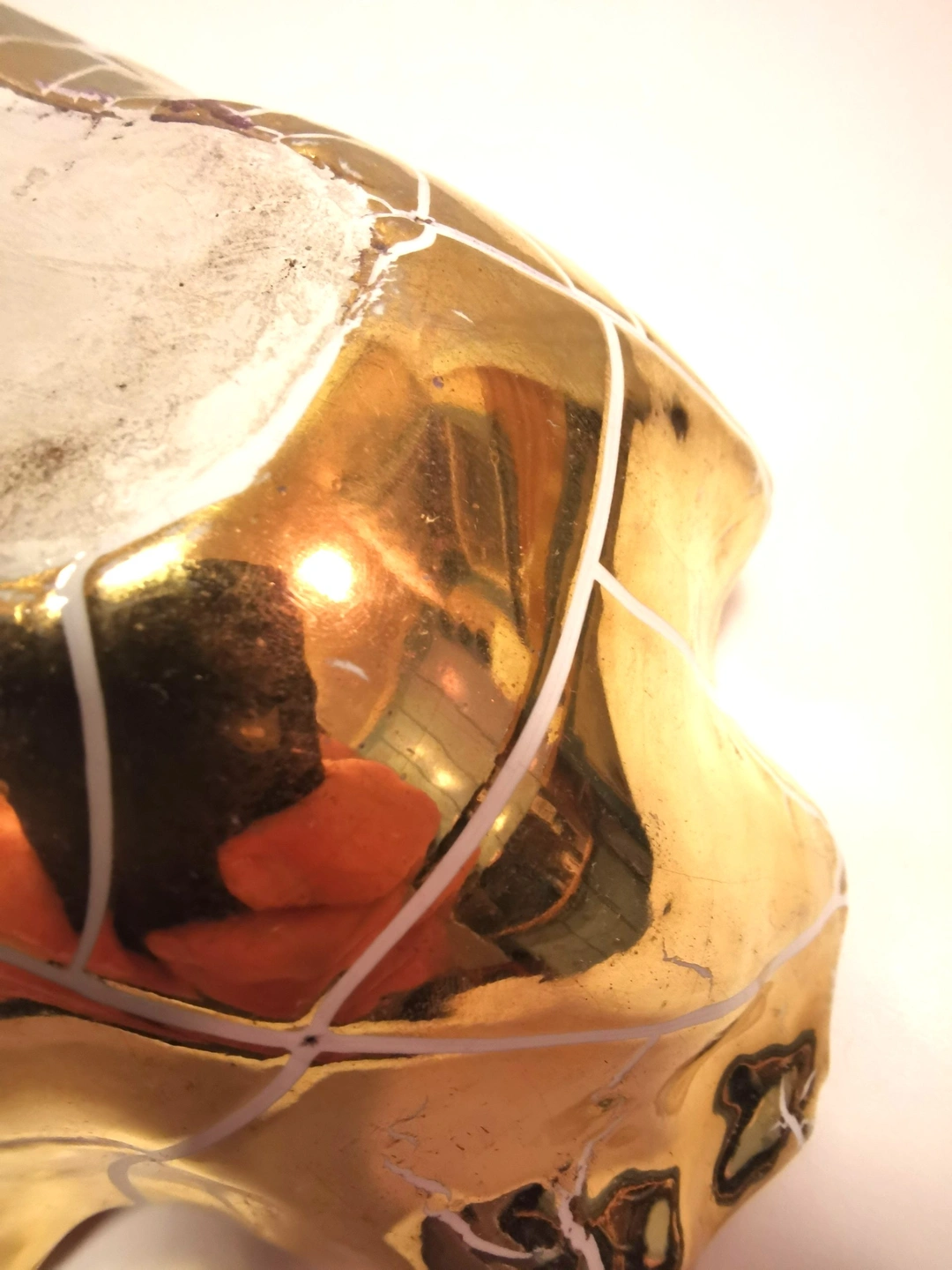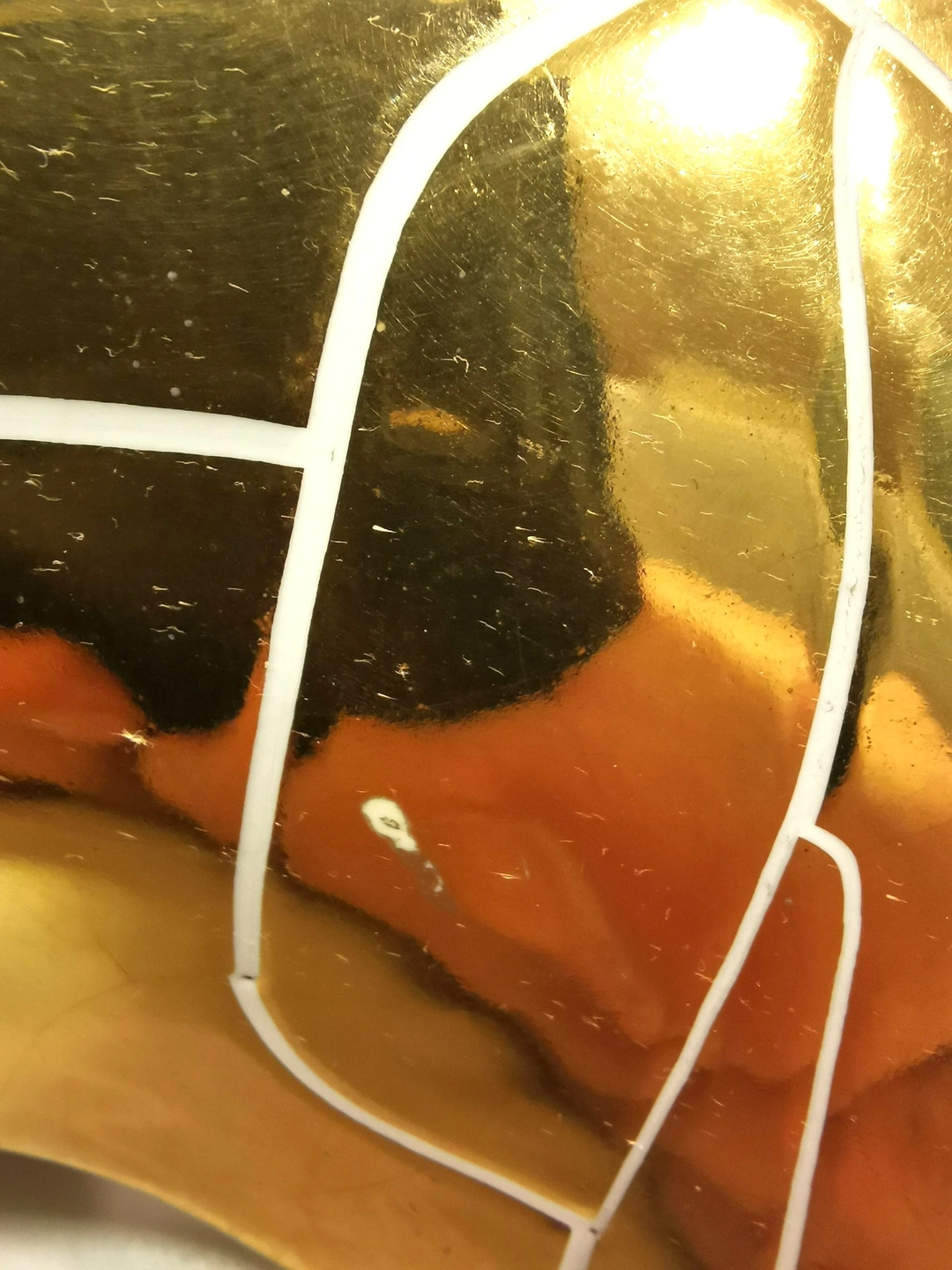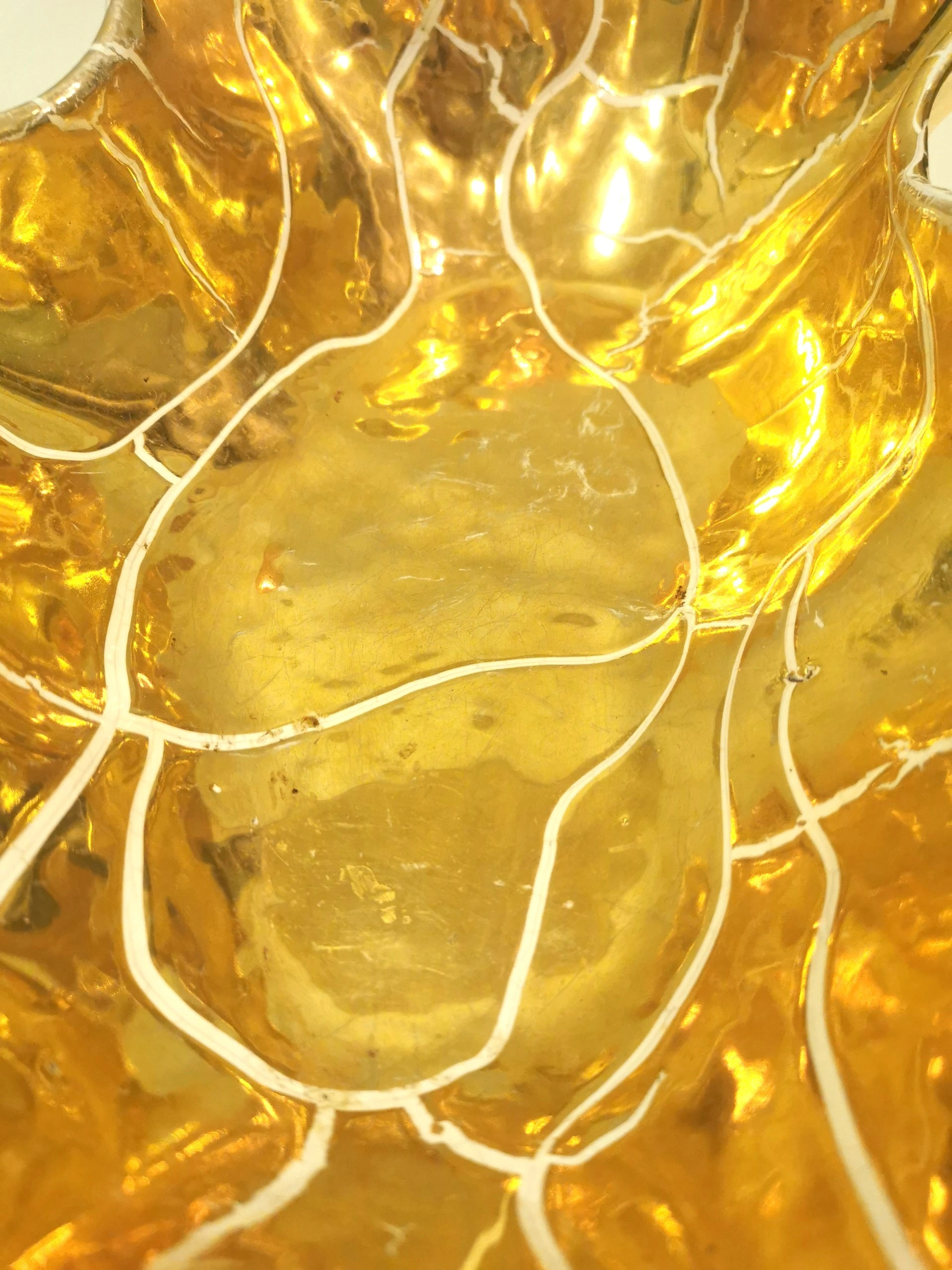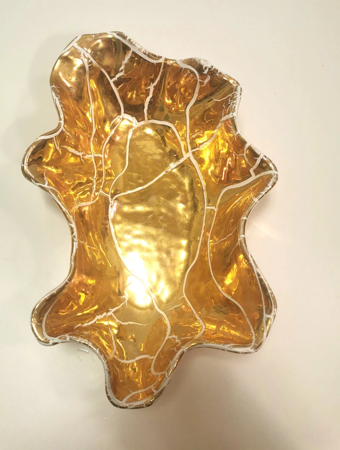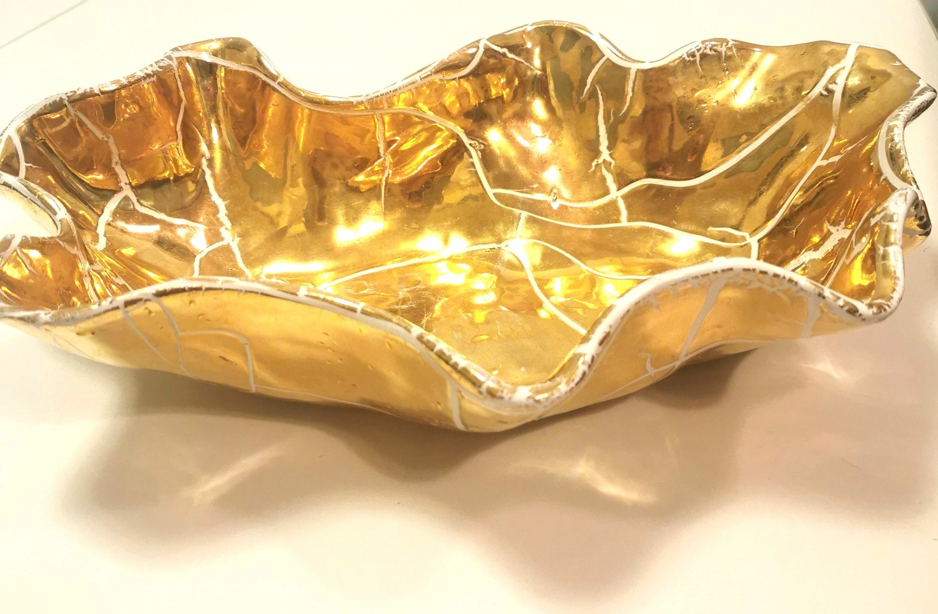 Stunning Vintage Mid-Century Gold Ruffled Decorative Bowl - Hollywood Regency Style Description: Add a touch of vintage glamour to your home with this exquisite mid-century decorative bowl. The piece features a brilliant gold metallic finish that catches the light beautifully, contrasted with a striking white crackle or "spiderweb" glaze on the interior. The free-form, ruffled edge gives it a wonderfully organic and artistic feel, making it a true statement piece. This bowl is a perfect example of the Hollywood Regency style, which emphasizes opulence and sophisticated design. It would make a stunning centerpiece on a coffee table, a chic catchall on an entryway console, or a beautiful display piece on a bookshelf. Possible Uses: Centerpiece Bowl Fruit Bowl (with a liner) Catchall for keys and mail Decorative Art Piece Style Notes: Mid-Century Modern Hollywood Regency Italian Art Pottery Style Condition: Good vintage condition some small chlps as to be expected with an item from the 60s. Please reference photos as they are part of the description. Approximate Dimensions: Length: 14 inches Width 9.5 inches Height: 3.25 inches This is a fantastic opportunity to own a beautiful piece of vintage decor that is both timeless and very much in trend. Don't miss out! Condition: Good vintage condition a couple of small chips please referene photos as they are part of the description.
