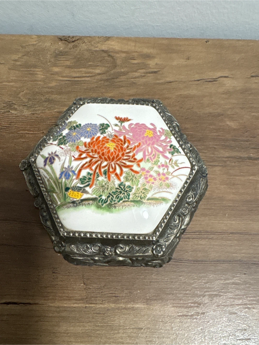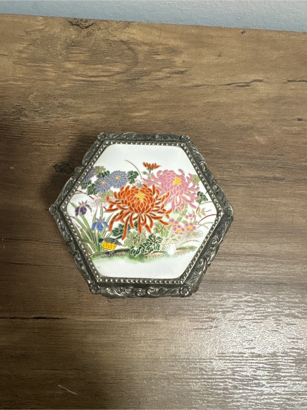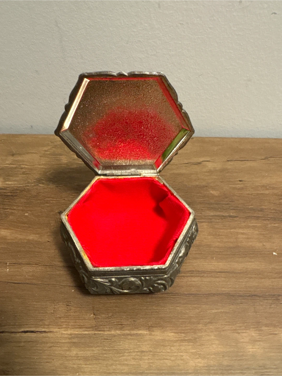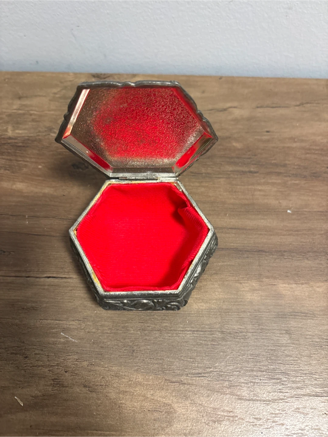 Selling a cute floral trinket box! It's hexagon-shaped with a silver-tone metal frame and a hinged lid. The inside is lined with red felt. Perfect for storing jewelry or small keepsakes