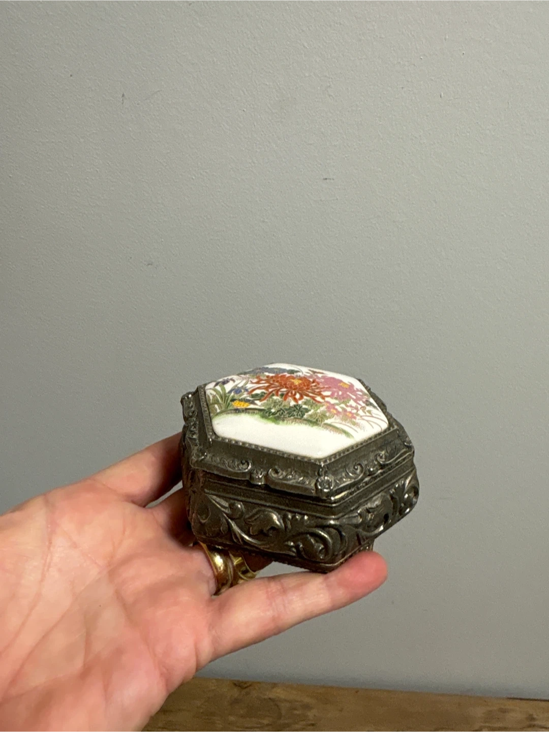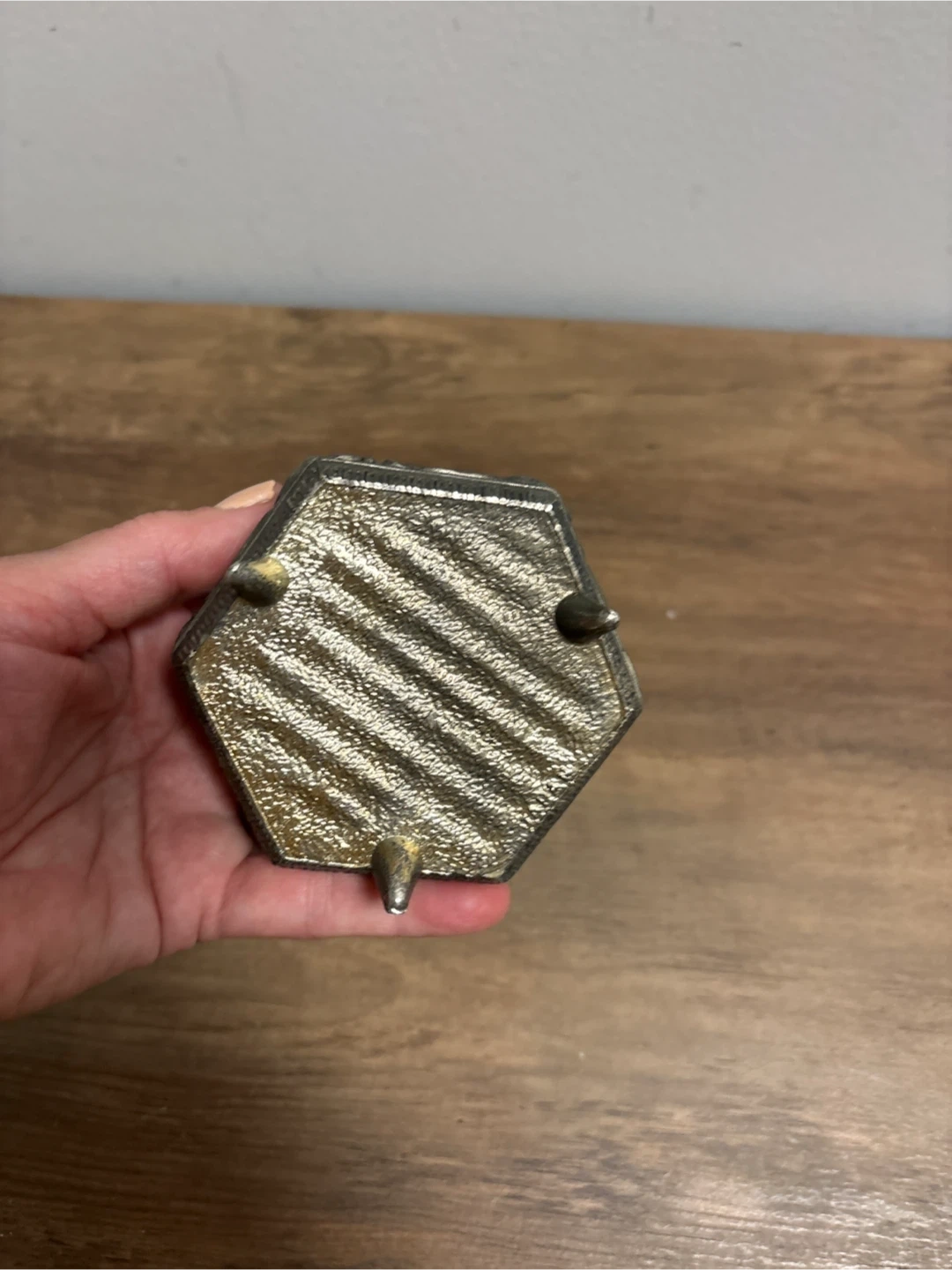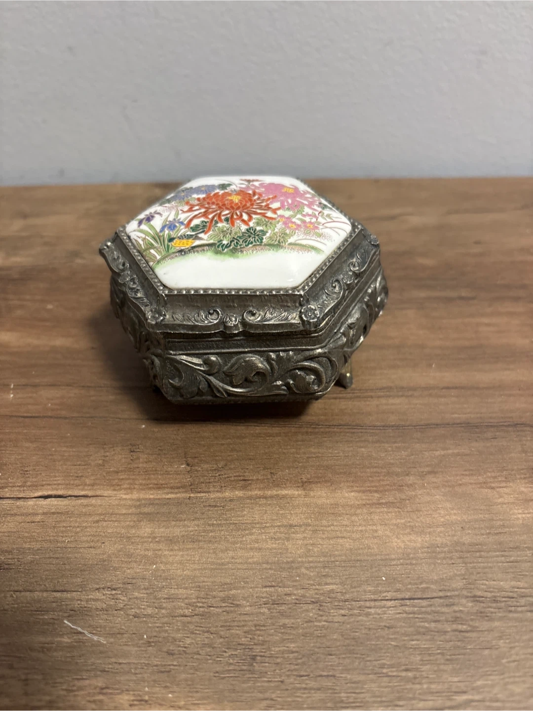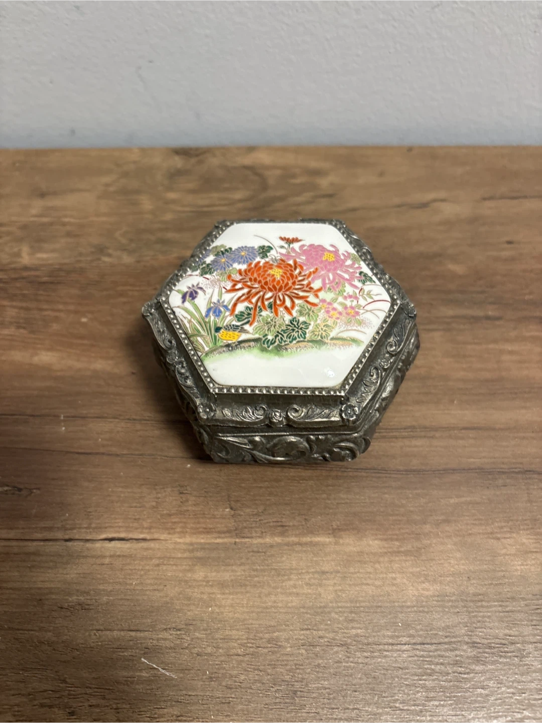 Selling a cute floral trinket box! It's hexagon-shaped with a silver-tone metal frame and a hinged lid. The inside is lined with red felt. Perfect for storing jewelry or small keepsakes