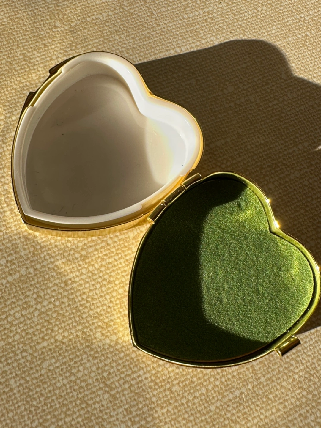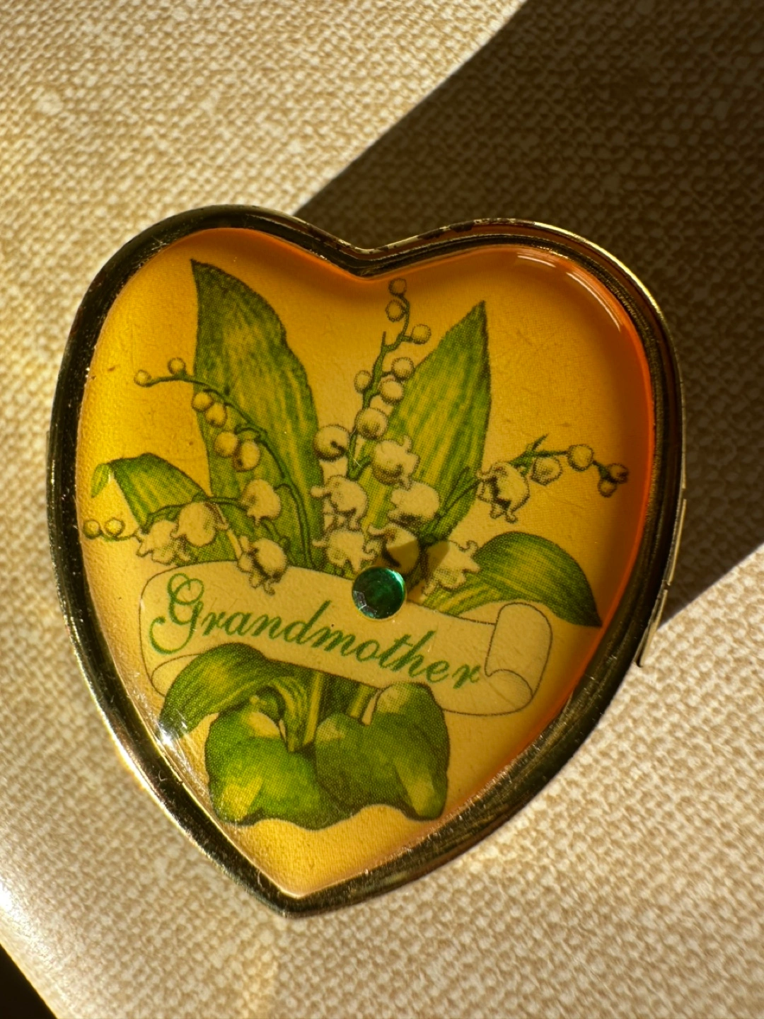 A sweet little heart-shaped trinket box! It's perfect for storing medicine π.,, small treasures or jewelry. The inside is lined with a lovely green velvet, and the lid has a charming floral design with "Grandmother" written on a banner. It's in great condition and ready for a new home. From an estate sale in an old citizen house Self Pickup at Coquitlam Parkways Blvd
