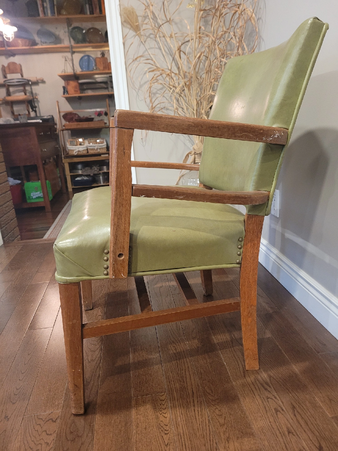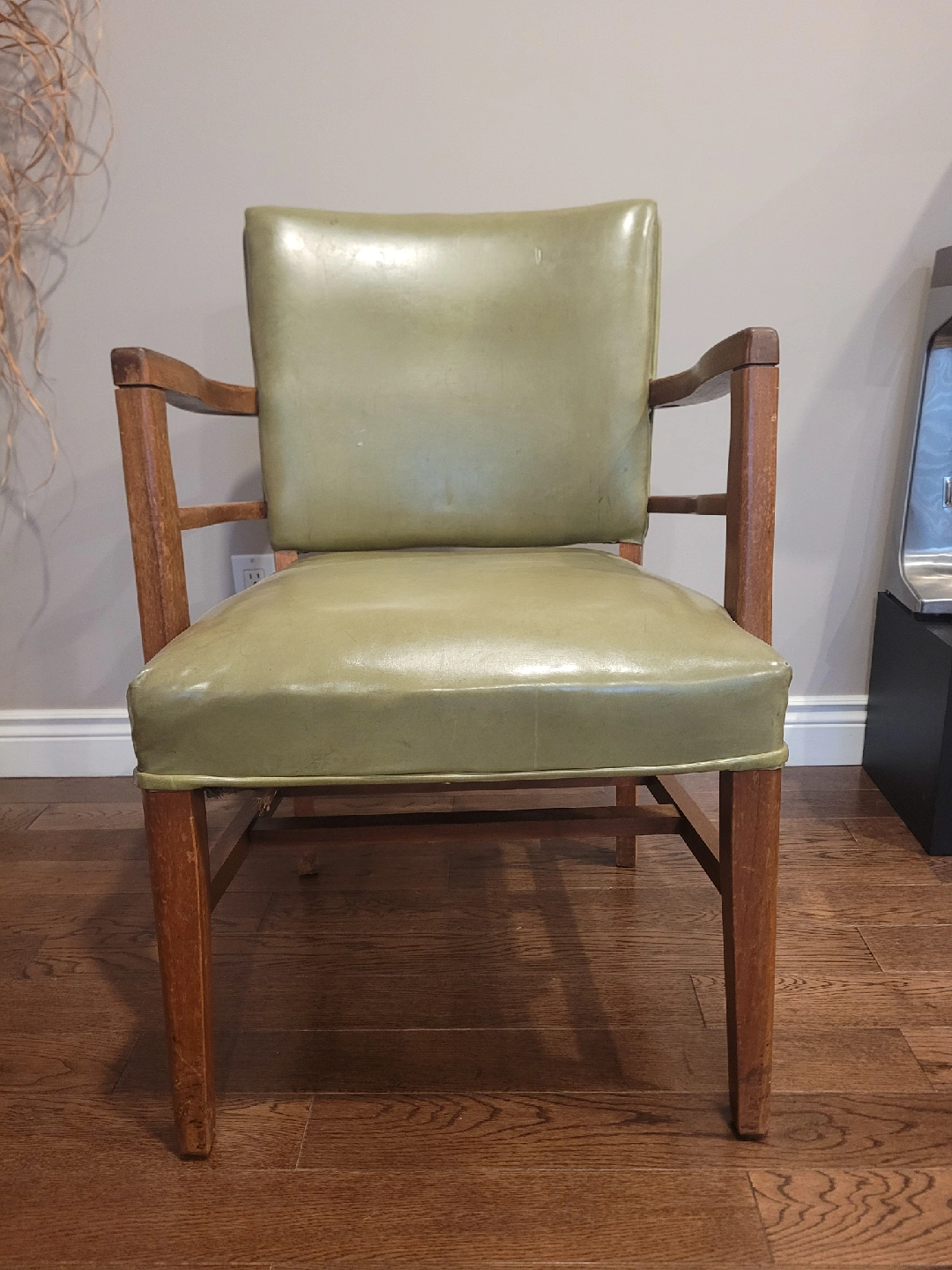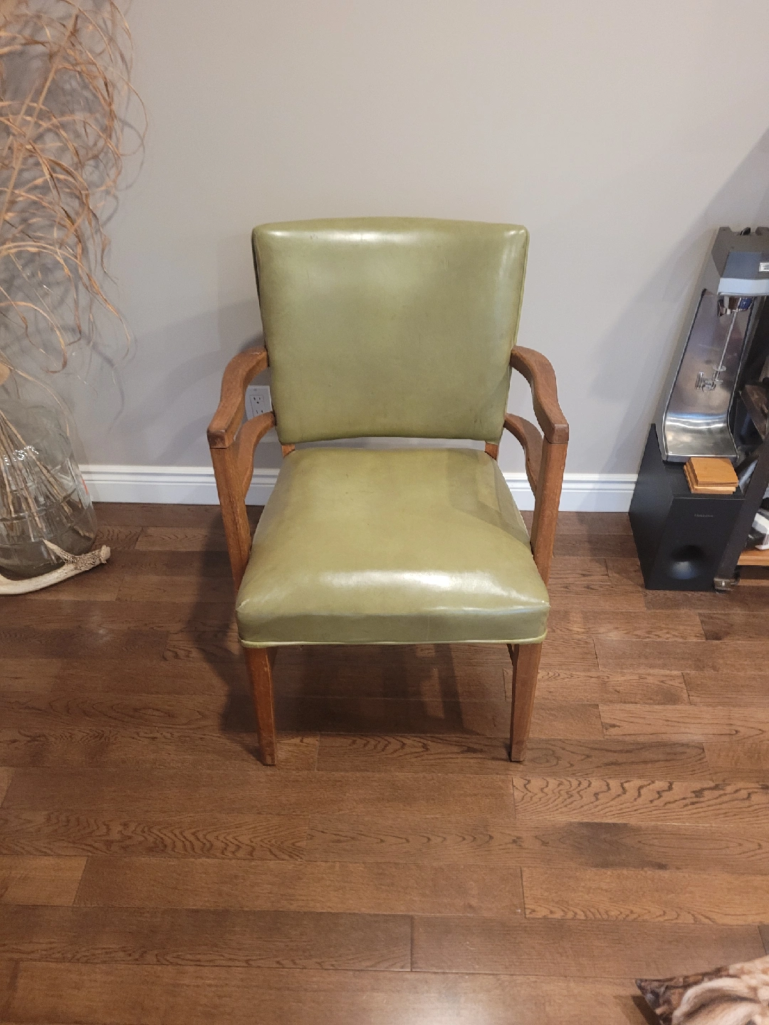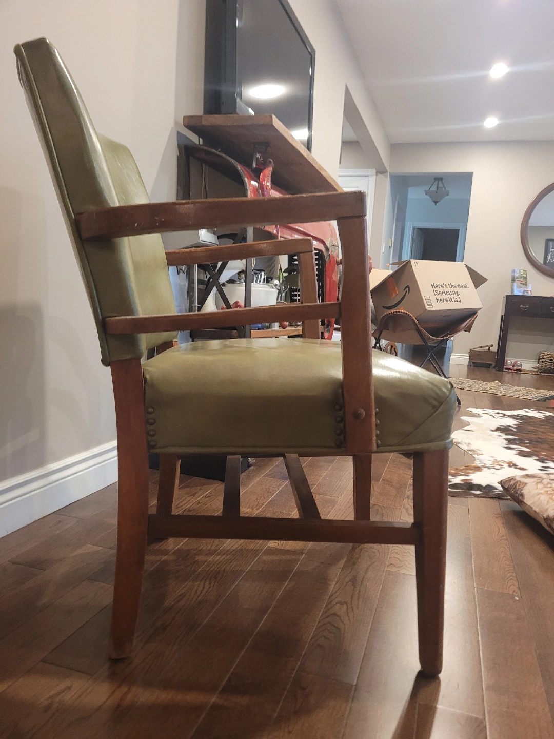 65Selling a vintage armchair with a unique green colour. It has a wooden frame and a comfortable seat. Perfect for adding a touch of retro charm to your home!