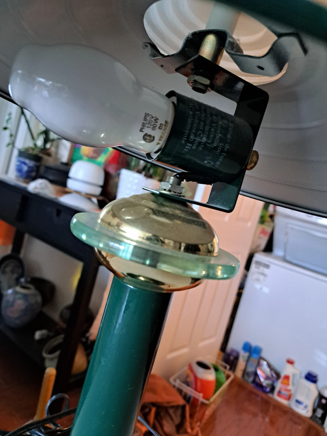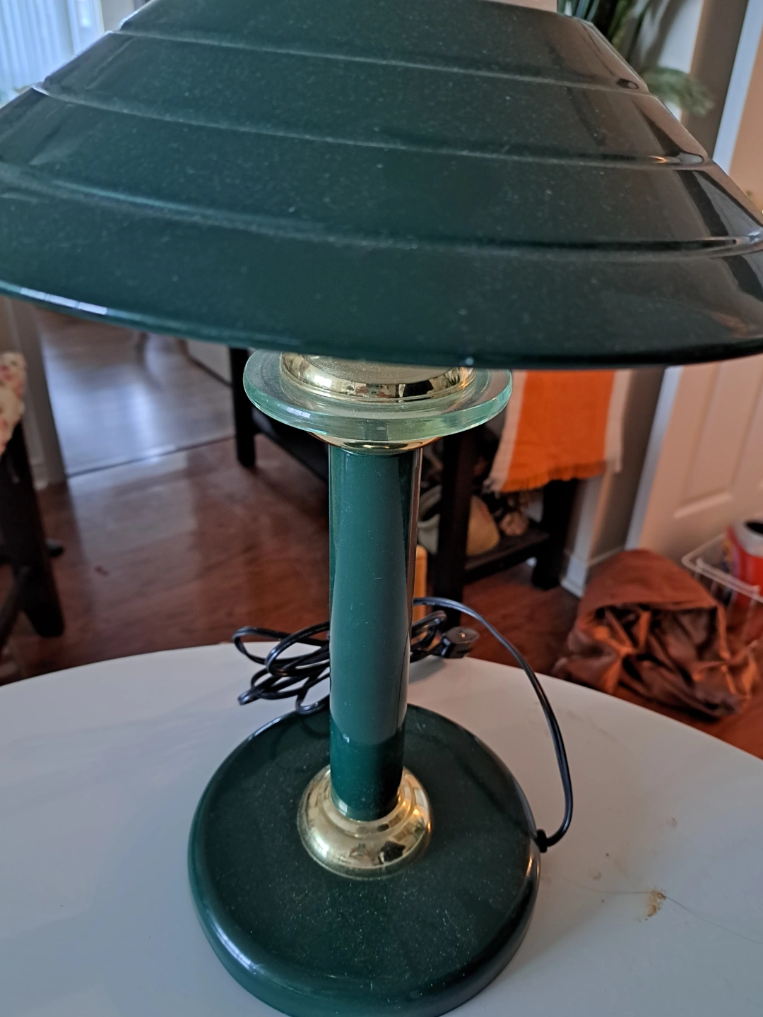 28Dark green table lamp. Features a ribbed, conical shade and a glass accent on the body. Brass coloured base and accents. Includes a Philips bulb.